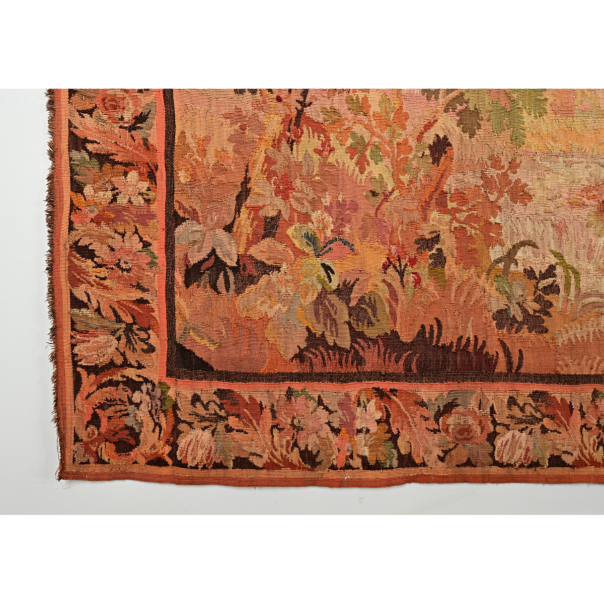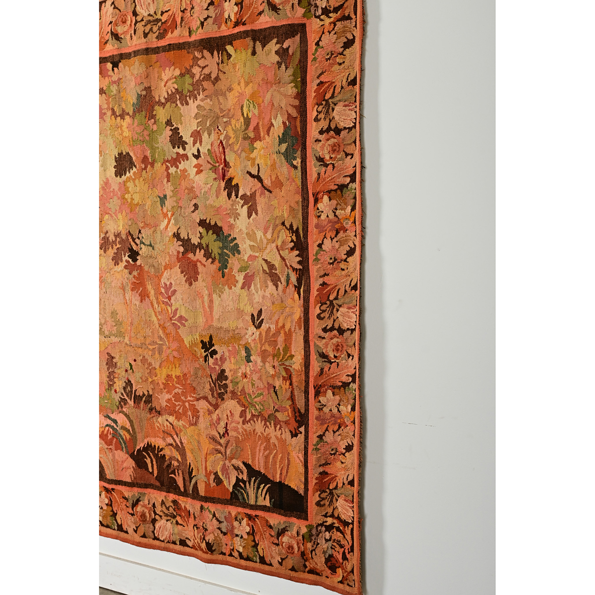 An outstanding French 18th Century verdure tapestry depicting a riparian forest scene. Done in autumnal colors of burnt oranges, golds, browns, reds and greens, this stunning woven textile would have an enormous impact on your room or space. Impressively sized, it would envelop your wall in a wooded wonderland. A meandering stream is central to the scene, with a small waterfall seen in the foreground. A pair of birds can be spotted in the trees, keeping a watchful eye on their forest domain. The tapestry is bordered in a twisted repeat of floral and foliate details with styled flourishes in the corners. Take some time to view the detailed images to see the current condition of the tapestry and wonder at its artistry and finer points.