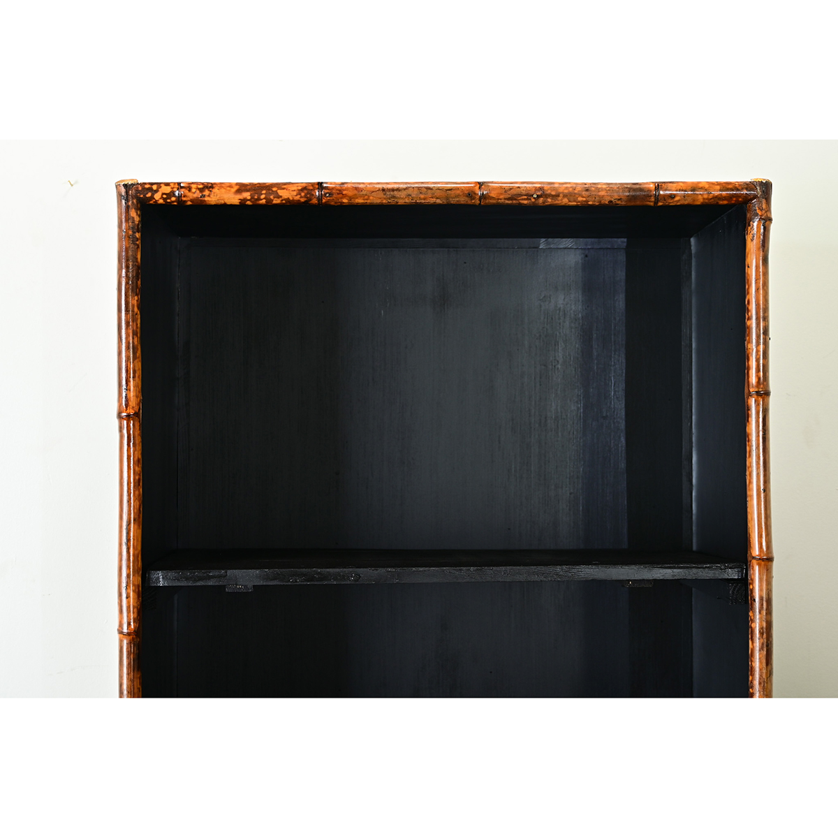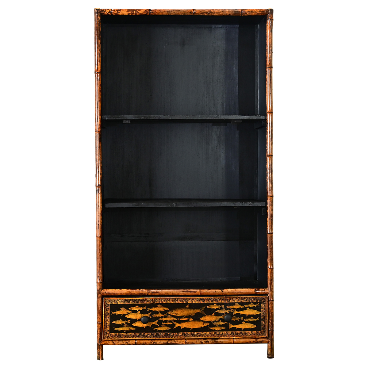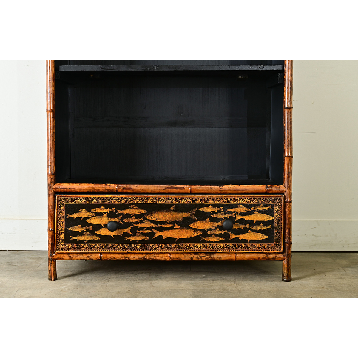 This English bamboo bookcase from the Aesthetic Movement of the late 1800s was given a creative update with recent decoupage and painted ebony finish. Schools of fish animate the exterior surfaces, their glowing honey color is a perfect match to the natural tone of the bamboo frame. Two fixed shelves with ebonized (painted) interior are an exciting backdrop for collectibles and curiosities in addition to books. The bottom drawer opens by turned-wood pulls for easy operation. Please view the detailed images of this on-of-a-kind bibliotheque.
