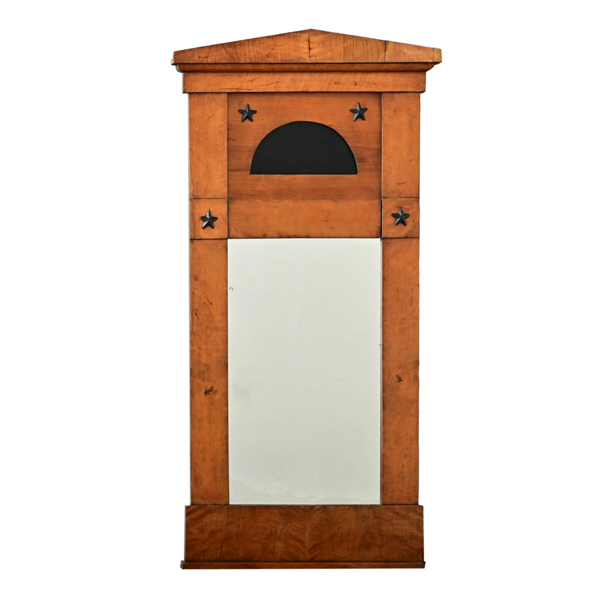 A fantastic Biedermeier period trumeau mirror from France, 19th century, made of birch wood and ebonized details around the original mirror plate. The architectural-inspired shape is crowned with a low, pitched roofline framing a central panel with ebonized semicircle dotted with pairs of tole stars (also painted black) above and below. The original mirror glass is characterized by the mesmerizing texture of waves and tiny bubbles, partially obscuring the reflection but complementary to the excitement in the waves of the birch frame. Strung with cord on the back, ready to hang in your interior. Please view the detailed images to see more of this exceptional Biedermeier trumeau.