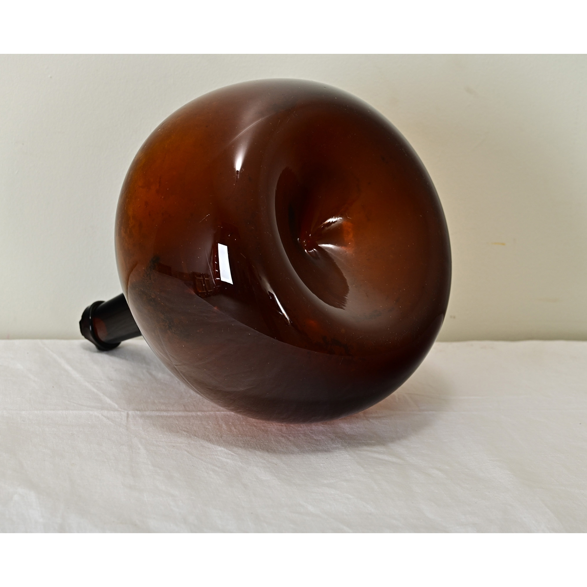 A beautiful, dark amber glass wine keg, or demijohn as they are also called, having a bulbous form and short neck. Originally used for storing wine and other liquids, demijohns make great decorative accessories in the home for their colors and shapes, or used as vases to complement greenery and dried flowers. Rolling of the hot sphere of glass creates the swirls and sometimes bubbles that give these antique vessels their charm & personality. Take a closer look at the detailed images to explore the subtle variations that make each one so unique.