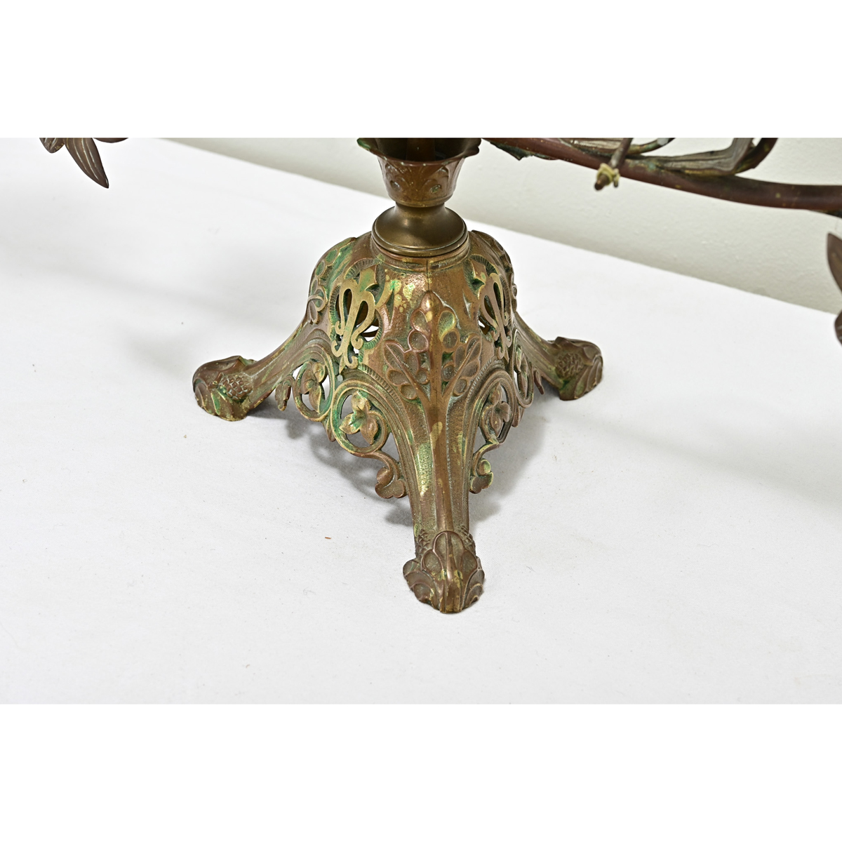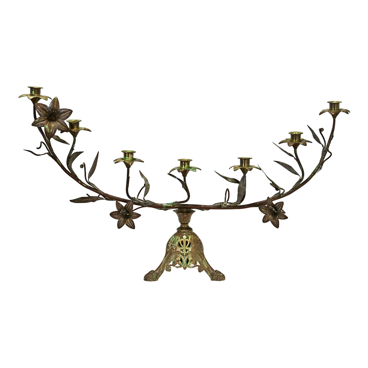 A large French seven light gilt brass candelabra dating to the late 1800’s with transitional Art Nouveau decorative elements of floral/foliate imagery. This whimsical fixture would have been designed for a church, using seven candle cups shaped to look like gilt bronze flowers blooming on a curved frame. The tripod base has three legs with stylized religious motifs, leaves, and berries. Patina consistent with age and use including areas of verdigris and oxidation. Please view all the detailed images to see the current condition.