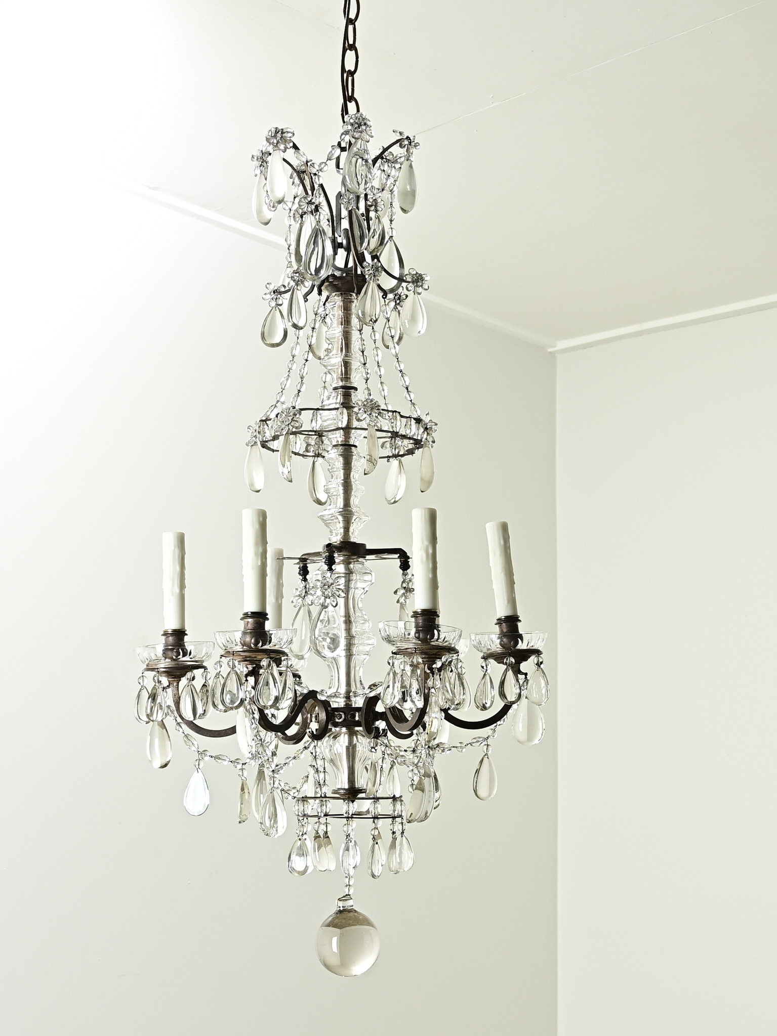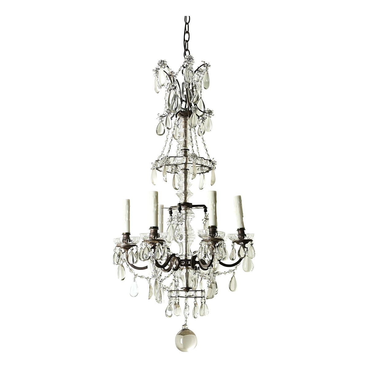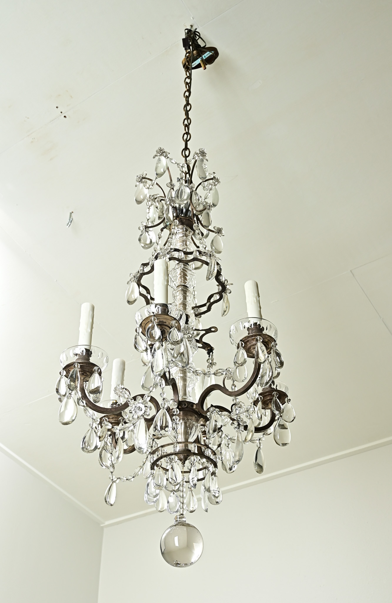 An impressive French six-light brass and crystal chandelier from the 1800s. This chandelier has a dark brass frame with cut crystal drops and six curved chandelier arms with faux wax candle covers. You’ll find playful patterns of cut crystal teardrops, rosettes, and beaded chains draped throughout the whimsical curves of this chandelier. This fixture has been recently wired for US electrical using UL listed parts and is ready to be hung in your interior. Be sure to view the detailed images to see the current condition.