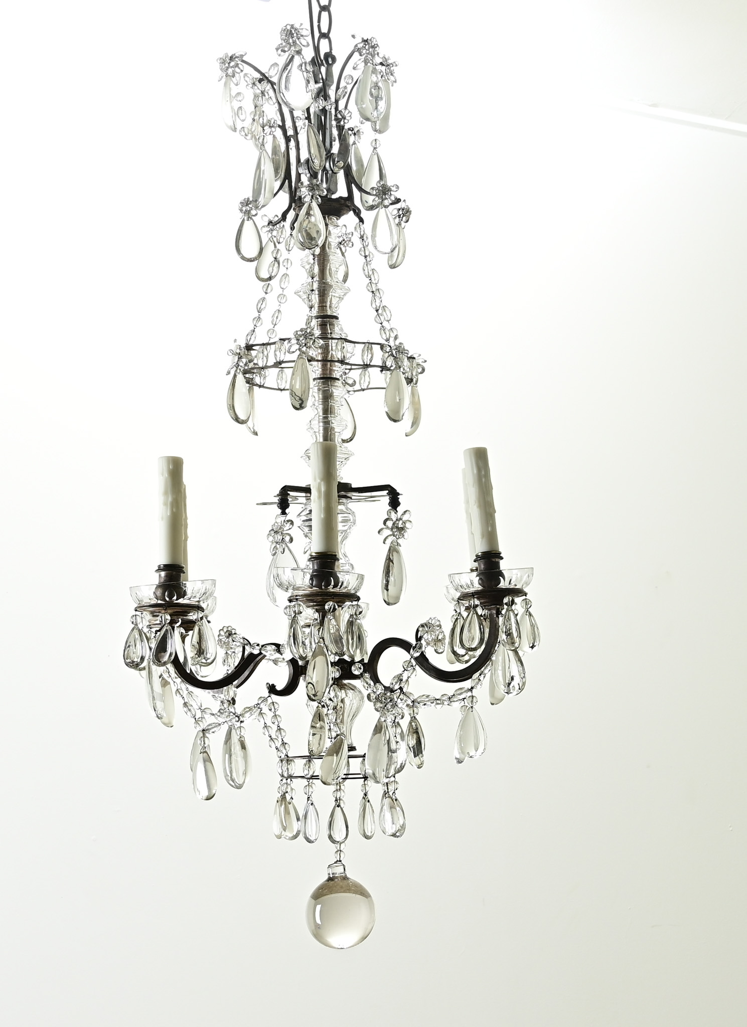 A charming 19th century French bronze and crystal chandelier to illuminate your space with a touch of Bohemian or Belle Époque flair. This petite chandelier has a multi-tiered dark bronze frame that is dripping with pendalogues, prisms, and rosettes in a mix of clear and amethyst-tone drops for wonderful variety. Three faux candles (using candelabra-base bulbs) rise from solid bobeche cast to appear like flowers, accented with little star-shaped rosettes on the front. The fixture has been professionally cleaned and rewired for US electrical using UL-listed parts and is ready to be hung in your interior. Be sure to view the detailed images to see more.