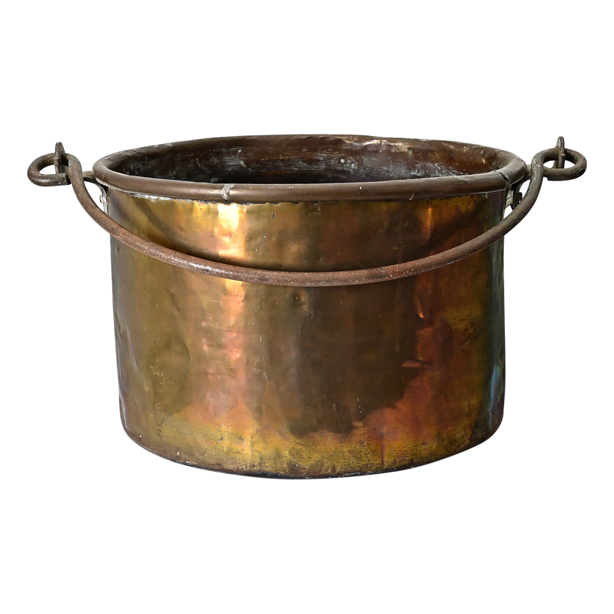 An antique French copper cooking pot with a forged iron carrying handle for suspending over the fire, dating to the second half of the 19th century. The exterior has a beautiful patina, darkened and textured by time and use–accented with blooms of turquoise verdigris. Look closely to see the incredible skill required in joining the iron belt & swing handle to the copper cauldron. The substantial pot could be used for an attractive catchall around the home and hearth, as a planter, or simply to admire this culinary relic–its aged finish will only improve with time. Please view the detailed images.