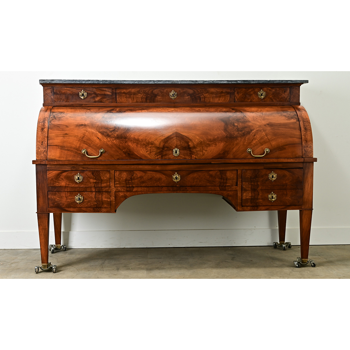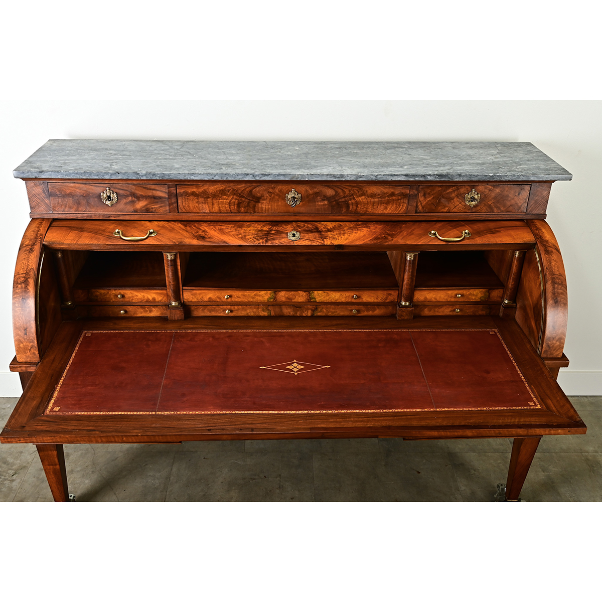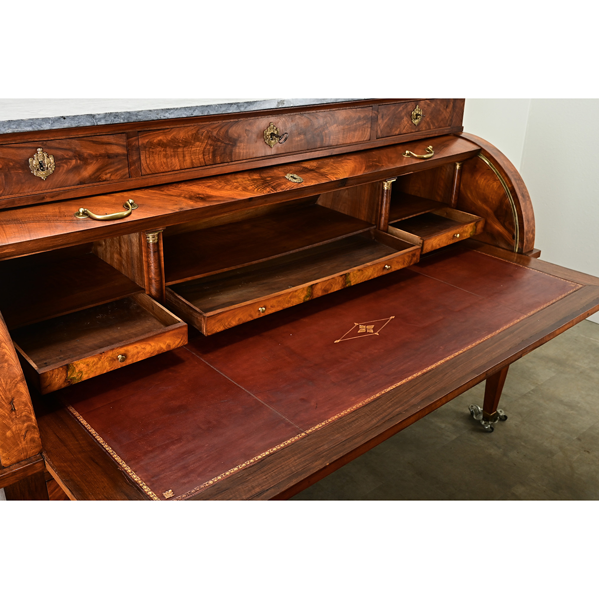 A stately French Directoire roll top secretary. This massive desk is over six feet long and four feet tall with a grey marble top. Directly beneath the marble are three drawers with beautiful bookmatched burl walnut drawer fronts. The drawers open with a working lock and key through brass rooster escutcheon plates. The D-shaped roll top is quite impressive with its burl bookmatched design, brass handles, and brass swan escutcheon plate with its own lock and key. The top opens to a fitted interior including three open cavities, three drawers and two spring loaded hidden compartments. The leather top writing surface extends forward making the total depth of the desk 42 ½”D. The main writing surface is 29”H x 67 ½”W x 26”D. There are two leather top slides that slide out from each end. Below the center writing surface you’ll find a center drawer, two stacked drawers on the left side, and a single double stacked drawer on the right. The interior of the right drawer is fitted, including a hinged top compartment. One key is used to work the left and right drawers, while another key is used for the center drawer, all with brass rooster escutcheon plates. Four total keys are included. This secretary is supported with squared off tapered legs ending in brass sabots. Cleaned and polished, this antique is ready for your immediate use. View all the detailed images to see the current condition.