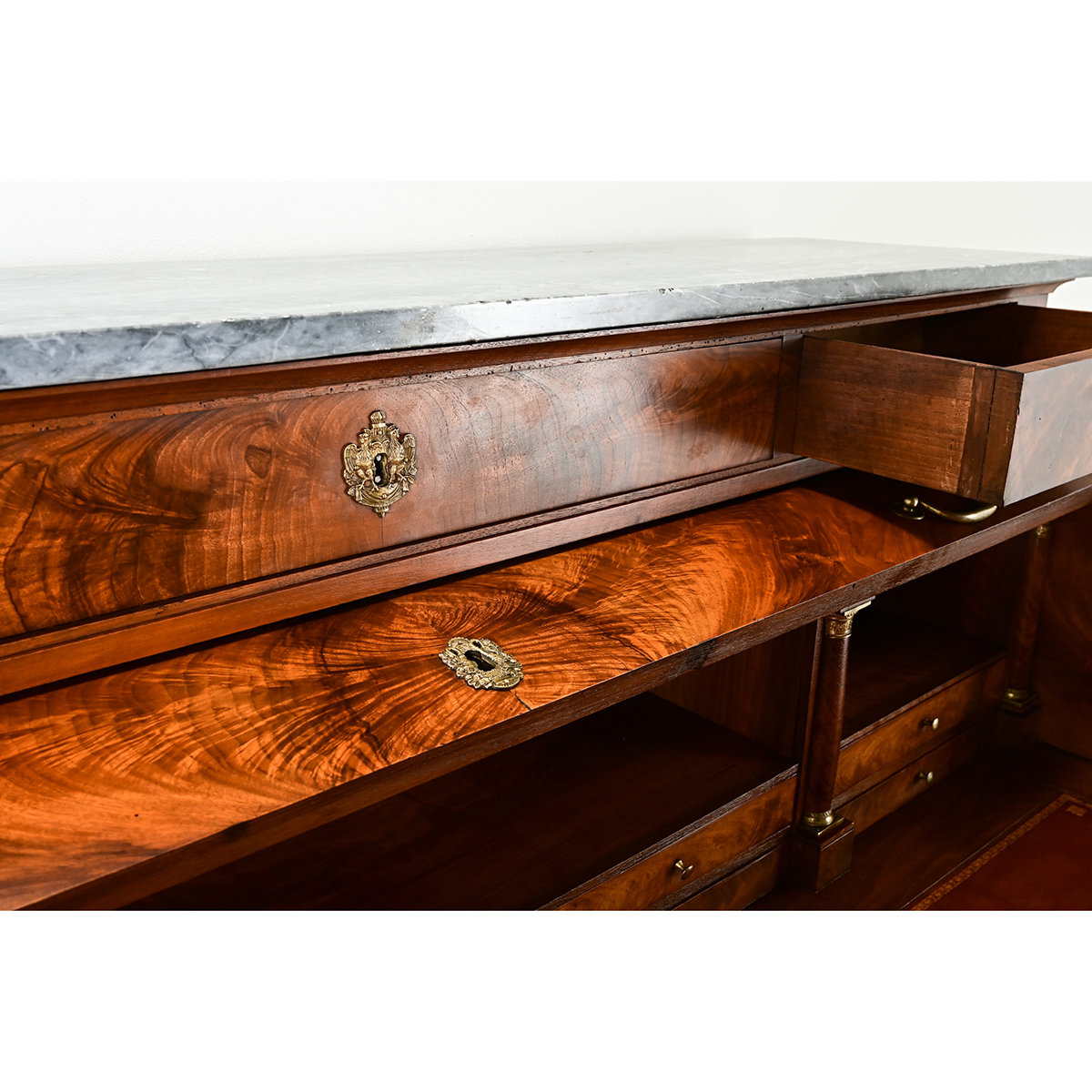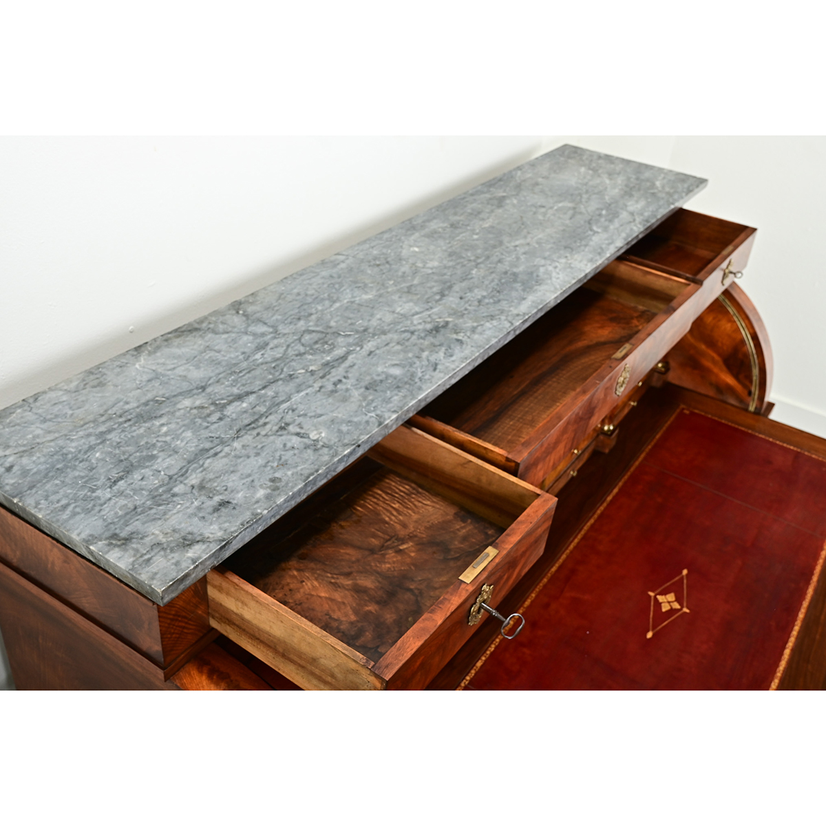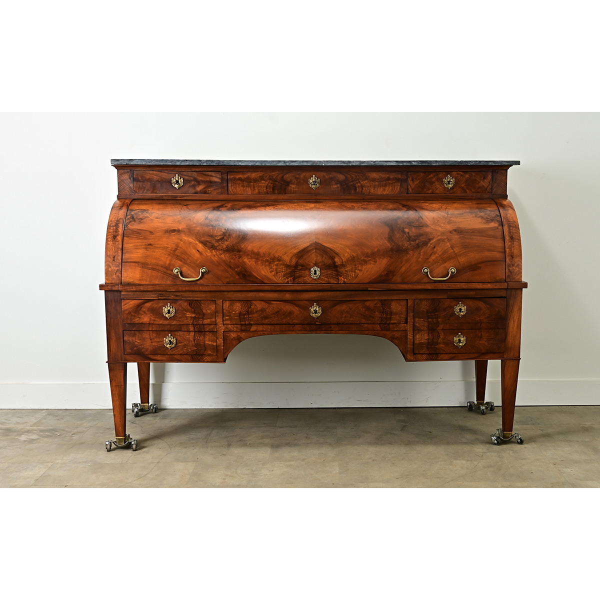 A stately French Directoire roll top secretary. This massive desk is over six feet long and four feet tall with a grey marble top. Directly beneath the marble are three drawers with beautiful bookmatched burl walnut drawer fronts. The drawers open with a working lock and key through brass rooster escutcheon plates. The D-shaped roll top is quite impressive with its burl bookmatched design, brass handles, and brass swan escutcheon plate with its own lock and key. The top opens to a fitted interior including three open cavities, three drawers and two spring loaded hidden compartments. The leather top writing surface extends forward making the total depth of the desk 42 ½”D. The main writing surface is 29”H x 67 ½”W x 26”D. There are two leather top slides that slide out from each end. Below the center writing surface you’ll find a center drawer, two stacked drawers on the left side, and a single double stacked drawer on the right. The interior of the right drawer is fitted, including a hinged top compartment. One key is used to work the left and right drawers, while another key is used for the center drawer, all with brass rooster escutcheon plates. Four total keys are included. This secretary is supported with squared off tapered legs ending in brass sabots. Cleaned and polished, this antique is ready for your immediate use. View all the detailed images to see the current condition.