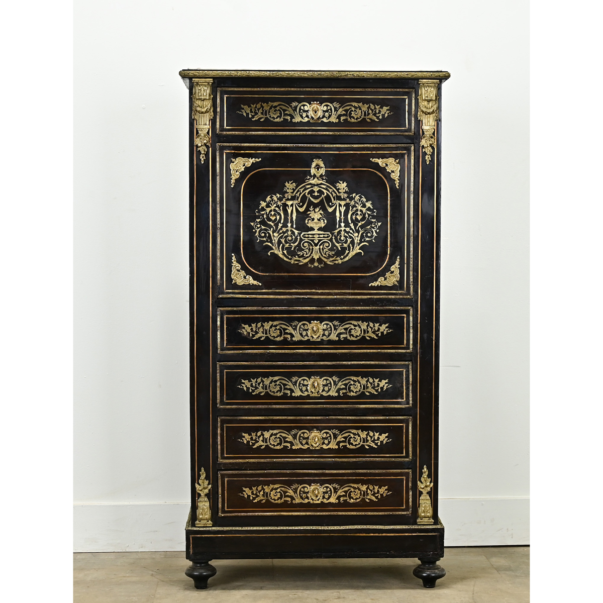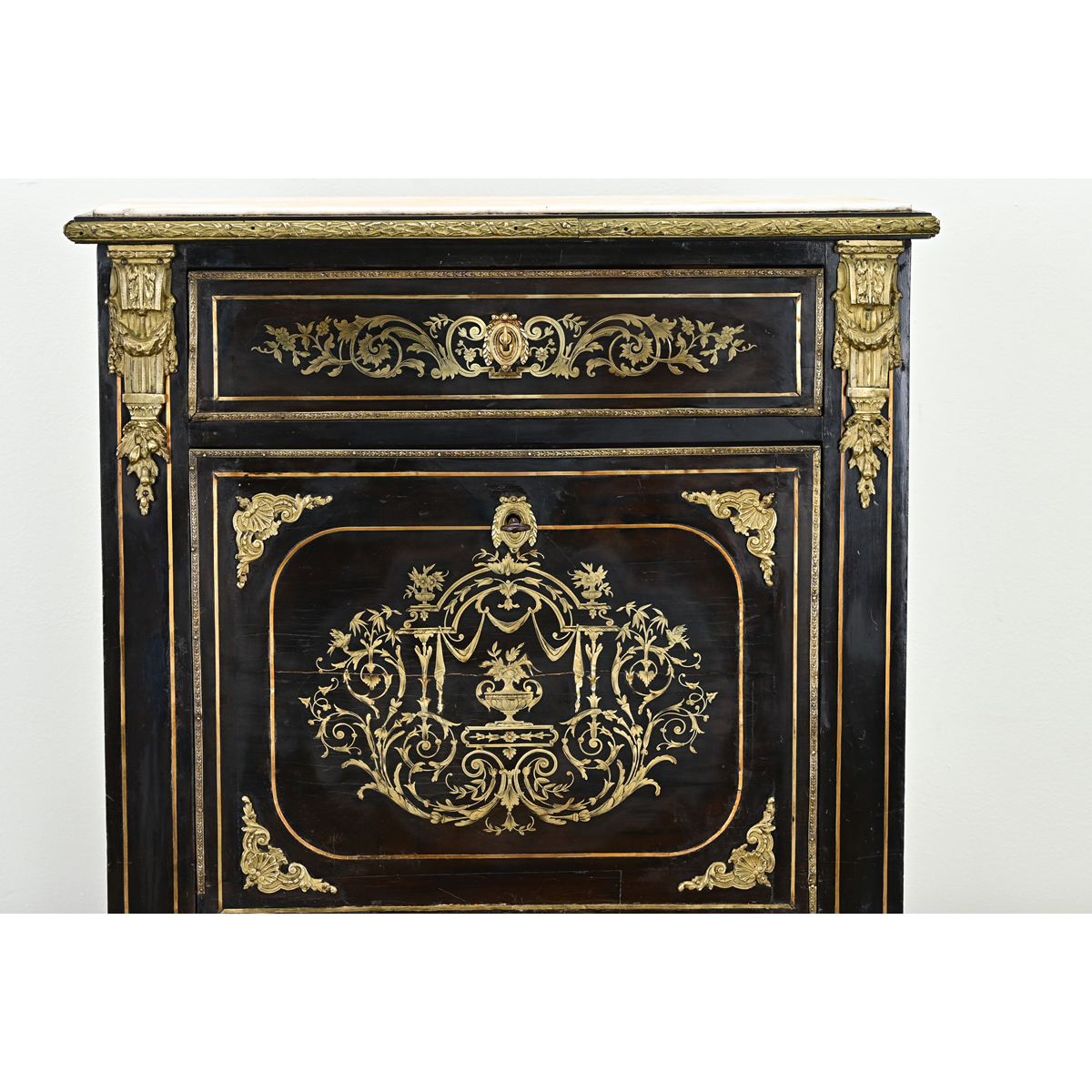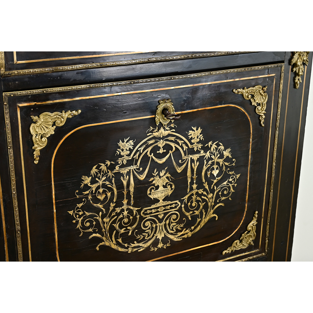This French Louis XVI style drop front secretary from the 1800s has impressive etched brass inlay on its exterior, which is made even more dramatic by the deep ebonized finish. The top has its original inset white marble top (repaired) surrounded in brass trim. A single drawer is fitted with three sections above the drop-front door that becomes the desk’s felt top writing surface. Inside the desk are two open shelves and two burl mahogany drawers for organizing to your needs, secured by functioning lock and key. Below the desk you’ll find four additional drawers. Cast gilt bronze ormolu is found at the top corners and base of this stylized cabinet. All five of the drawers have faux keys installed to be used as drawer pulls. Cleaned and tightened, ready for your interior. View all the detailed images to see the details and current condition of this petite desk.