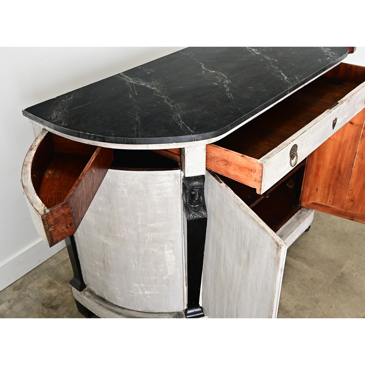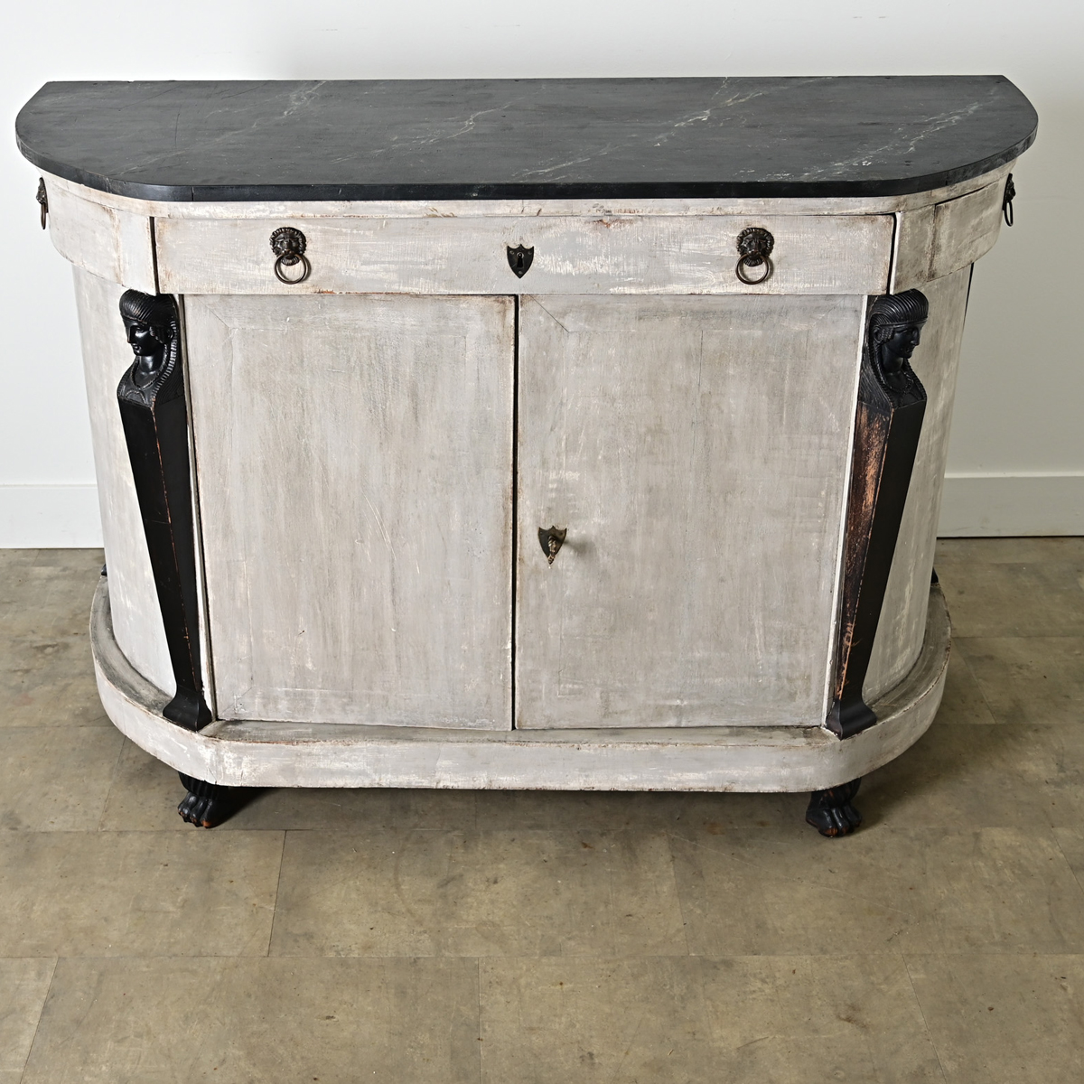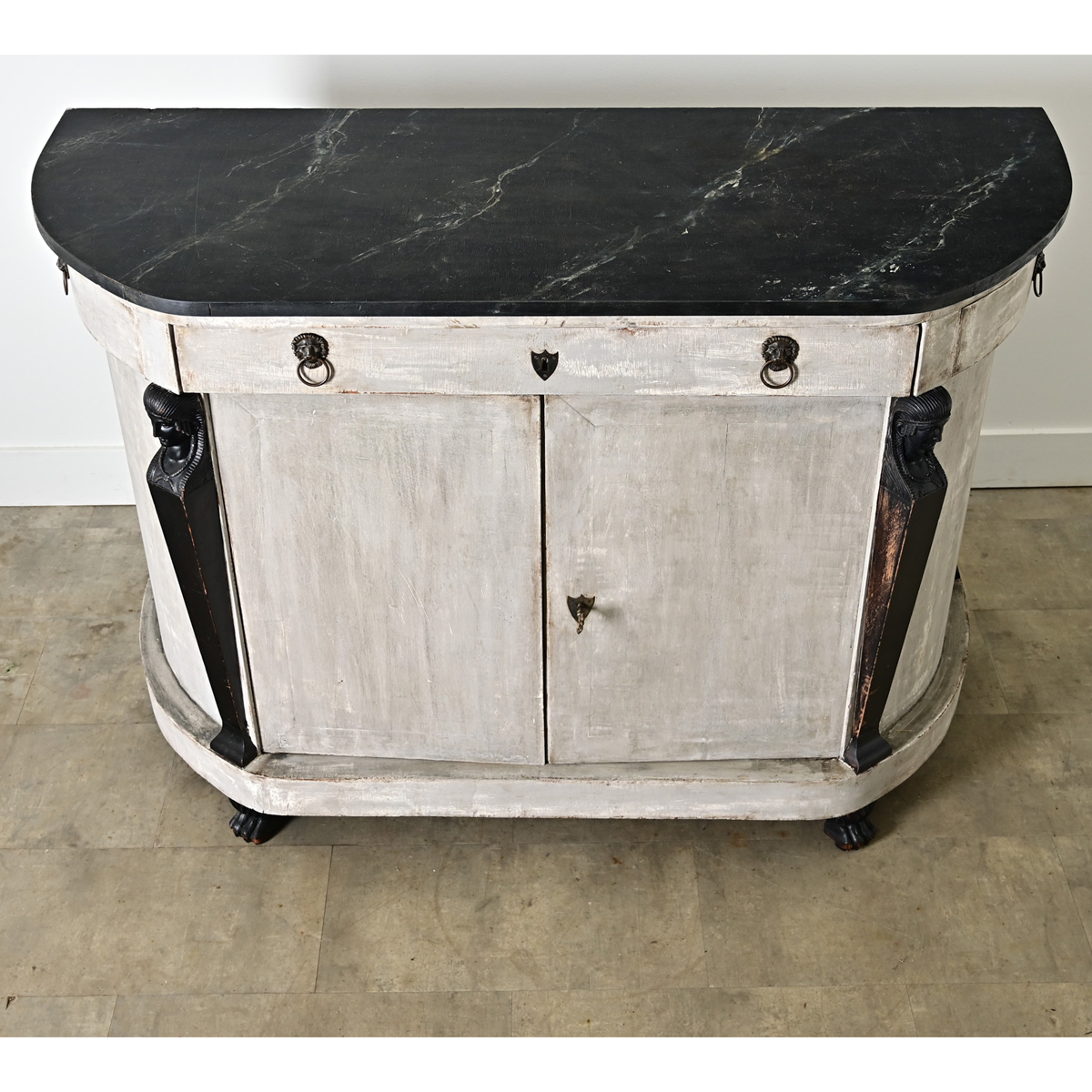 A very unique French Empire 19th century buffet, or desserte server, in demilune profile and more recent painted finish of uncertain age. The top surface is a handpainted faux marble that is nearly all black except for delicate wisps of smoky gray veining. In the frieze are three drawers: one in each corner that swings outward at an angle, and one wide drawer in the center, all using lion-motif ring pulls. The case is washed in an ethereal tone of French gray with matte texture and mottled variation blending streaks of white, gray, and blue pigment that might easily blend with Directoire or Gustavian tastes more than the opulence of Empire. Carved wood caryatids in ebonized (painted) effect flank the pair of doors at center, which open in tandem by working lock and key. Inside the case are two shelves at different depths that could be perfect to use this case piece as a dry bar or dining room storage. The caryatids terminate at the floor as robust, pawed feet, while the ebonized pilasters toward the back are undecorated. Please view the detailed images to see more of this inspired buffet.