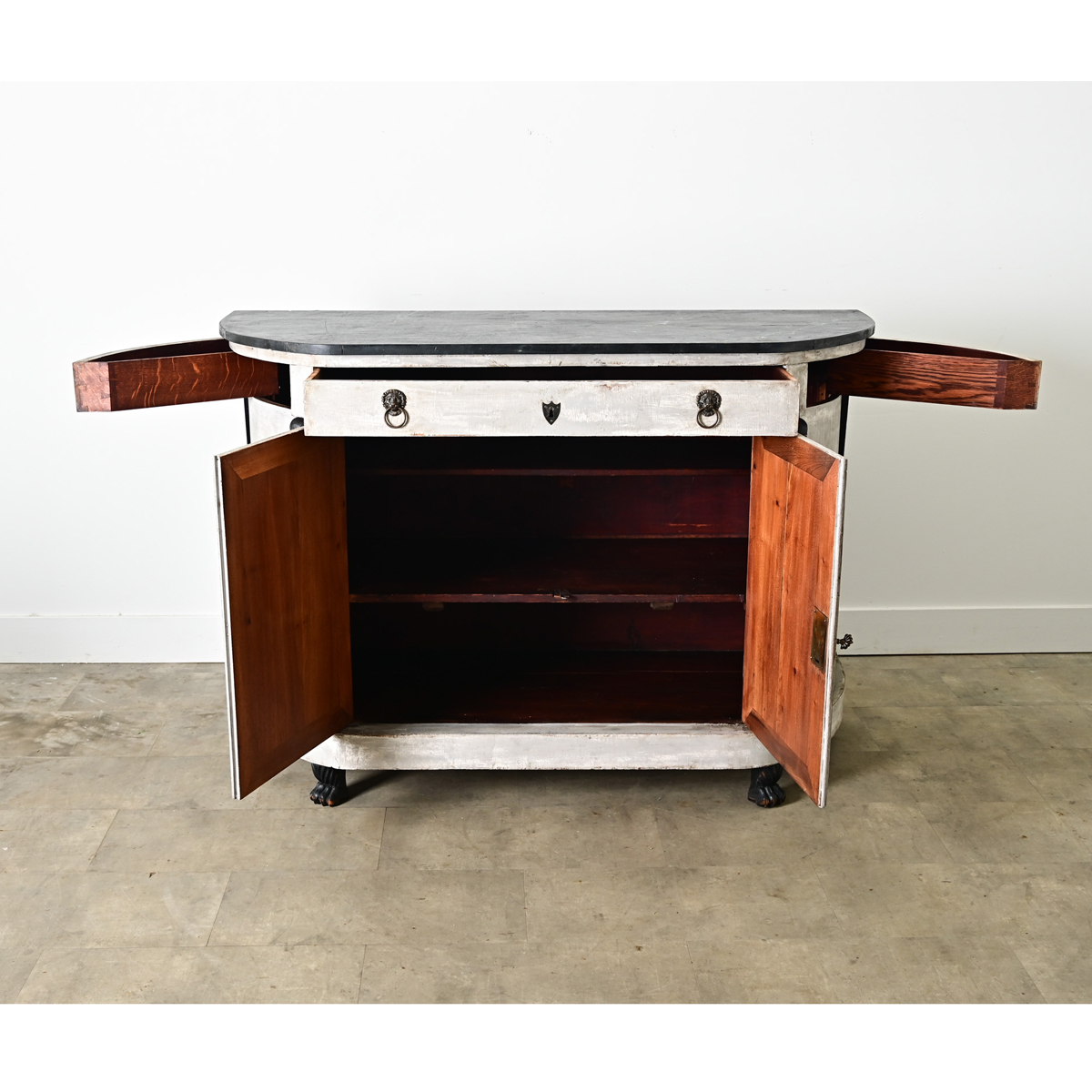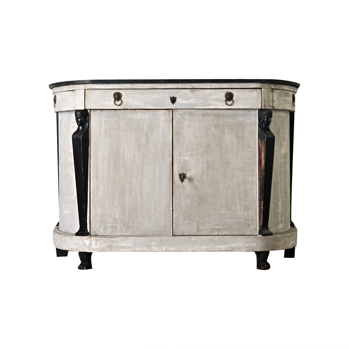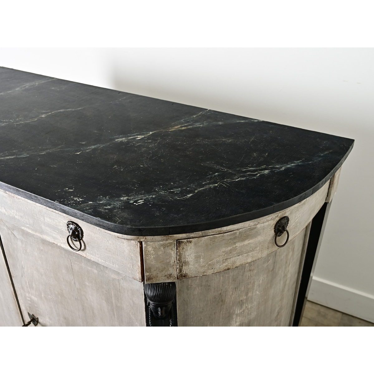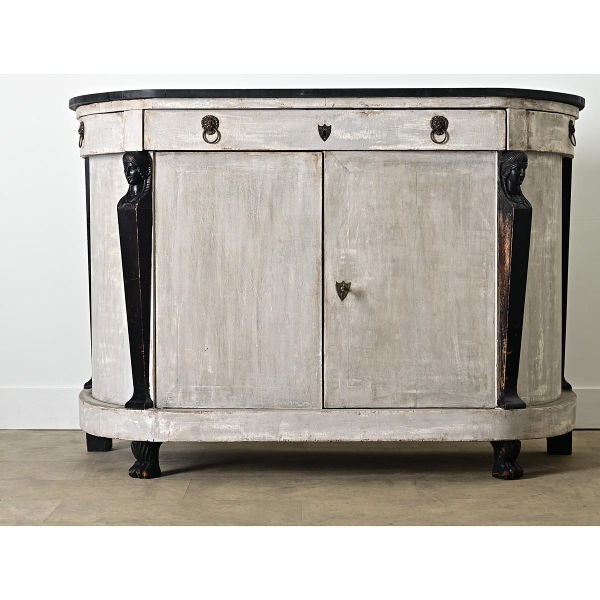 A very unique French Empire 19th century buffet, or desserte server, in demilune profile and more recent painted finish of uncertain age. The top surface is a handpainted faux marble that is nearly all black except for delicate wisps of smoky gray veining. In the frieze are three drawers: one in each corner that swings outward at an angle, and one wide drawer in the center, all using lion-motif ring pulls. The case is washed in an ethereal tone of French gray with matte texture and mottled variation blending streaks of white, gray, and blue pigment that might easily blend with Directoire or Gustavian tastes more than the opulence of Empire. Carved wood caryatids in ebonized (painted) effect flank the pair of doors at center, which open in tandem by working lock and key. Inside the case are two shelves at different depths that could be perfect to use this case piece as a dry bar or dining room storage. The caryatids terminate at the floor as robust, pawed feet, while the ebonized pilasters toward the back are undecorated. Please view the detailed images to see more of this inspired buffet.