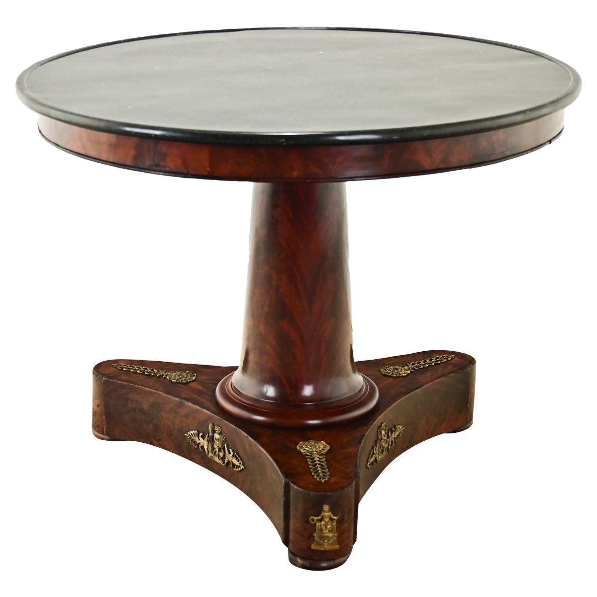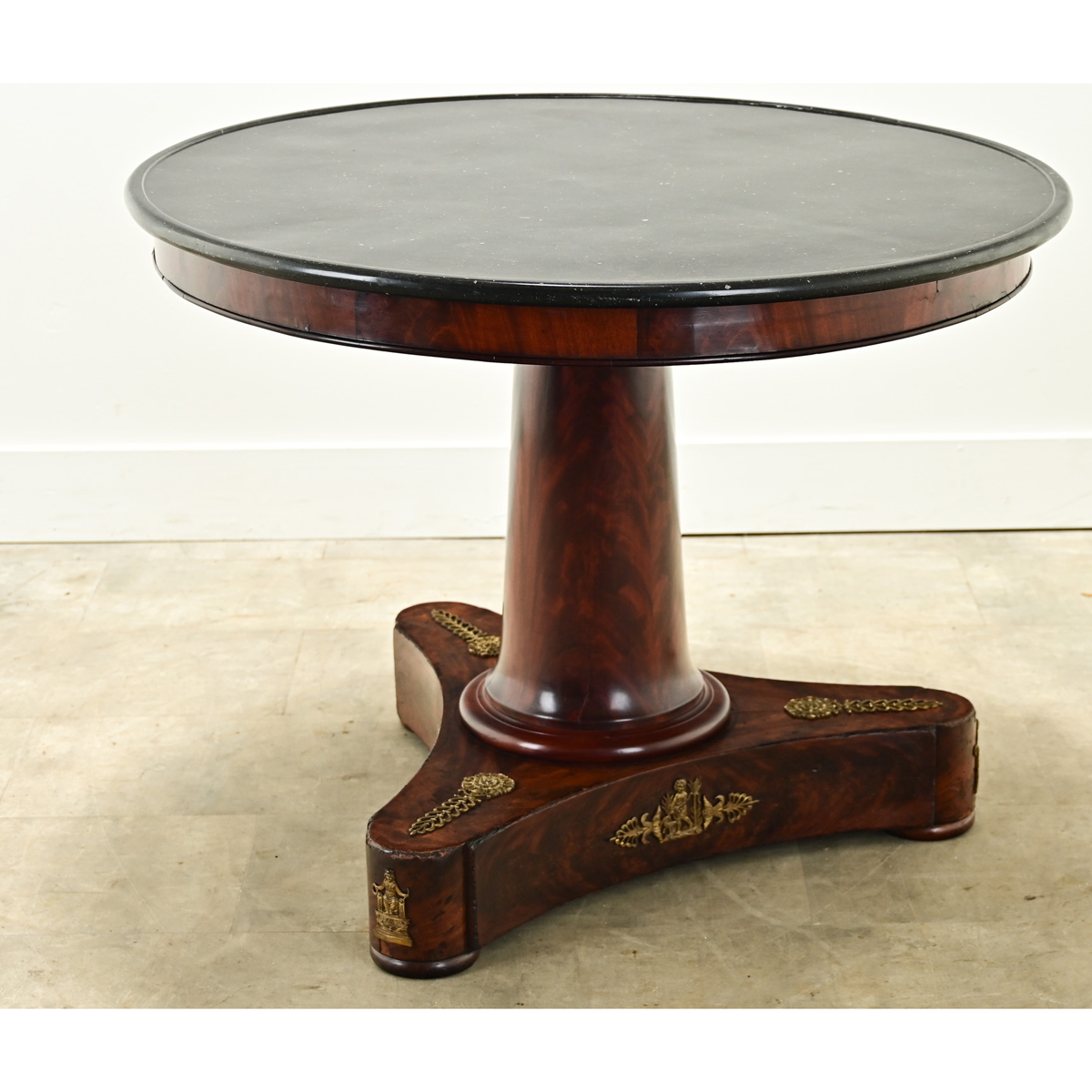 A large French Empire period gueridon from the 1800’s. The original fossil black marble top has been professionally repaired. Its refined mahogany base has a simple apron above a column form center pedestal and three concave legs with neoclassical gilt bronze ormolu, raised on rounded feet. Cleaned and polished with a French paste wax, this table is ready for your immediate use. Be sure to view the detailed images to see the current condition.