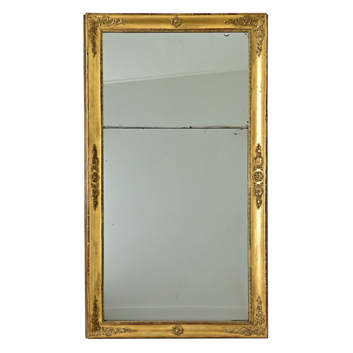 This French Empire mantle mirror (c. 1800) exhibits calculated restraint in the surface decoration, the gold gilt molding is largely plain and smooth, with feather and foliate carvings placed at regular intervals along the perimeter. The original mirror plates reflect a fine dusting of crystals among the foxing. View the detailed images.