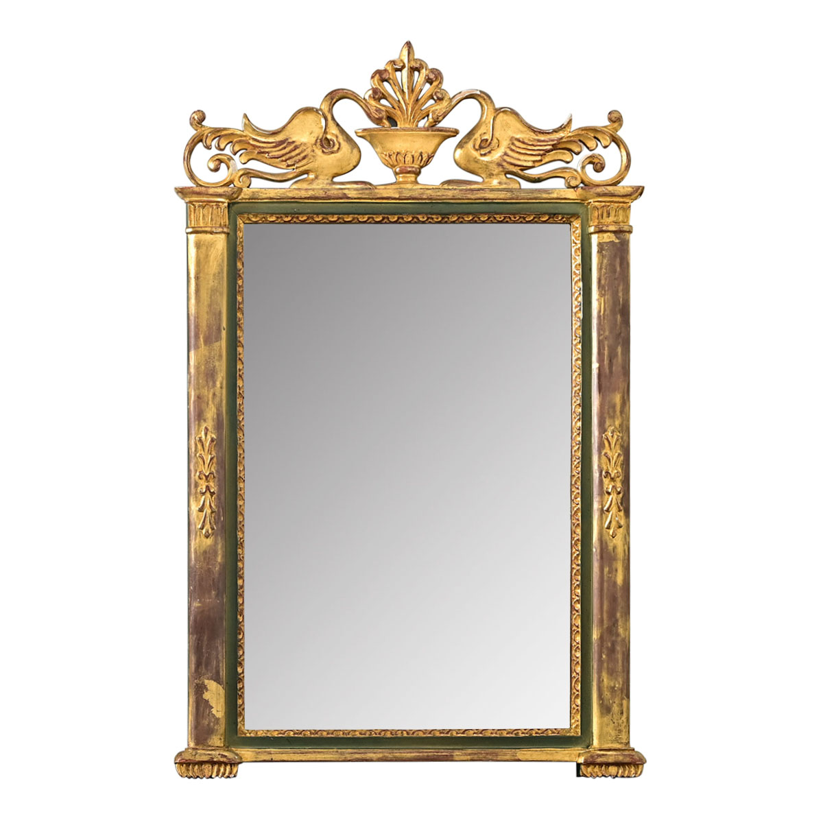 A magnificent 19th century French giltwood tabernacle style mirror in the Louis XVI taste, the exquisite Neoclassical carvings around the (dark green) painted frame appear even more theatrical under a layer of gold. At the top of the piece is an anthemion design rising out of a fountain from which two swans drink. Their feathers spread toward the edges of the frame morphing into glorious scrolls. The frame takes an architectural quality with two wide columns on either side–of the Corinthian order–with capitals of implied foliate decoration matching the garland at the middle, and terminating with a kind of gadroon texture on the column bases. Mirror plate is likely a more recent replacement, the glass shows no foxing and crystals are absent; it is surrounded by low-relief carved gilt moulding outlined in a dark green painted molding. Strung with cord, ready to hang in your interior. Please view the detailed images to see the current condition.