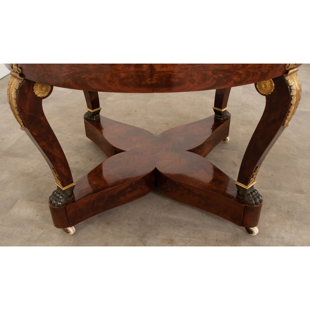 An impressive 19th Century Empire center table made in France. The gray-white marble top sits perfectly on its table base with an inset beveled marble ring. The table base is wrapped in stunning flame mahogany and is raised by elegant scrolled legs with handsome paw feet, connected by a striking ‘X’ shaped stretcher plinth base. Intricate gilt bronze ormolu is found throughout this show stopping table. The whole is lifted on casters. Be sure to look at the detailed images to see the current condition of this table. Circa 1860’s