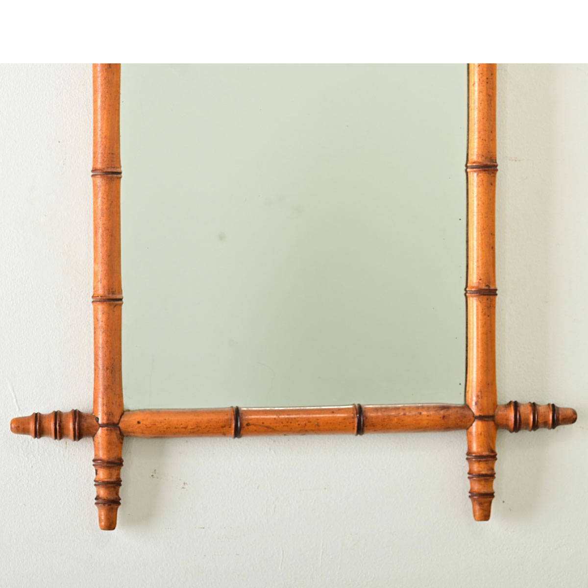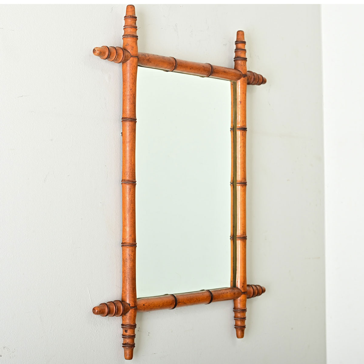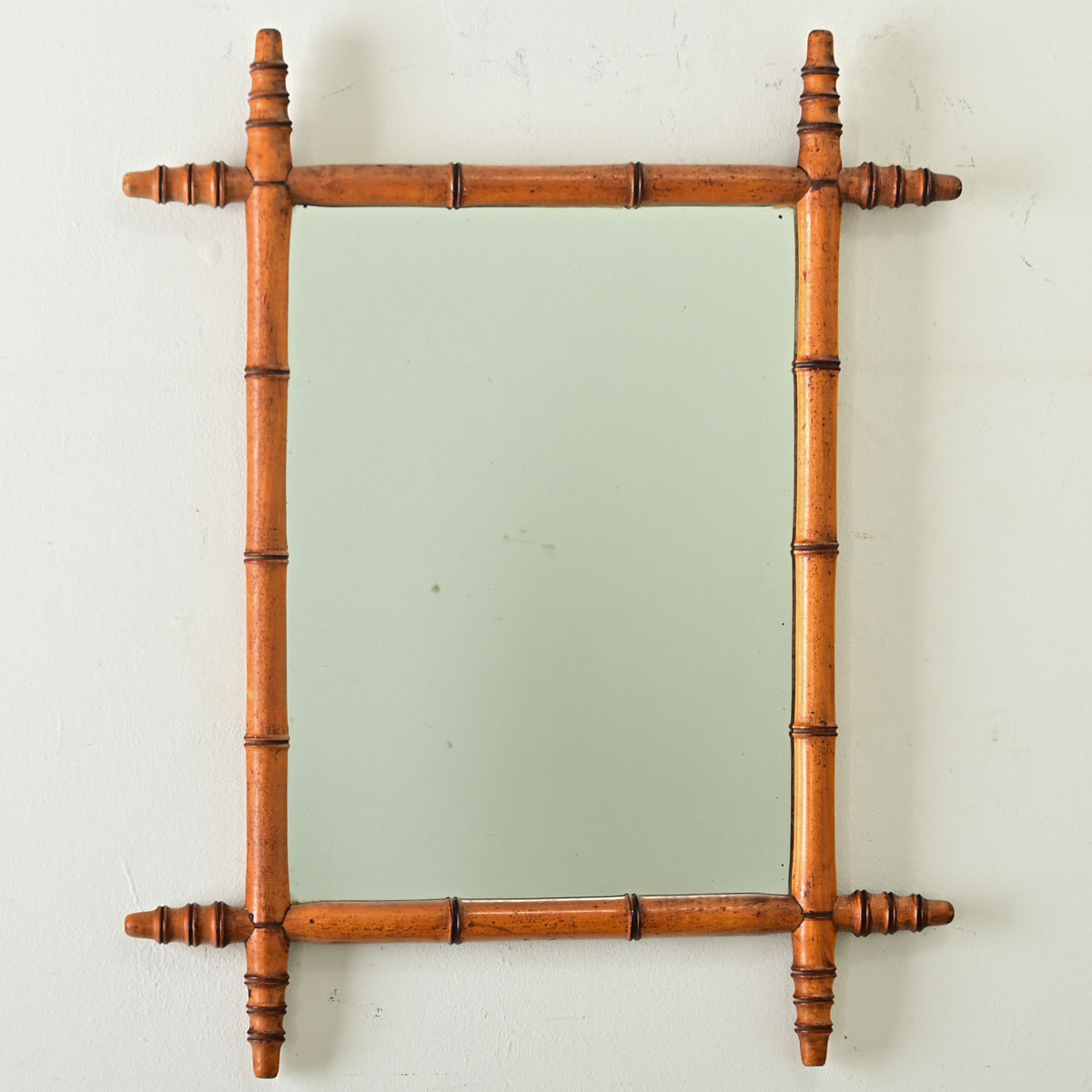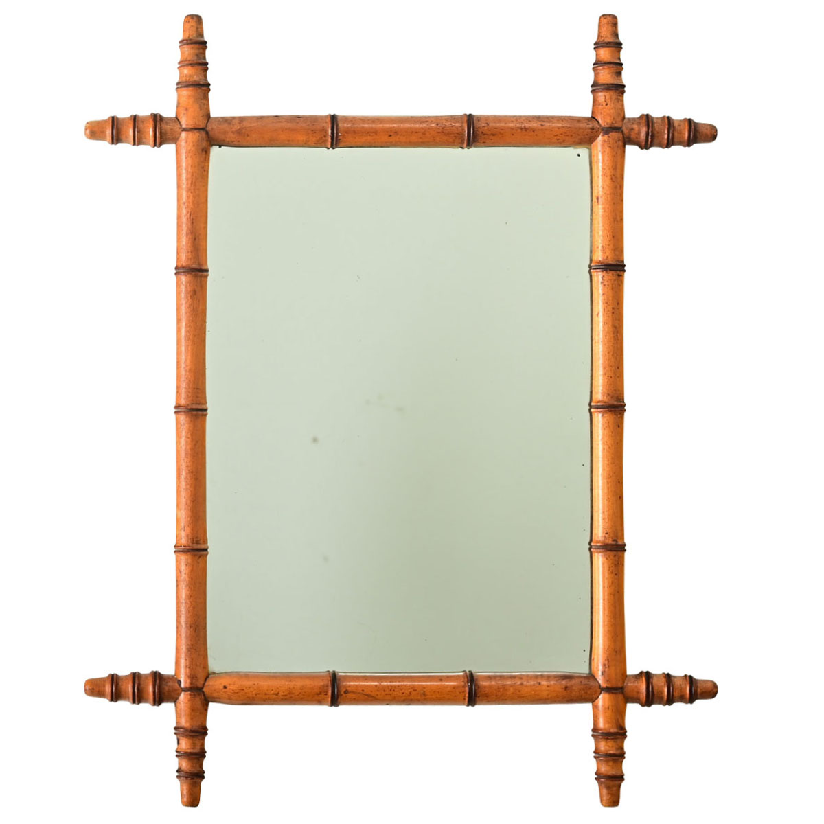 A faux-bamboo mirror from France, turn of the century circa 1890, made of carved pine with subdued grain patterns to appear as (faux) bamboo down to the intermittent nodes projecting at the corners. Displayed in a vertical orientation, this mirror features rectangular proportions and symmetry to hang in either direction. The mirror draws us with its exotic appearance and lovely color, making it a great choice to decorate any room and across a multitude of interior design tastes. Note the mirror plate contains only a few dark spots of foxing. Make sure to view the detailed images for a closer look.