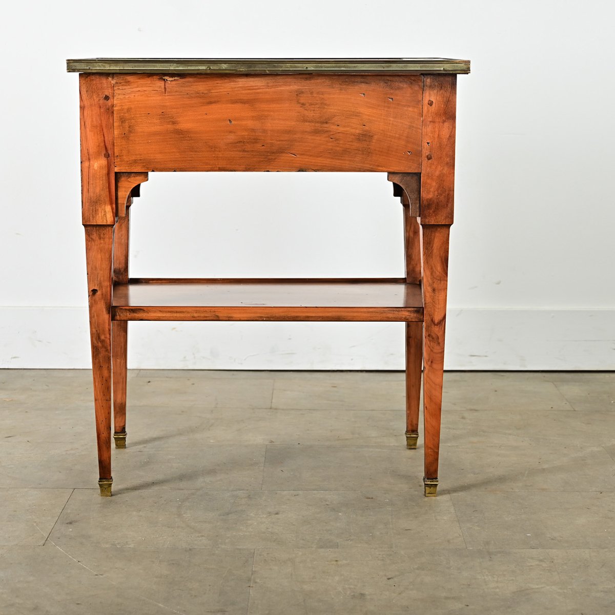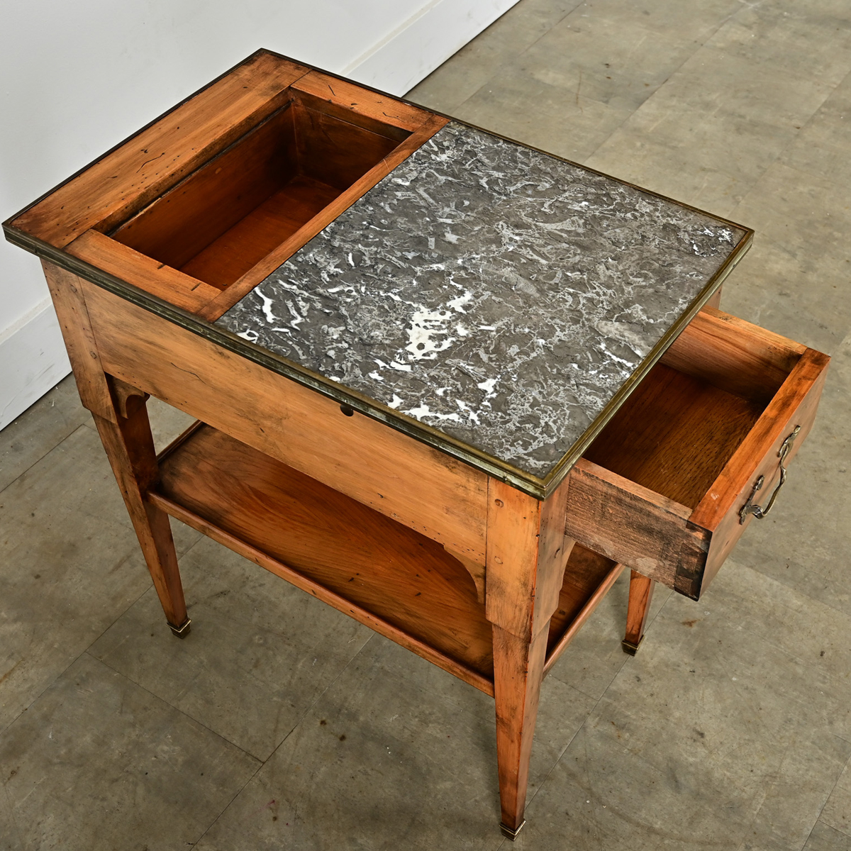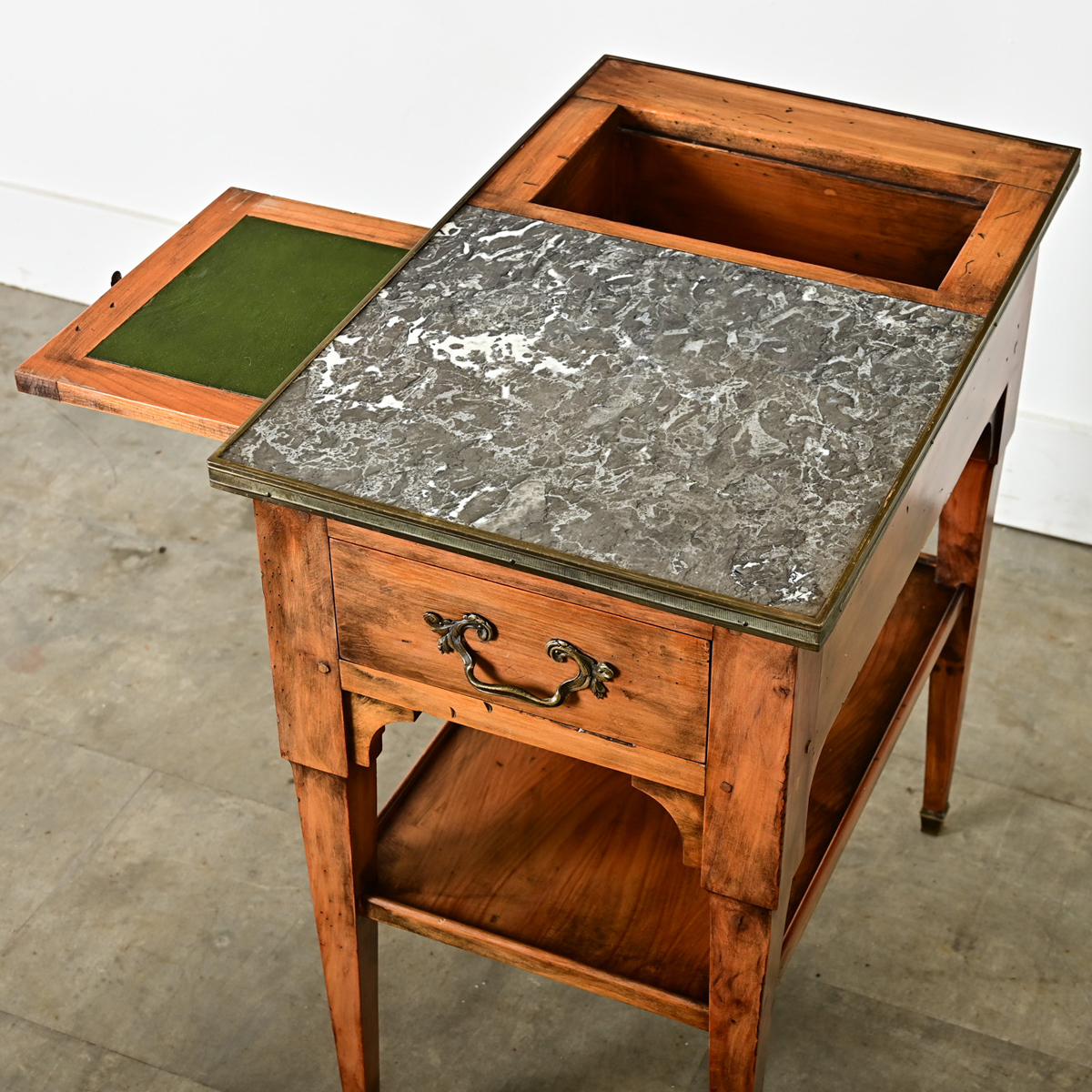 A French fruitwood and gray marble rafraîchissoir table from the late 19th century with brass accents. Functioning like a bar cart or dry bar, this occasional table offers a recessed area to the left side to hold bottles with a marble surface to the right side for preparing one’s drink. The small drawer in the apron is perfect for organizing bar tools and cocktail napkins, plus a hidden leaf in green, tooled leather that extends from the case for additional surface area when needed. Square, tapering legs on brass feet support a lower shelf for additional storage and display area, framed by decorative spandrels in the upper corners. Cleaned and polished with a French paste wax, this antique table is ready for your next event. Please view the detailed images to see the current condition.