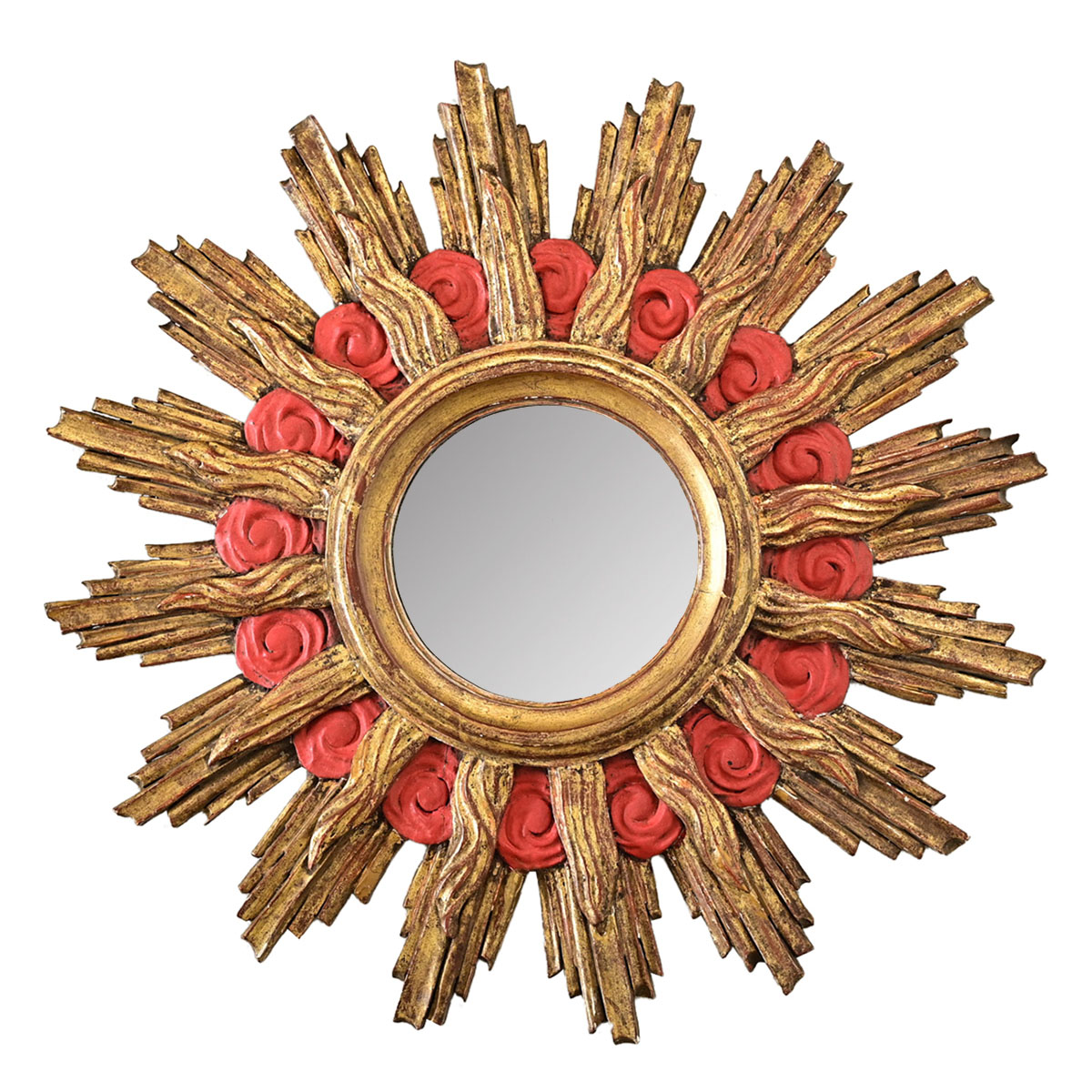 19th century French gilt wood starburst mirror in alternating rays of flames and lightning bolts that radiates a kind of energy and dynamism to stand on its own or stand out in a gallery wall. Arranged in three distinct themes, the sharpness of the jagged rays is complemented by little red bole swirls toward the mirror plate that amplifies the tactile warmth of patinated gold gilt. A smooth corona surrounds the (flat) mirror plate at center, dusted with a thin layer of foxing that confirms its original condition. Strung with picture wire on the back, ready to hang in your interior. Please view the detailed images to see more.
