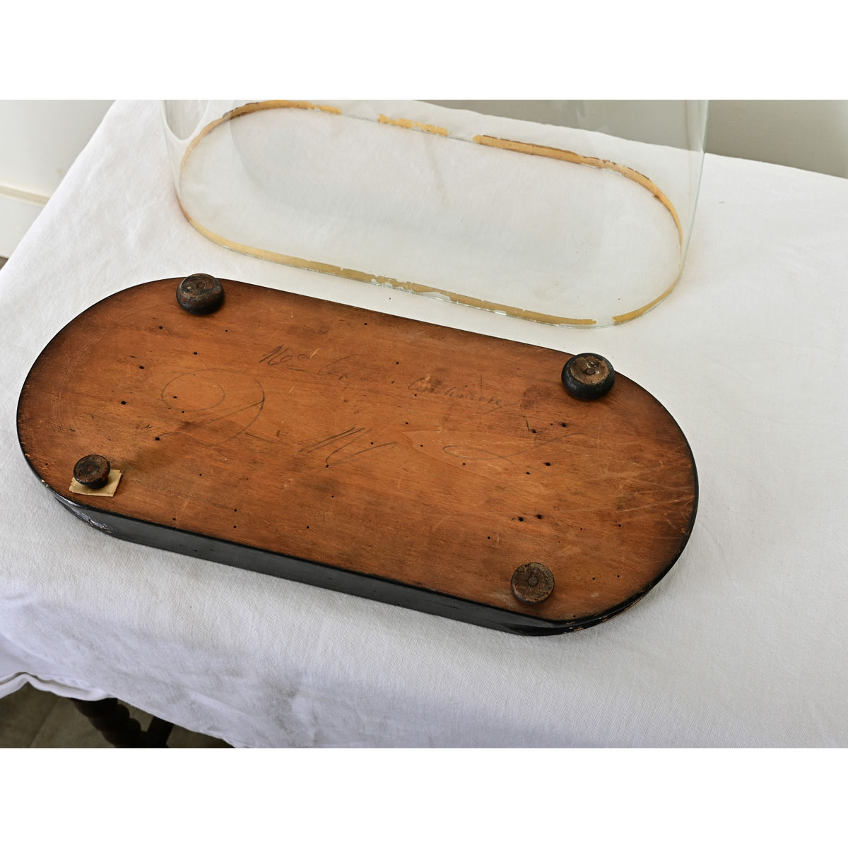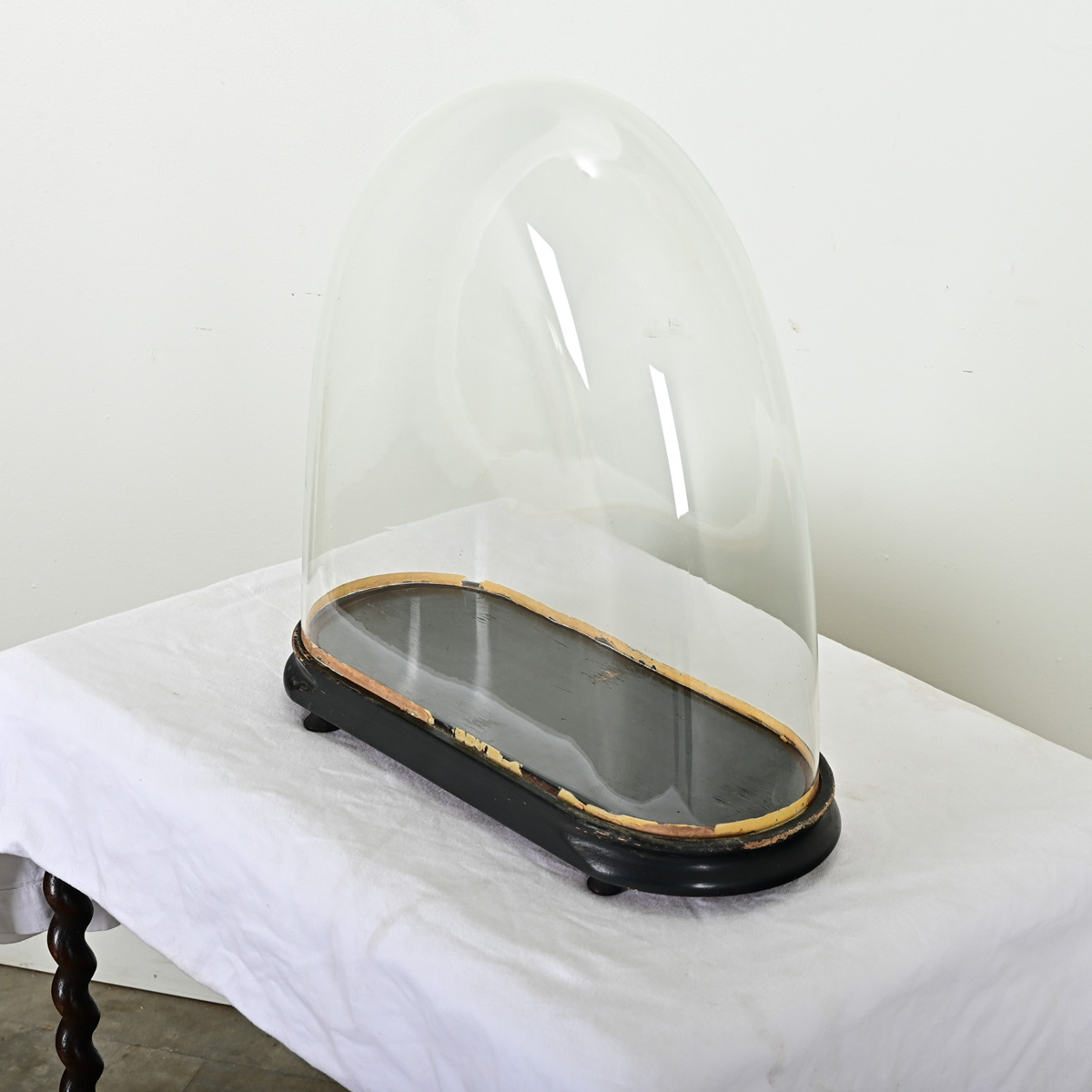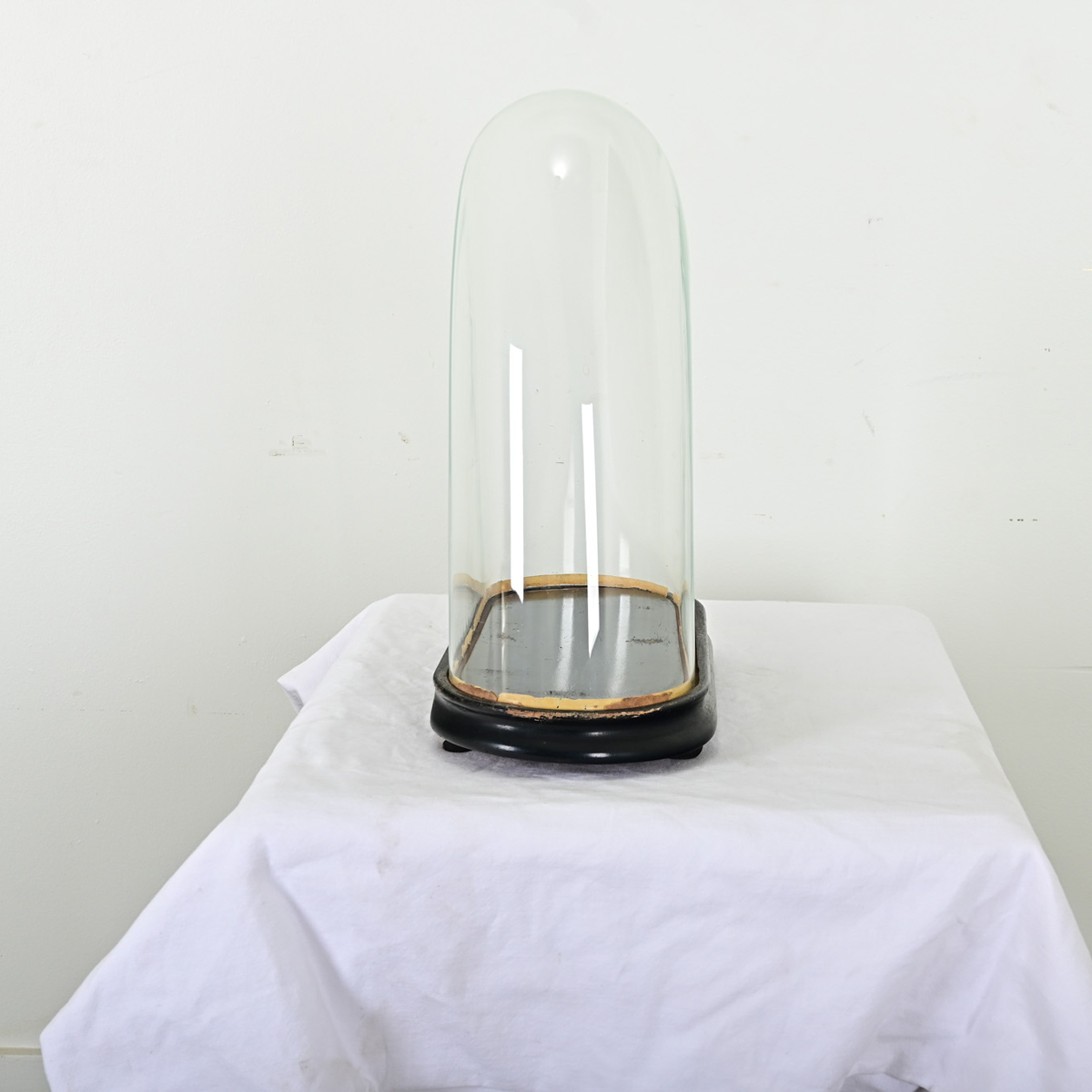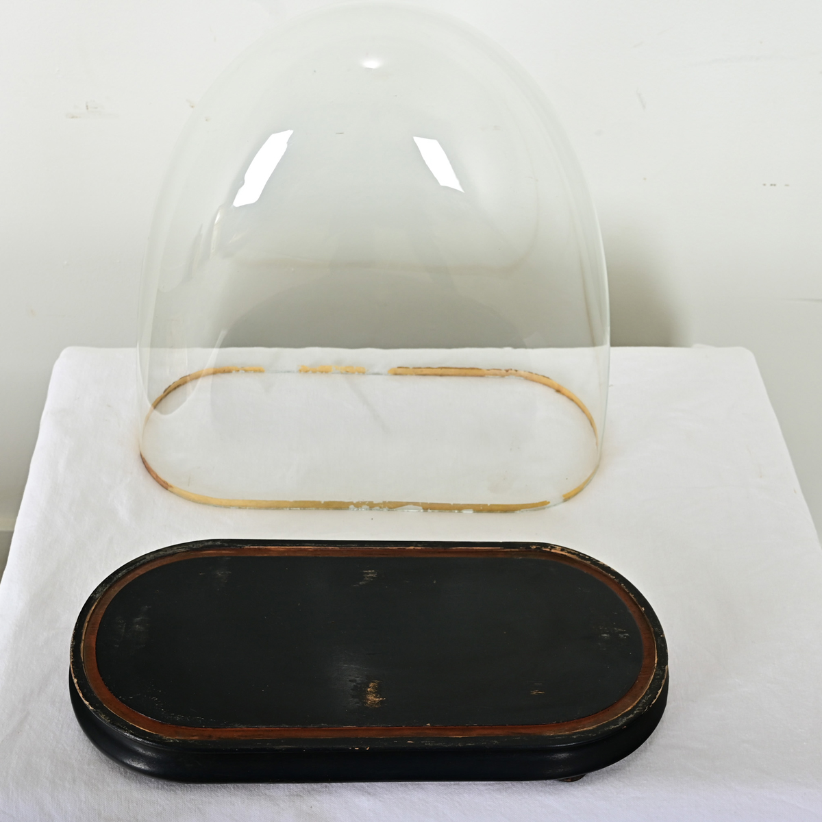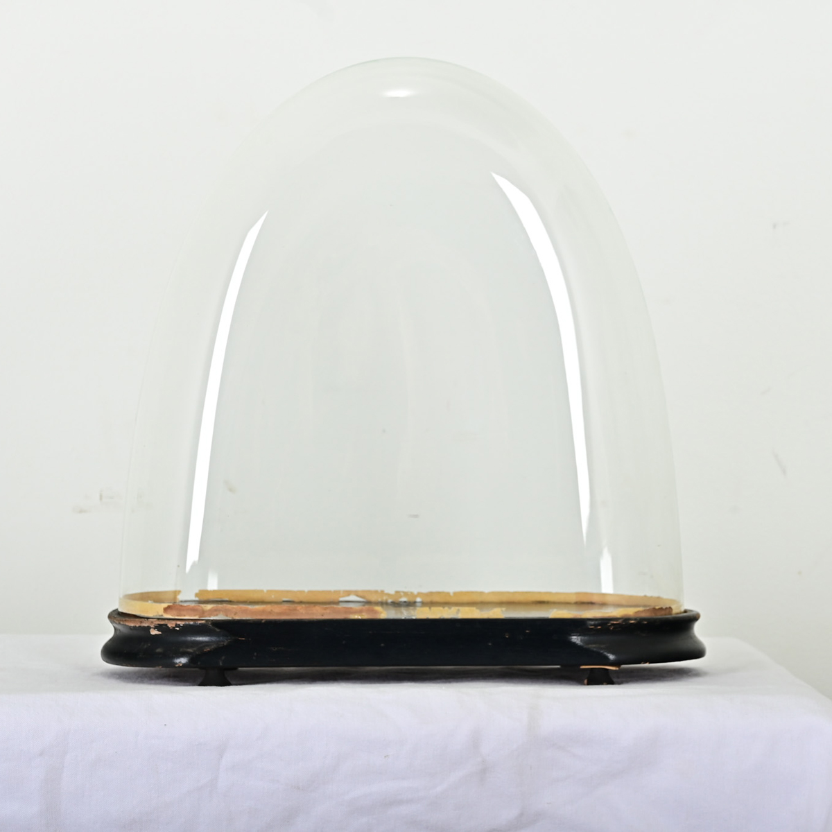 Showcase and protect your treasured objects with this unique glass dome from France. Dating to the late 19th century, dome displays like this shielded portico clocks or flora & fauna specimens from dust, soot, and insects while remaining totally visible on all sides. The arched shape bell of glass fits snugly into an ebonized wooden base trimmed with gold-gilt. View the detailed images.