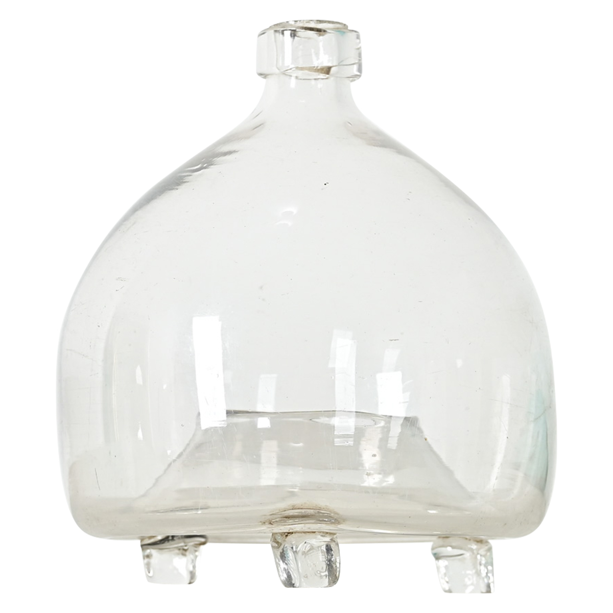 A unique handmade fly catcher, mouth-blown from clear glass and dating to 19th century France. The basin at the bottom of the glass cone is meant to be filled with a small amount of sugar water to lure the flies in. Three square feet lift the vessel from the table for the flies to enter, whereas the opening at the top would have been corked to trap them in. Please view the detailed images to see the current condition.