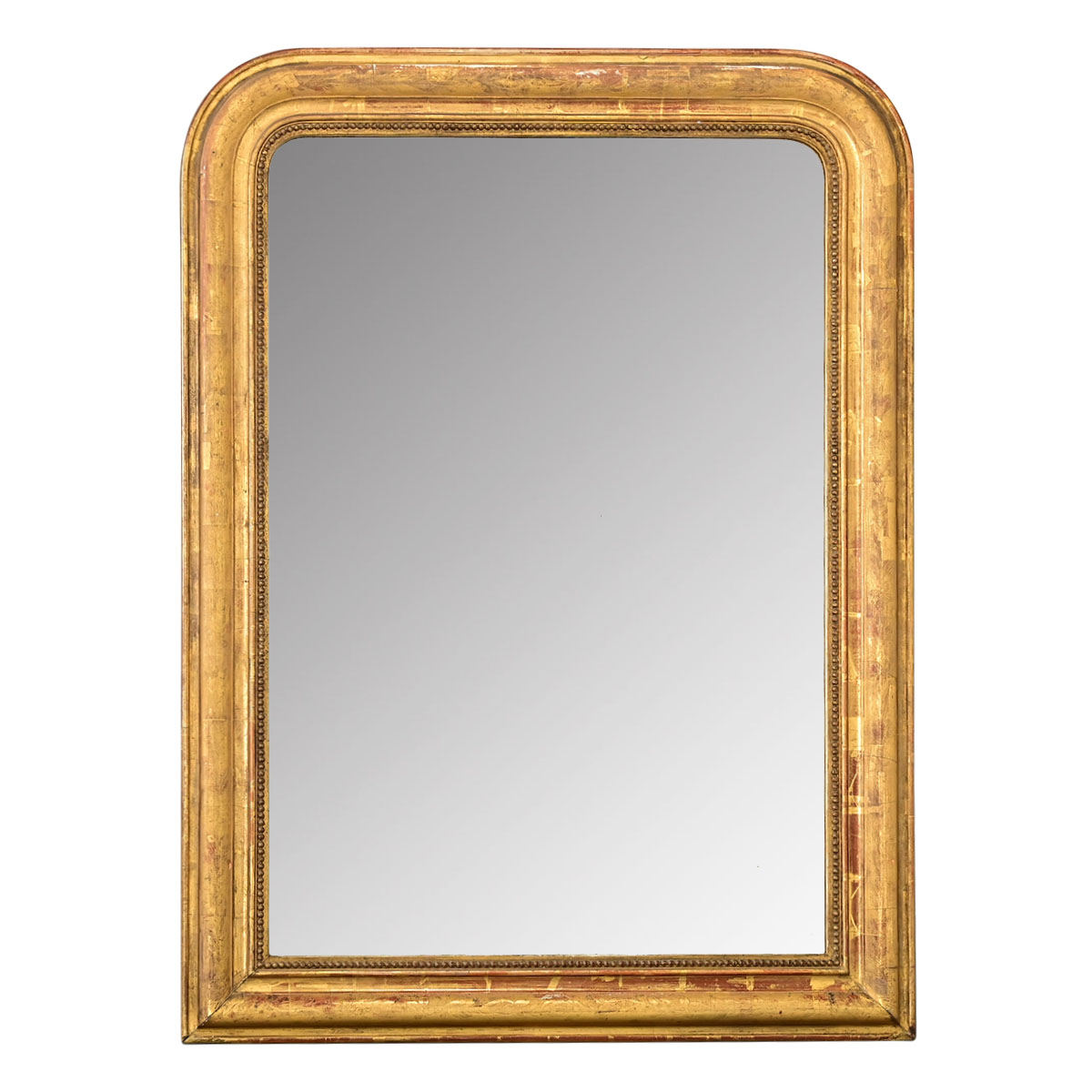 A lovely gilt mirror from 19th century France, the strong proportions of the Louis Philippe style arch-top frame are emphasized by slender foliate and beaded molding around the original mirror plate. Delicate foxing of the glass appears in a translucent haze of random spots, drawing the viewer in for a closer look. This antique mirror is the perfect scale to make a big impact in any room: over a mantel or hung on the wall. Please view the detailed images to see more.