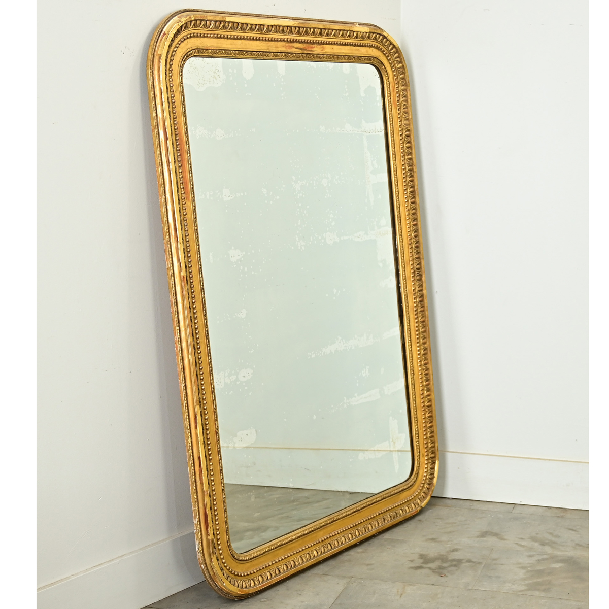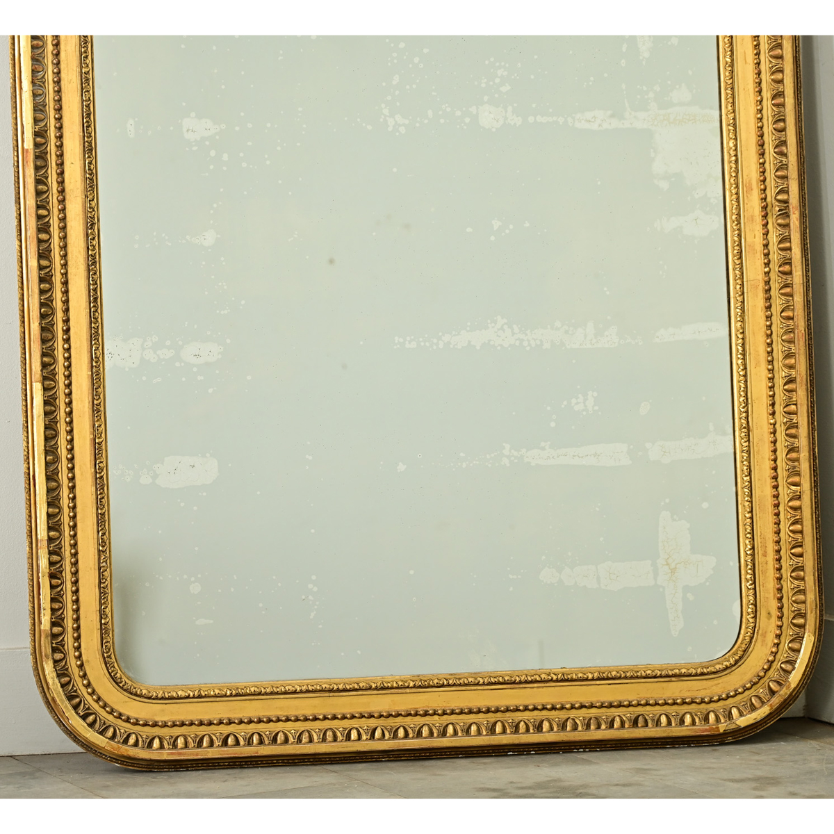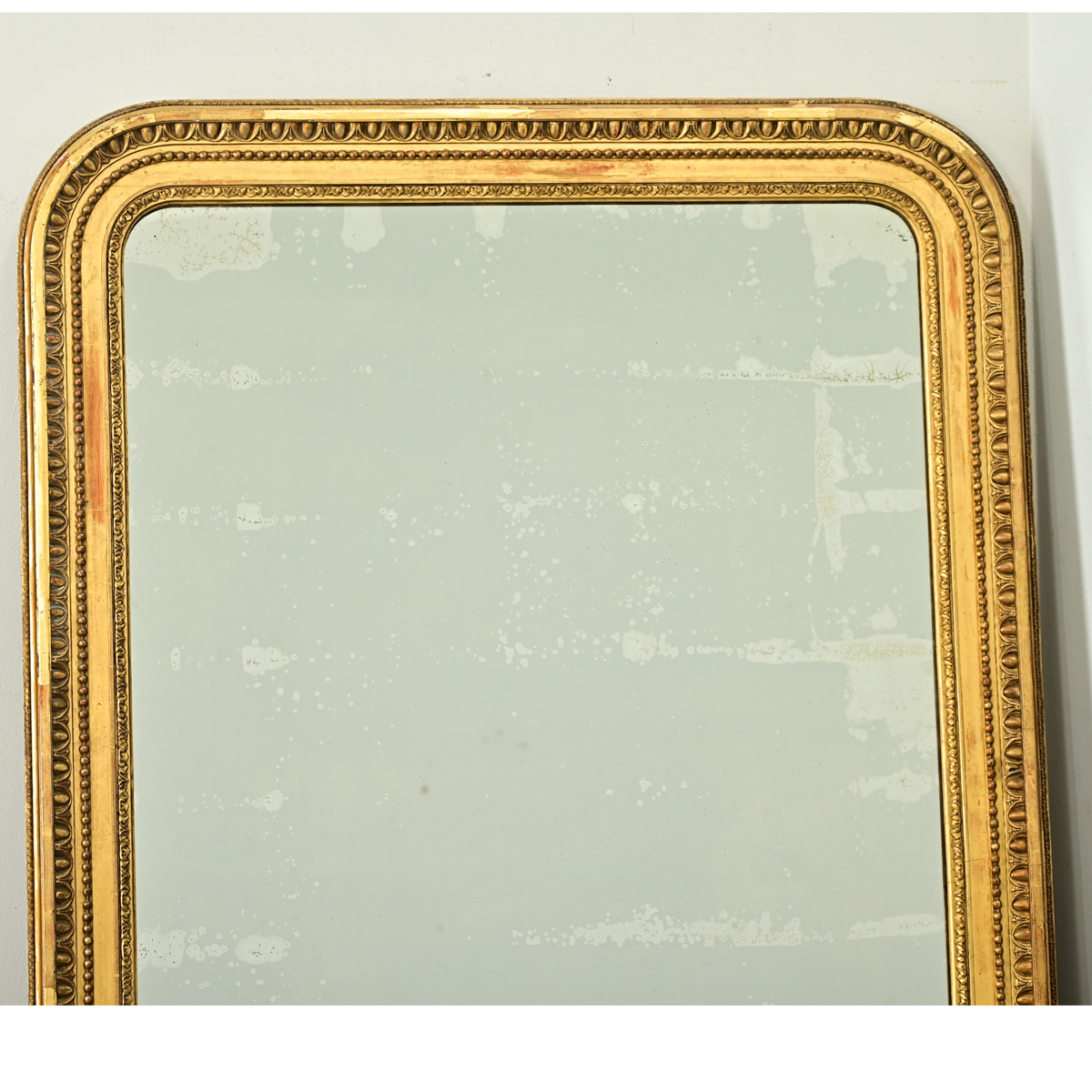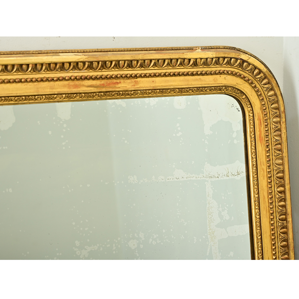 A lovely gilt mirror from 19th century France, the strong proportions of the Louis Philippe style arch-top frame are emphasized by slender foliate and beaded molding around the original mirror plate. Delicate foxing of the glass appears in a translucent haze of random spots, drawing the viewer in for a closer look. This antique mirror is the perfect scale to make a big impact in any room: over a mantel or hung on the wall. Please view the detailed images to see more.
