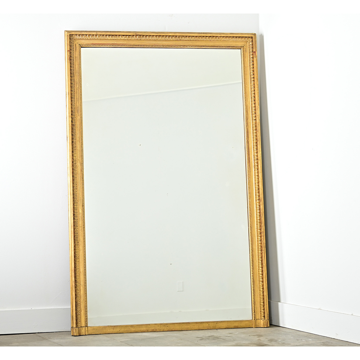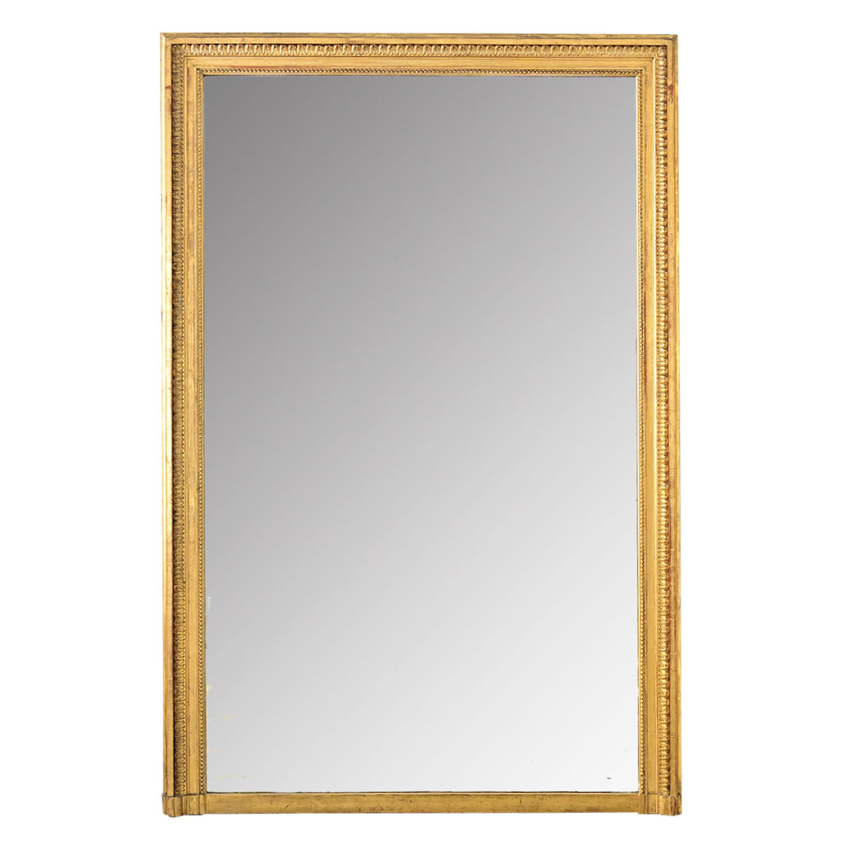 A spectacular French 19th century gold gilt Neoclassical mantel mirror with original mirror glass. The restrained molding incorporates foliate motifs, beading, and “cassetta” flat borders that give definition to the rectangular shape, finished with rounded corners at the base. Minimal spots of foxing in the glass confirm the age of this striking mantel mirror. Please view the detailed images to see more.