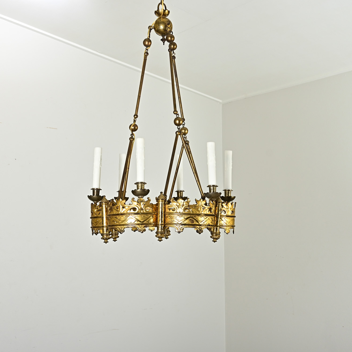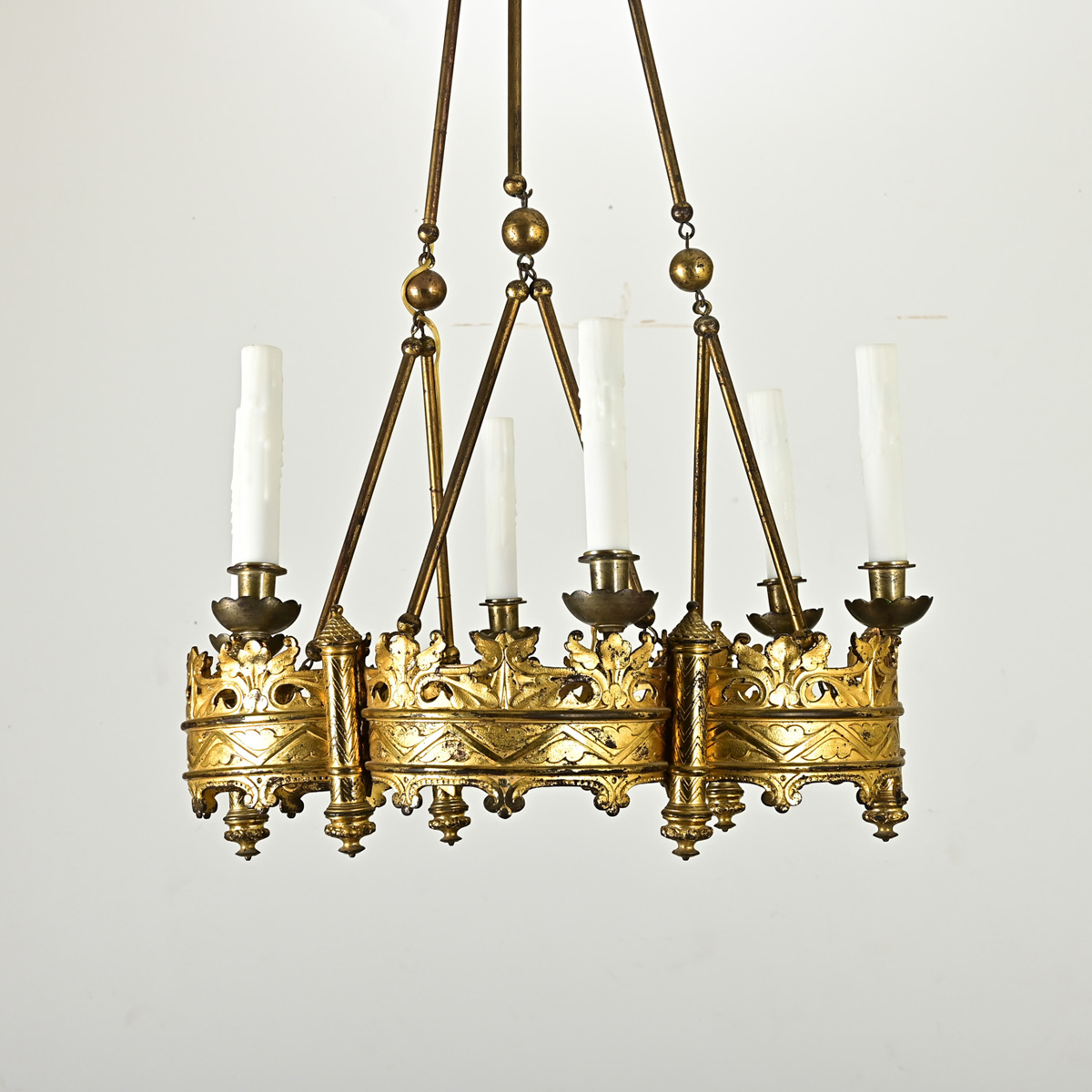 A stunning 6-light Gothic style brass chandelier from 19th century France. The dramatically styled fixture has a multifoil shaped ring from which the six lights rise. The base is harnessed together by brass rods, connecting to a brass sphere midway to the ceiling canopy, joined together at points punctuated by small brass orbs. Originally made to burn candles in a church, the chandelier has recently been cleaned, electrified and professionally rewired for US use, using UL-listed components. Take a look at the detailed photos to view the fixture’s current condition and appearance.