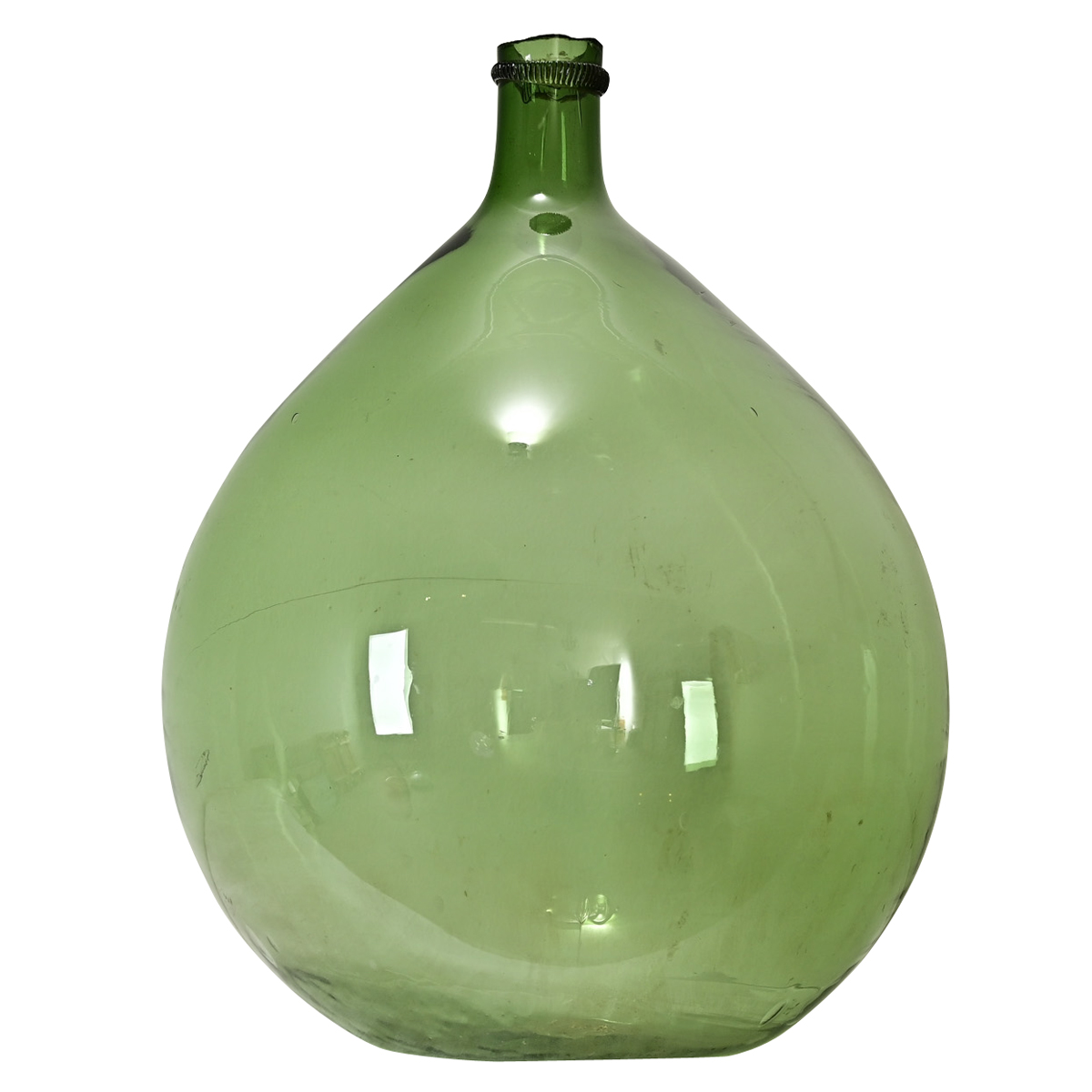 A large, green blown glass wine keg–or demijohn as they are commonly known–having a balloon shape and short neck. Originally used for storing wine and other liquids, demijohns make great decorative accessories in the home for their colors and shapes, or used as vases to complement greenery and dried flowers. The uneven edge at the top rim is original from being mouth-blown; rolling of the hot glass creates the swirls and sometimes bubbles that give these antique vessels their charm & personality. Take a closer look at the detailed images to explore the subtle variations that make each one so unique.