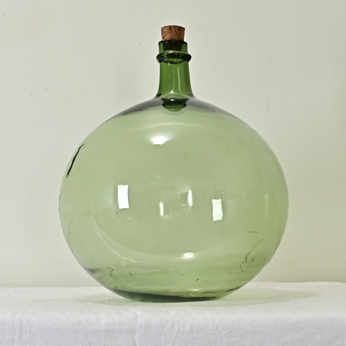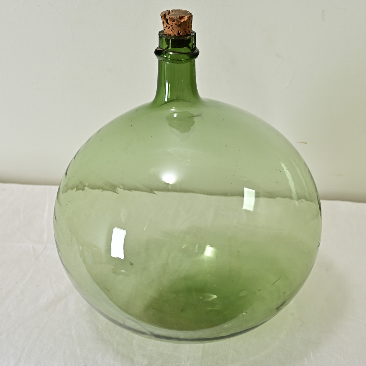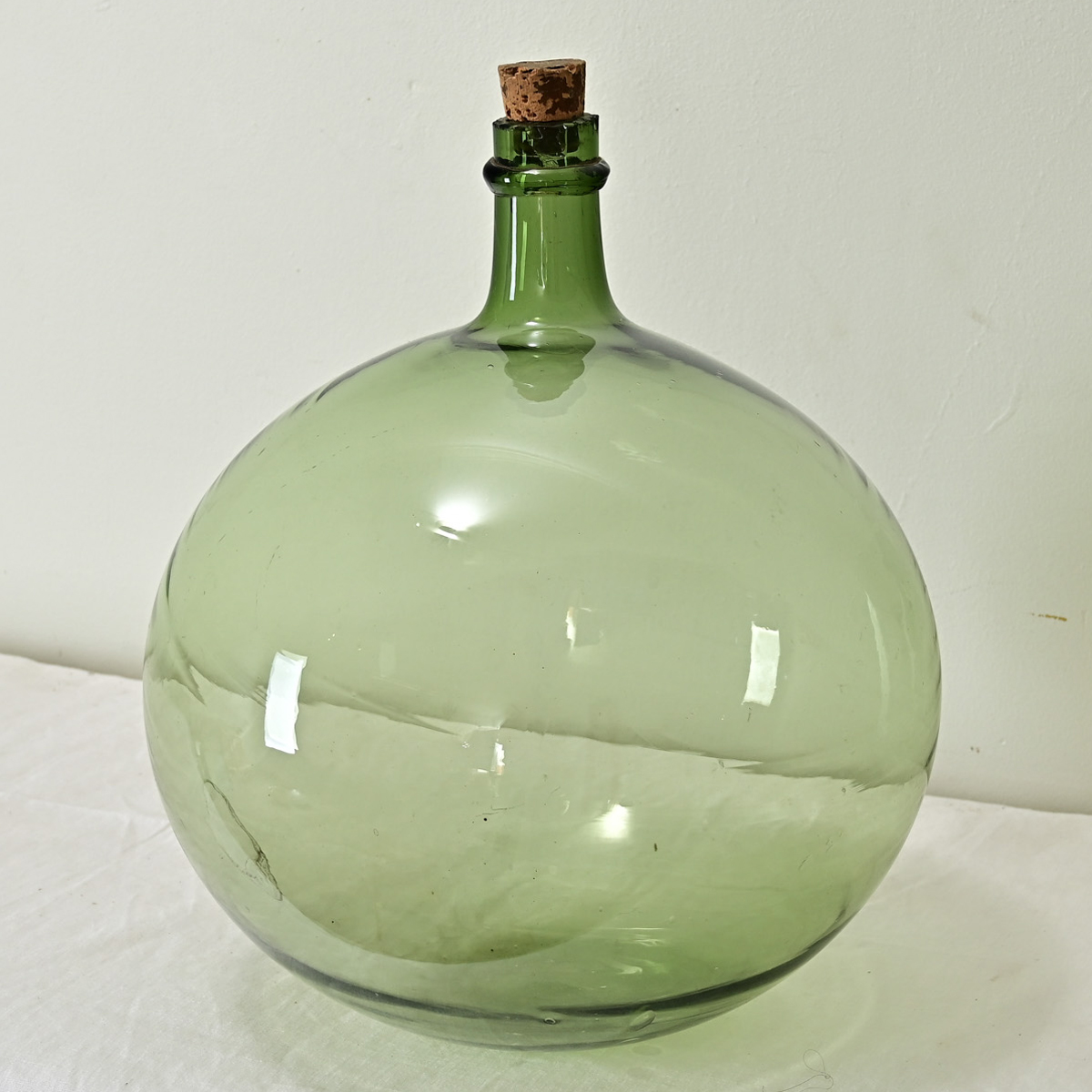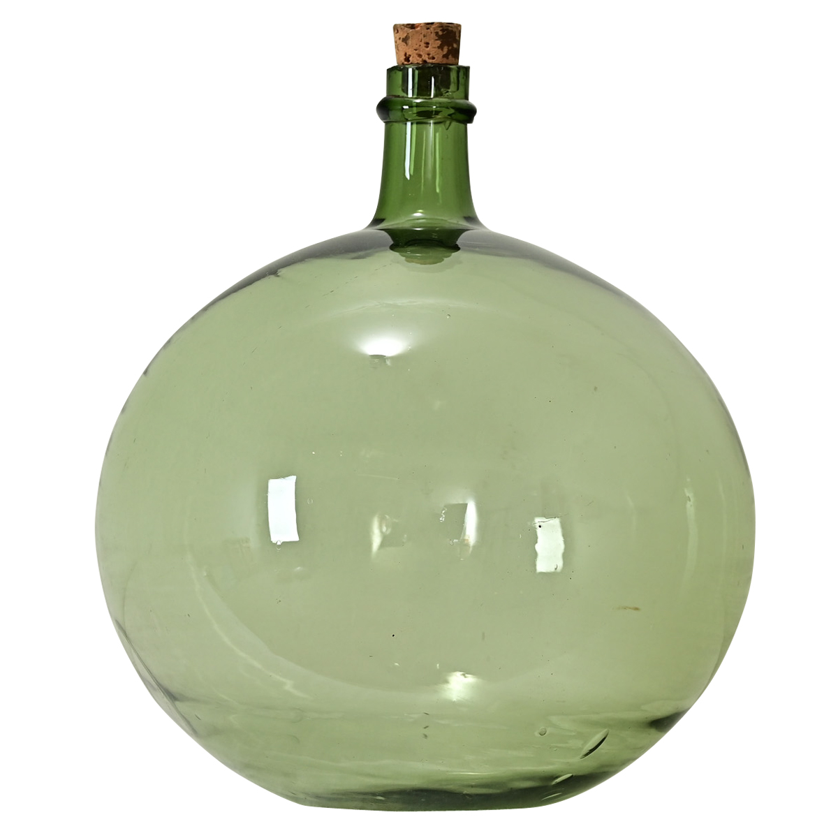 A large, green blown glass wine keg–or demijohn as they are commonly known–having a spherical shape and short neck with cork stopper. Originally used for storing wine and other liquids, demijohns make great decorative accessories in the home for their colors and shapes, or used as vases to complement greenery and dried flowers. The uneven edge at the top rim is original from being mouth-blown; rolling of the hot glass creates the swirls and sometimes bubbles that give these antique vessels their charm & personality. Take a closer look at the detailed images to explore the subtle variations that make each one so unique.