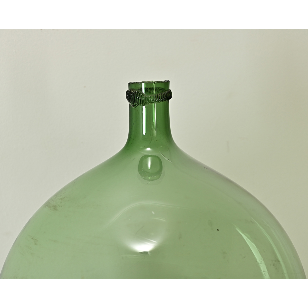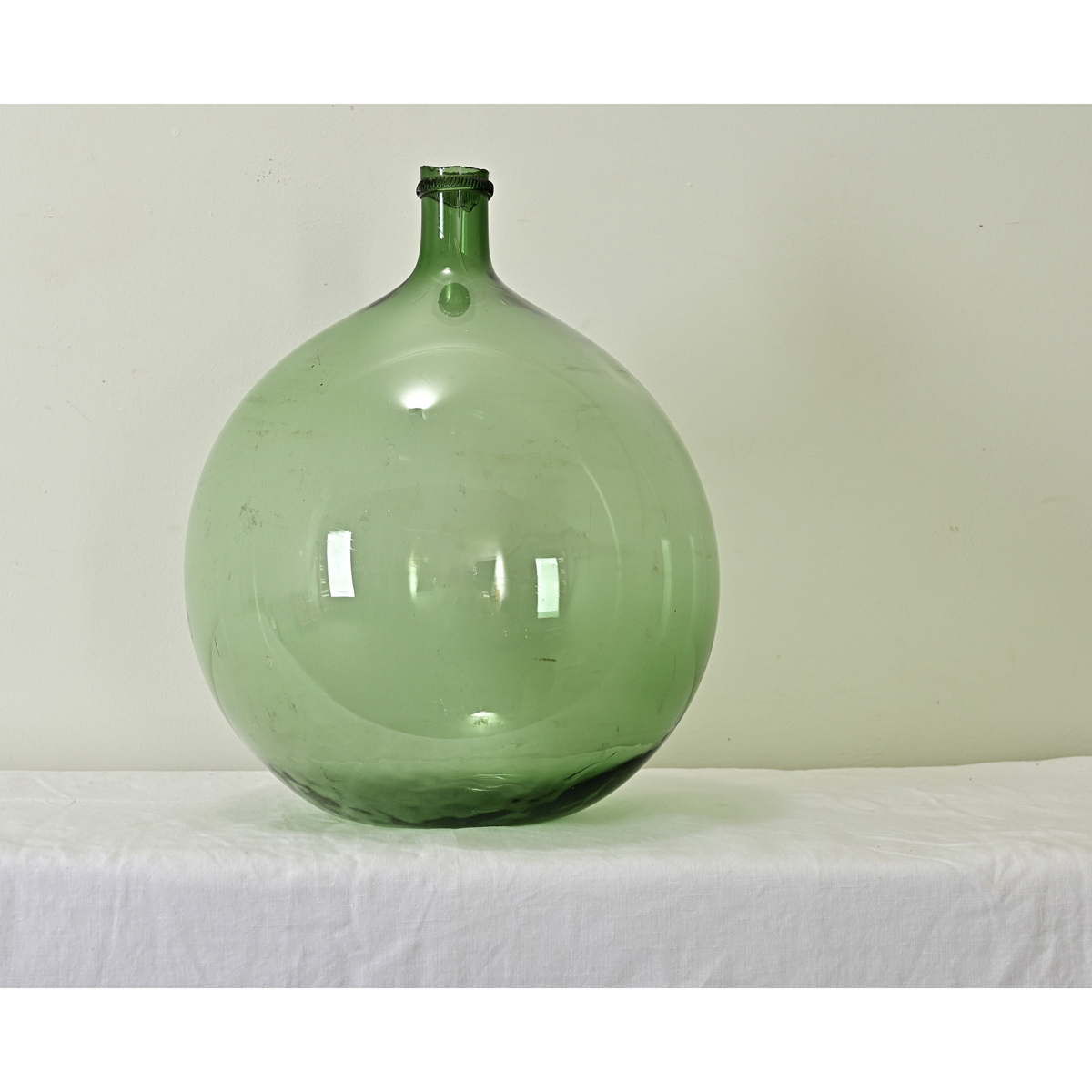 A beautiful, green blown glass wine keg, or demijohn as they are also called, having a bulbous form and short neck. Originally used for storing wine and other liquids, demijohns make great decorative accessories in the home for their colors and shapes, or used as vases to complement greenery and dried flowers. Rolling of the hot glass creates the swirls and sometimes bubbles that give these antique vessels their charm & personality. Take a closer look at the detailed images to explore the subtle variations that make each one so unique.