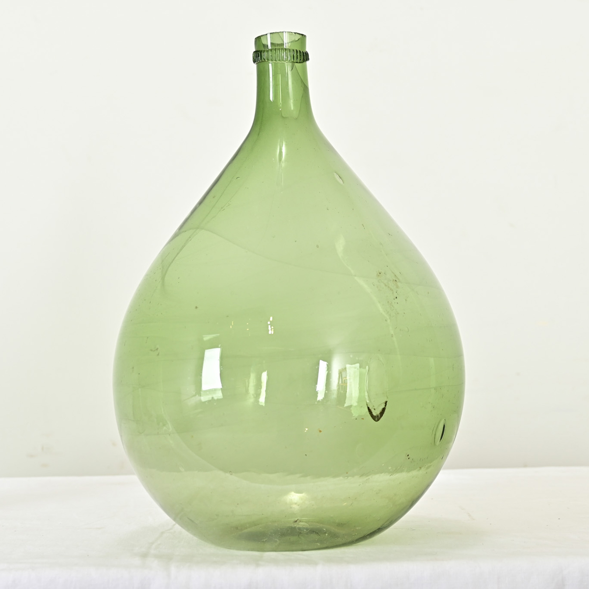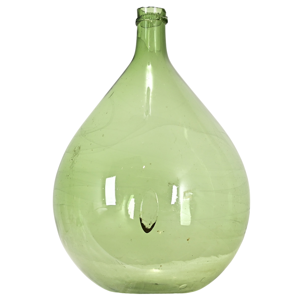 A stunning, green blown glass wine keg, or demijohn as they are also called, having a teardrop form and short neck. Originally used for storing wine and other liquids, demijohns make great decorative accessories in the home for their colors and shapes, or used as vases to complement greenery and dried flowers. The unfinished cut at the top rim is original from being mouth-blown; rolling of the hot glass creates the swirls and sometimes bubbles that give these antique vessels their charm & personality. Take a closer look at the detailed images to explore the subtle variations found in each vessel that makes each one unique.