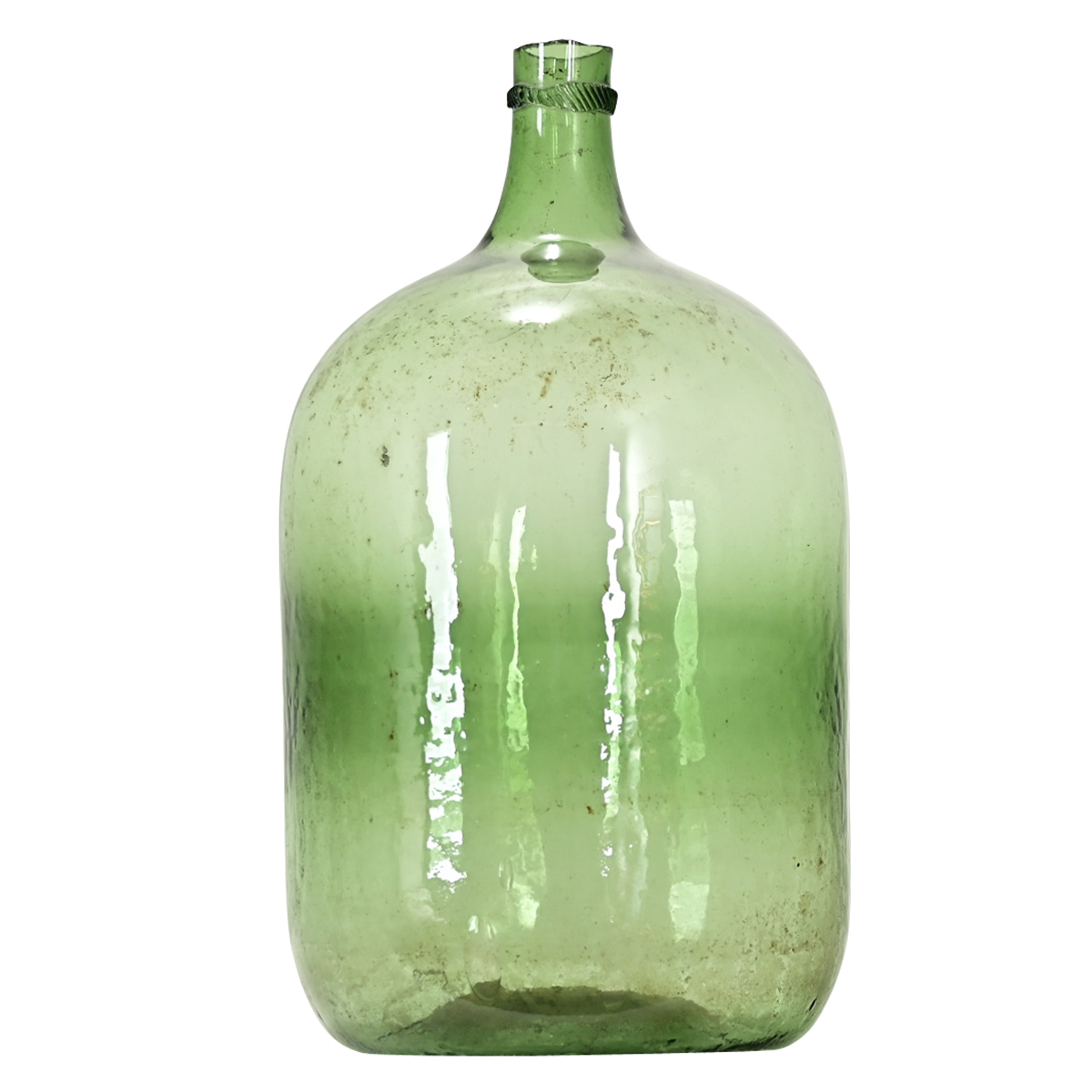 A 19th century French green glass wine keg, or carboy as they are properly called, having a cylindrical form and short neck. Originally used for storing wine and other liquids, demijohns make great decorative accessories around the home for their colors and shapes, used as vases to complement greenery and dried flowers. The unfinished cut at the top rim is original from being mouth-blown; rolling of the hot glass creates the swirls and sometimes bubbles that give these antique vessels their charm. Take a closer look at the detailed images to explore the subtle variations found in each bottle that makes each one unique.