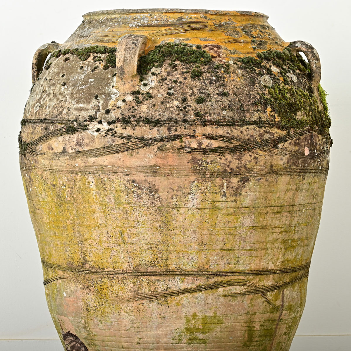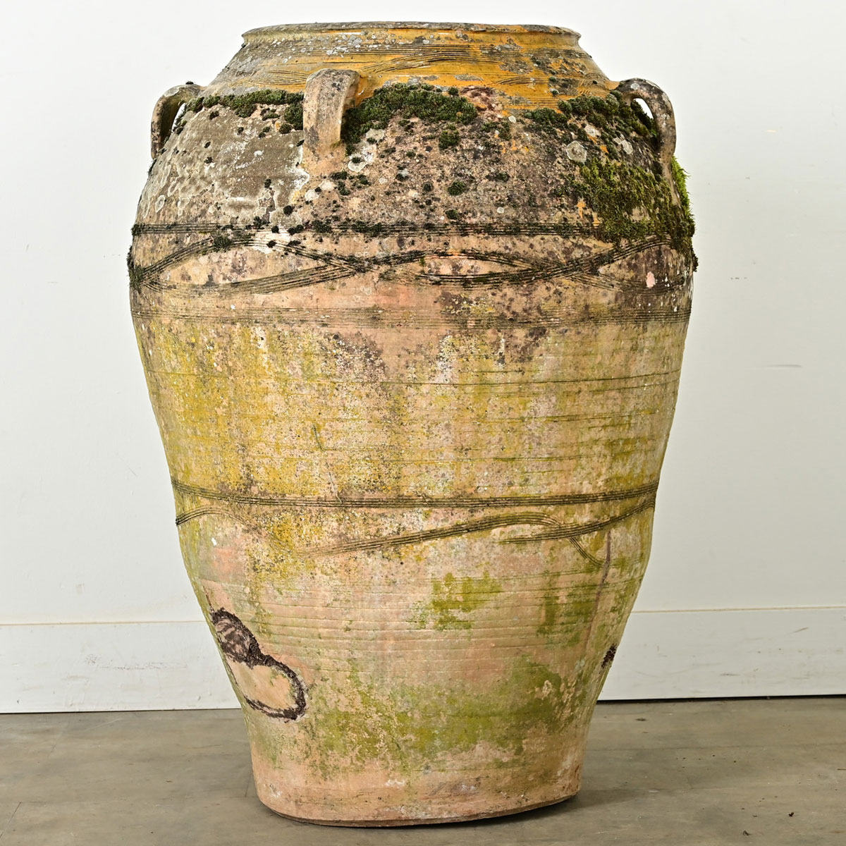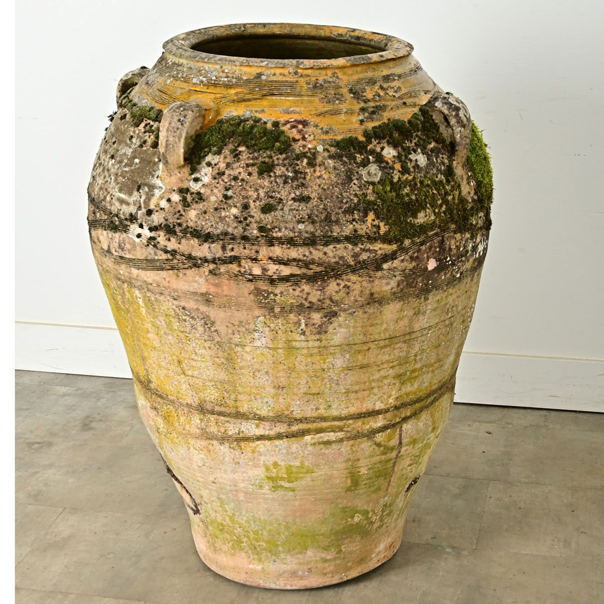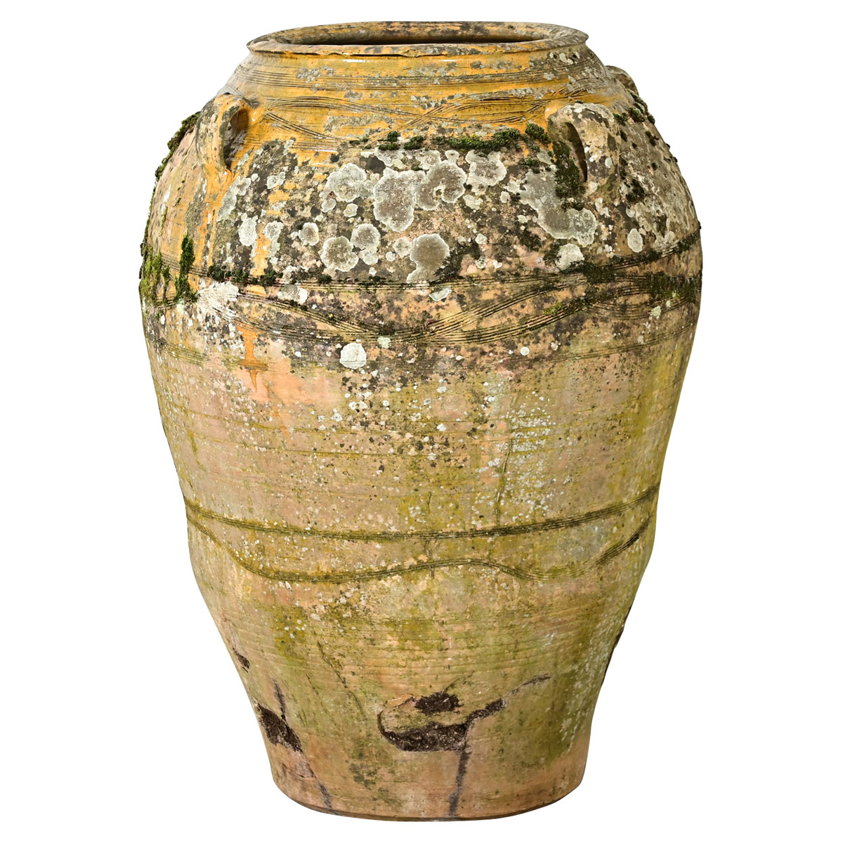 A massive French Provincial terracotta olive oil jar circa 1840. This patinated pot has lots of character both from the hand of the ceramicist in sgraffito patterning and mustard-hued glaze as well as the organic texture of mosses developed over nearly two centuries. Perfect for styling as a sculpture or as a planter in your interior or patio Please view the detailed images for the current condition.