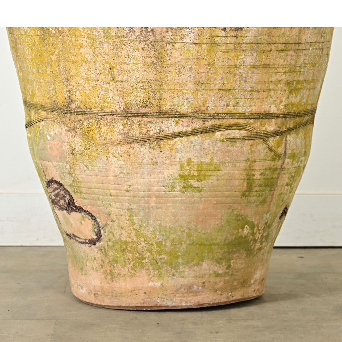 Decorated in artistic sgraffito lines and applied, twisting ribbon this large Spanish olive jar was hand-crafted in the 19th century and now, covered in a wonderful patina that sparks the imagination, it can be enjoyed in the home or garden. The rather bulbous form is ringed with flat bands in between ropes shaped to look like they are twisting around the circumference–a sign of the artisan’s vison to elevate the culinary intention of this humble olive jar to a higher status of studio pottery. Random spots of white and green lichen or moss add to its unique charm. The robust thickness of the fired terracotta makes this antique still inclined to be used indoors and out; there is not a drainage hole in the base which may limit the decorative functions. Please view the detailed images for the current condition as they are an essential part of the description.