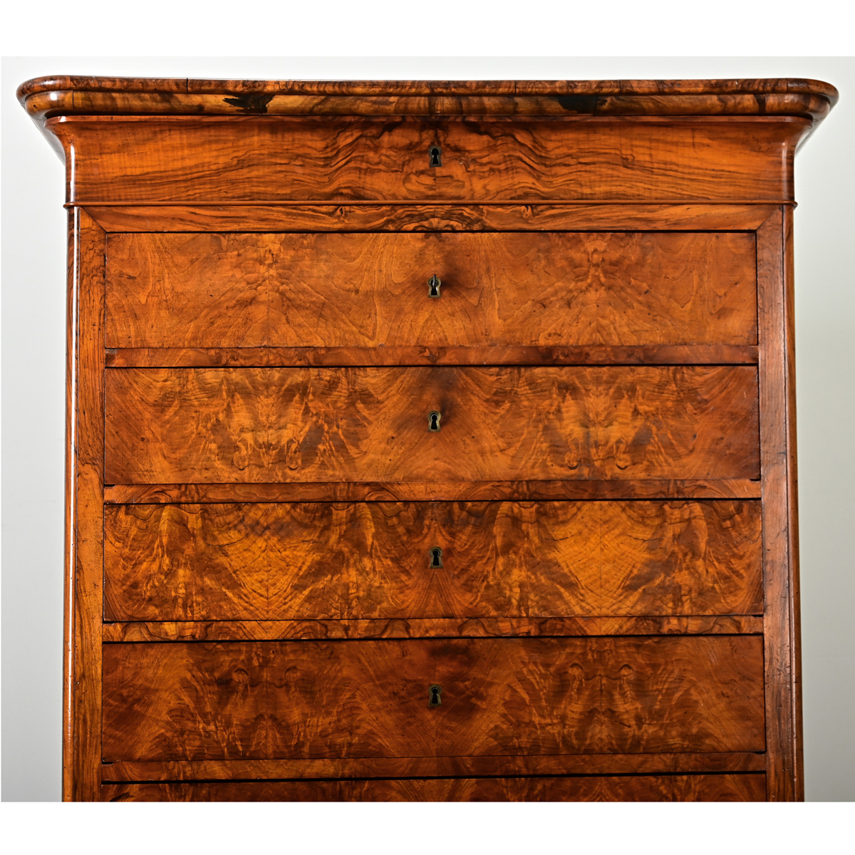 A gorgeous 19th century French walnut chest of drawers–eight drawers to be exact-designed as a classic Louis Philippe commode with spellbinding patterns in the matched wood grain. The top surface is rounded at the corners and wrapped with narrow pieces of the burled walnut to begin the “waterfall” effect that leads the eye from one drawer to the next. A frieze drawer on the very top of the stack no longer has a functioning lock, but is easily opened by gently grabbing the corners. The six drawers in the middle of the case feature stunning bookmatched fronts of radiating grain patterns that feel cohesive and expansive; they also share a key between them to secure the functioning locks. One additional drawer in the base is nearly hidden except for the keyhole that does not lock. Cleaned and polished with a French paste wax. Please view the detailed images to see more of this extraordinary chest. One key included.