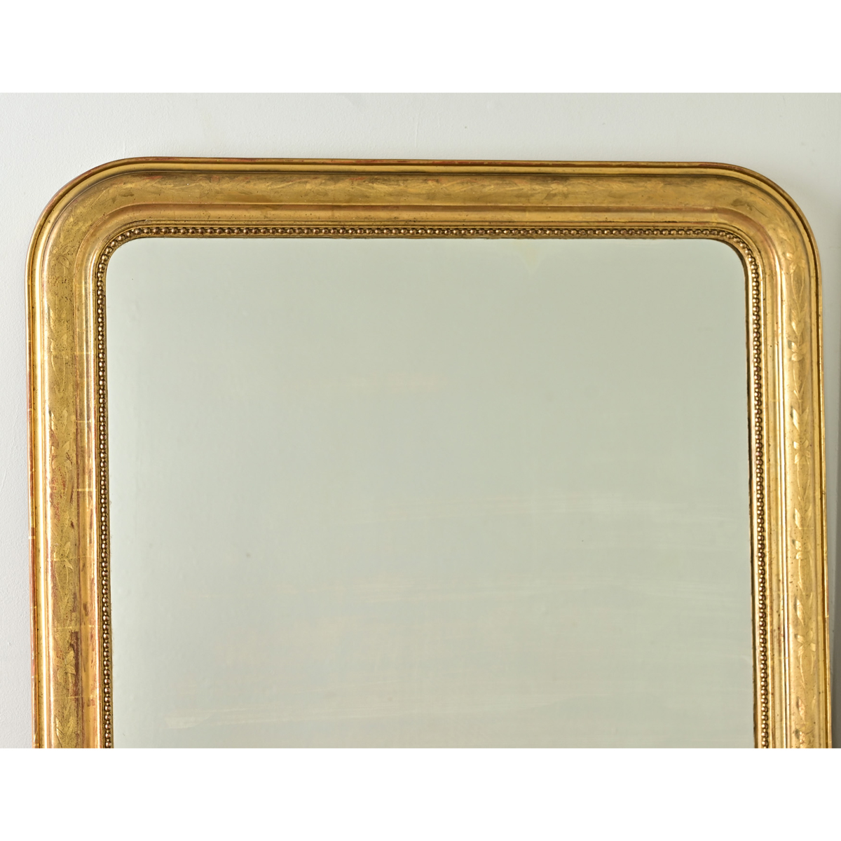 A dazzling French mirror from circa 1840 with the potential to brighten up any room and across many decorating tastes owing to its subtle patterning. Within the slightly beveled molding the understated design of scrolled foliate and heart motif reveals textural differences for definition, depending on the ambient lighting conditions. Red bole peeking through adds further warmth to the luster of gilt. Shown in vertical orientation, the rectangular frame is symmetrical to hang in either direction. Curious lines of intermittent foxing across the original mirror glass plate confirm the age, drawing the viewer into the reflection. Look closer and one can see the faint shimmer of crystals appear in the glass. Please see the detailed images for more.