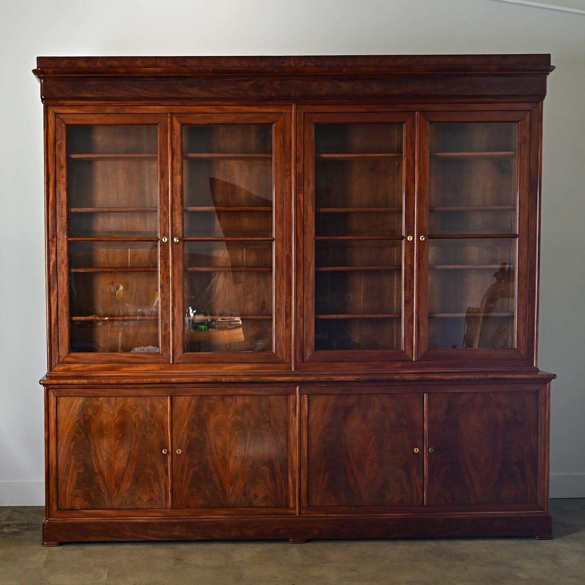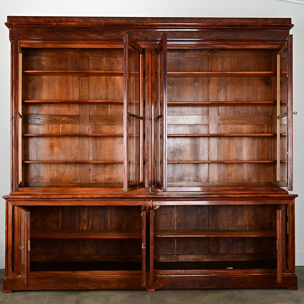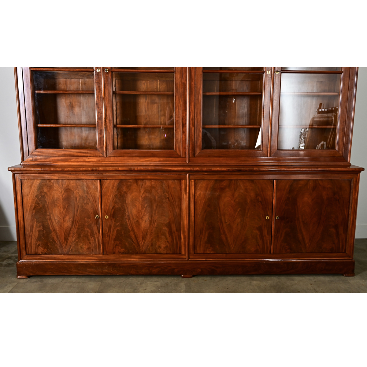 A capacious, 19th century French Louis Philippe style bibliothèque, handcrafted of mahogany with a row of four glass-front doors for displaying treasured books, heirlooms, and other collections in an office or library. The clean, linear quality and rather narrow depth allow this timeless design to fit any number of traditional and transitional decorating tastes. Behind the two pairs of locking doors are eight (8) interior shelves (7 ½” deep) which are adjustable on sawtooth brackets to easily reconfigure as needed. Note that the panes do not exhibit the bubbles and waves to confirm they are original, so are likely 20th century replacements. Below are a series of four, bookmatched doors enclosing the lower cabinet that follows the order of the upper body: each pair of doors work in tandem by a lock & key to enclose the (left and right) cabinets. Both compartments have a stationary shelf, approximately 15” deep. This striking storage piece has been cleaned and polished with a French paste wax to bring out the rich grain pattern and historic patina, ready for your interior. Please view the detailed images. Four keys included.