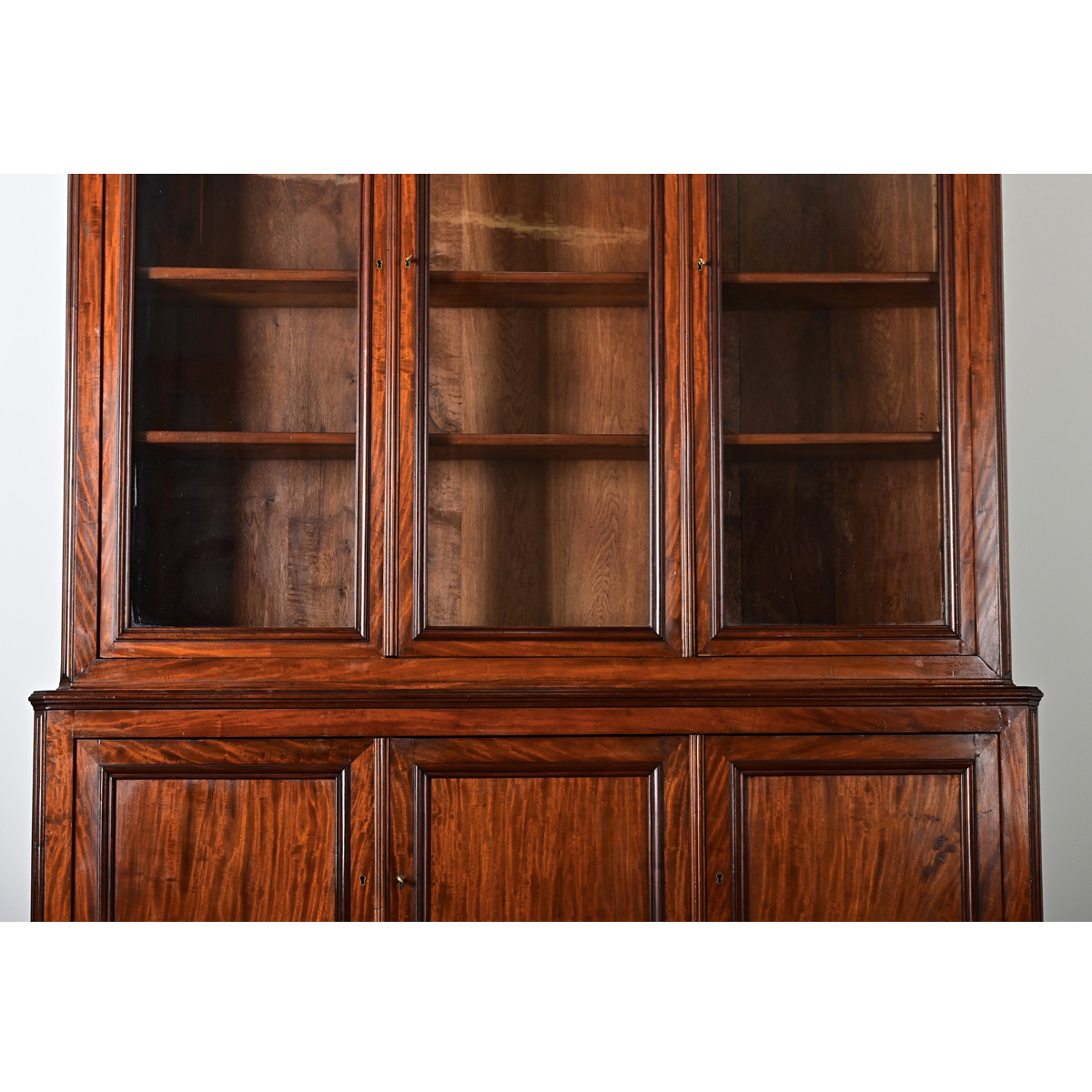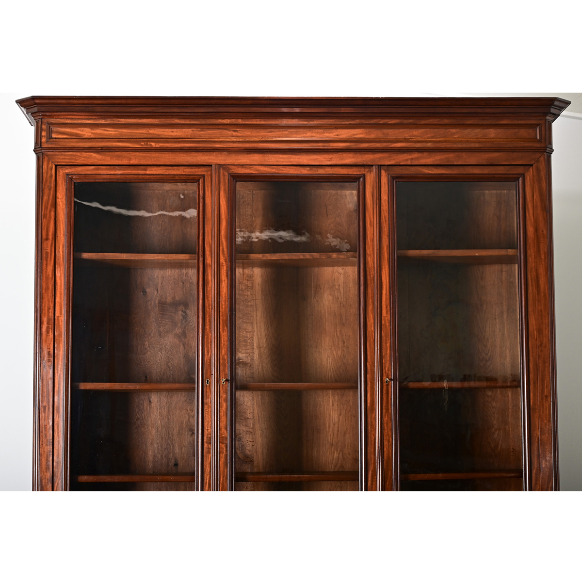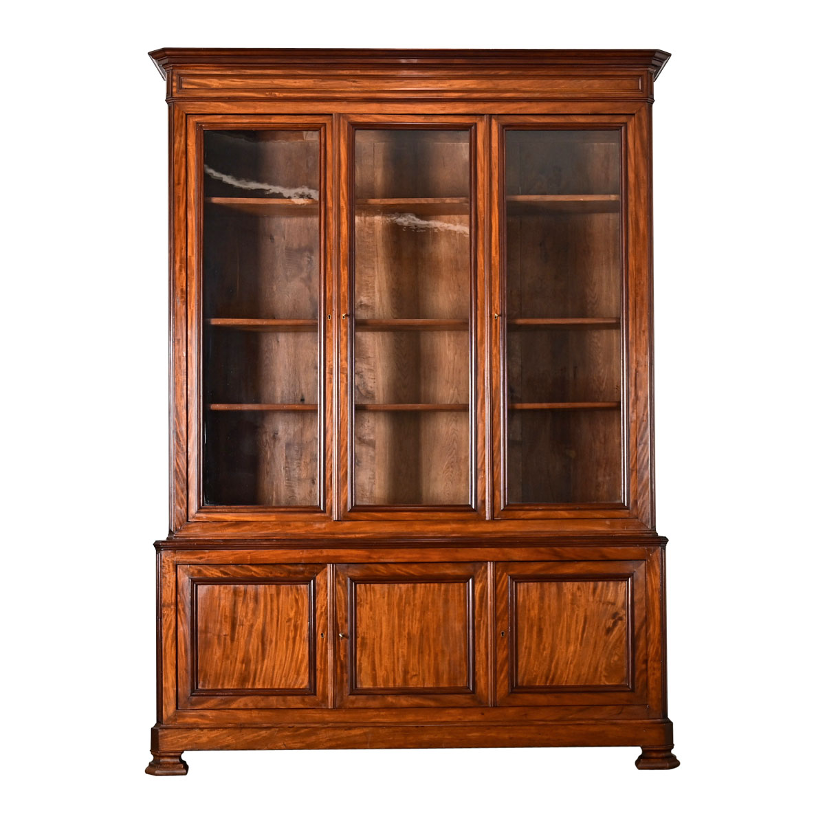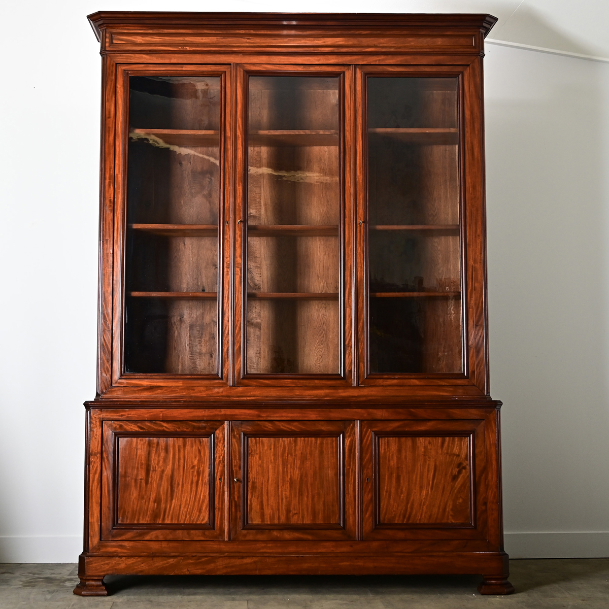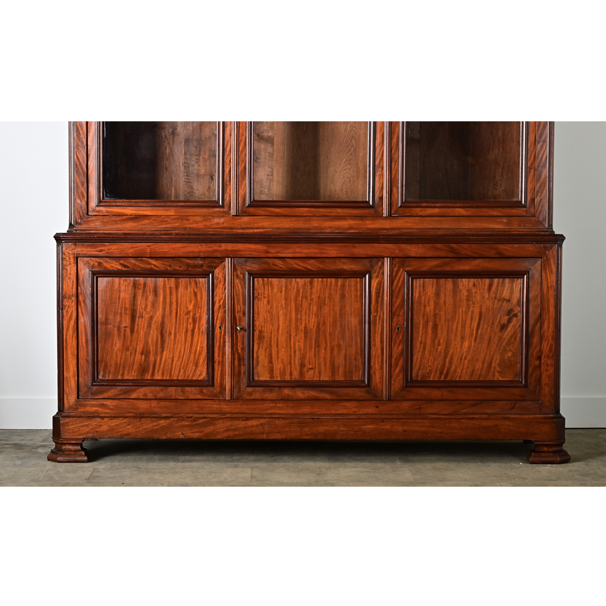A towering, 19th century French Louis Philippe style bibliothèque or bookcase, handcrafted of mahogany with three glass-front doors for displaying treasured books, heirlooms, or trophies in an office or library. The clean, straight lines with angled corners allow this timeless design to fit any number of traditional and transitional decorating tastes. Original glass panes are texturized by waves and small bubbles that complement the animated striations in the mahogany wood grain. Behind the locking doors are six interior shelves (11 ½” deep) that are adjustable on sawtooth brackets to easily reconfigure as needed. The left and center doors function together, representing one, wide vitrine whereas the right side is separate. Below are a series of three doors enclosing the lower cabinet that follow the order of the upper body: left and center doors work in tandem by a lock & key while the right side is separate. Both compartments have an adjustable shelf, approximately 17” deep. Note the lower right door does not have a lock, needing the shared key to pull open. This striking storage piece has been cleaned and polished with a French paste wax to bring out the rich grain pattern and historic patina, ready for your interior. There is one small crack in the glass of the left-side upper cabinet, bottom left corner, which is mostly concealed by the frame holding the pane securely in place. Please view the detailed images. Three keys included.