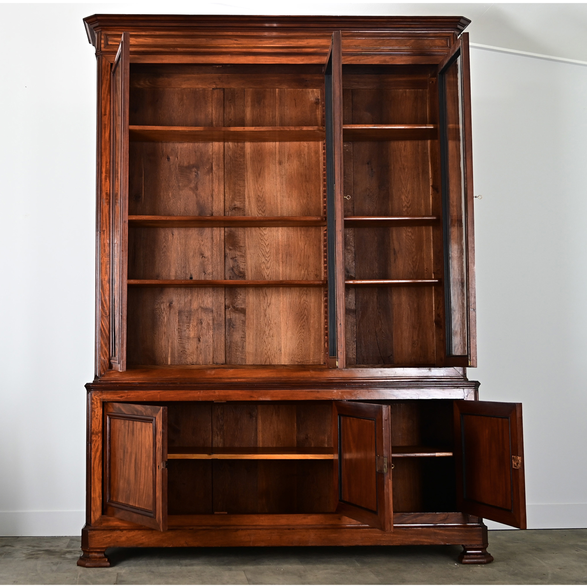 A capacious, 19th century French Louis Philippe style bibliothèque, handcrafted of mahogany with a row of four glass-front doors for displaying treasured books, heirlooms, and other collections in an office or library. The clean, linear quality and rather narrow depth allow this timeless design to fit any number of traditional and transitional decorating tastes. Behind the two pairs of locking doors are eight (8) interior shelves (7 ½” deep) which are adjustable on sawtooth brackets to easily reconfigure as needed. Note that the panes do not exhibit the bubbles and waves to confirm they are original, so are likely 20th century replacements. Below are a series of four, bookmatched doors enclosing the lower cabinet that follows the order of the upper body: each pair of doors work in tandem by a lock & key to enclose the (left and right) cabinets. Both compartments have a stationary shelf, approximately 15” deep. This striking storage piece has been cleaned and polished with a French paste wax to bring out the rich grain pattern and historic patina, ready for your interior. Please view the detailed images. Four keys included.