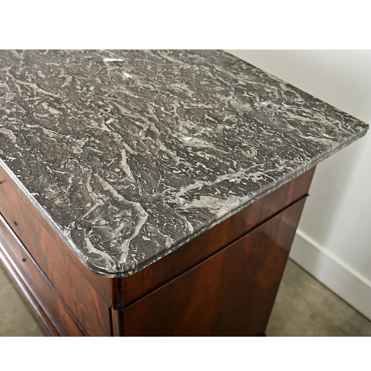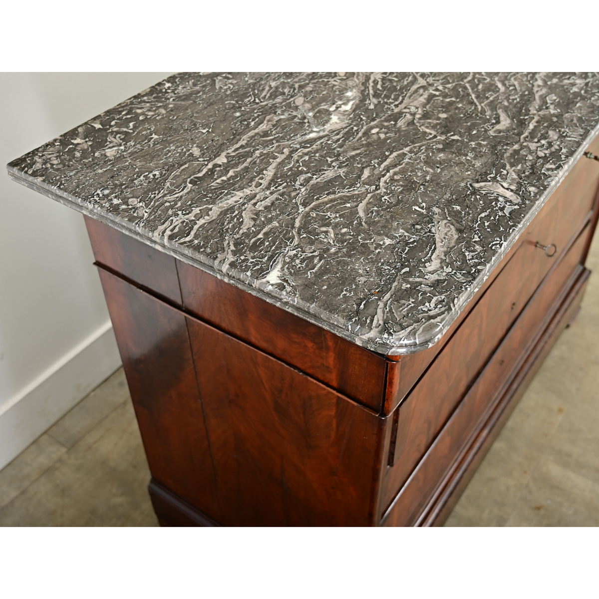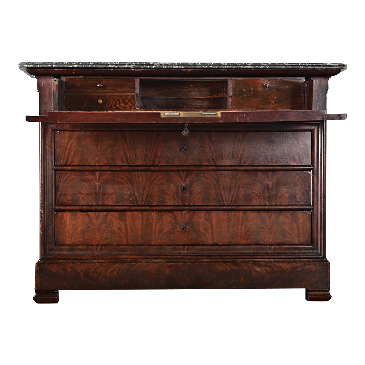 A gorgeous 19th century French mahogany secretary style desk, designed as a classic Louis Philippe commode incorporating the work surface and storage compartments into the top “drawer” above four actual drawers. The Saint Anne marble slab on top shows mesmerizing movement in the swirls of black and gray stone, finished along the perimeter with a low groove. Behind a working lock (and key) is the flap door which becomes the writing desk inlaid with worn black leather outlined in gold tooling. The workspace is fitted with pigeonhole compartments along the back plus two small pen drawers to the left and a locking drawer to the right using its own unique key. In the chest below are three wide drawers all with working locks that share one key between them. This unique commode has one more surprise: a shallow, hidden drawer at the base! Angular block feet, a signature of the Louis Philippe style, lift the case from the floor. Please view the detailed images to see more of this innovative desk-chest of drawers. Three keys included.