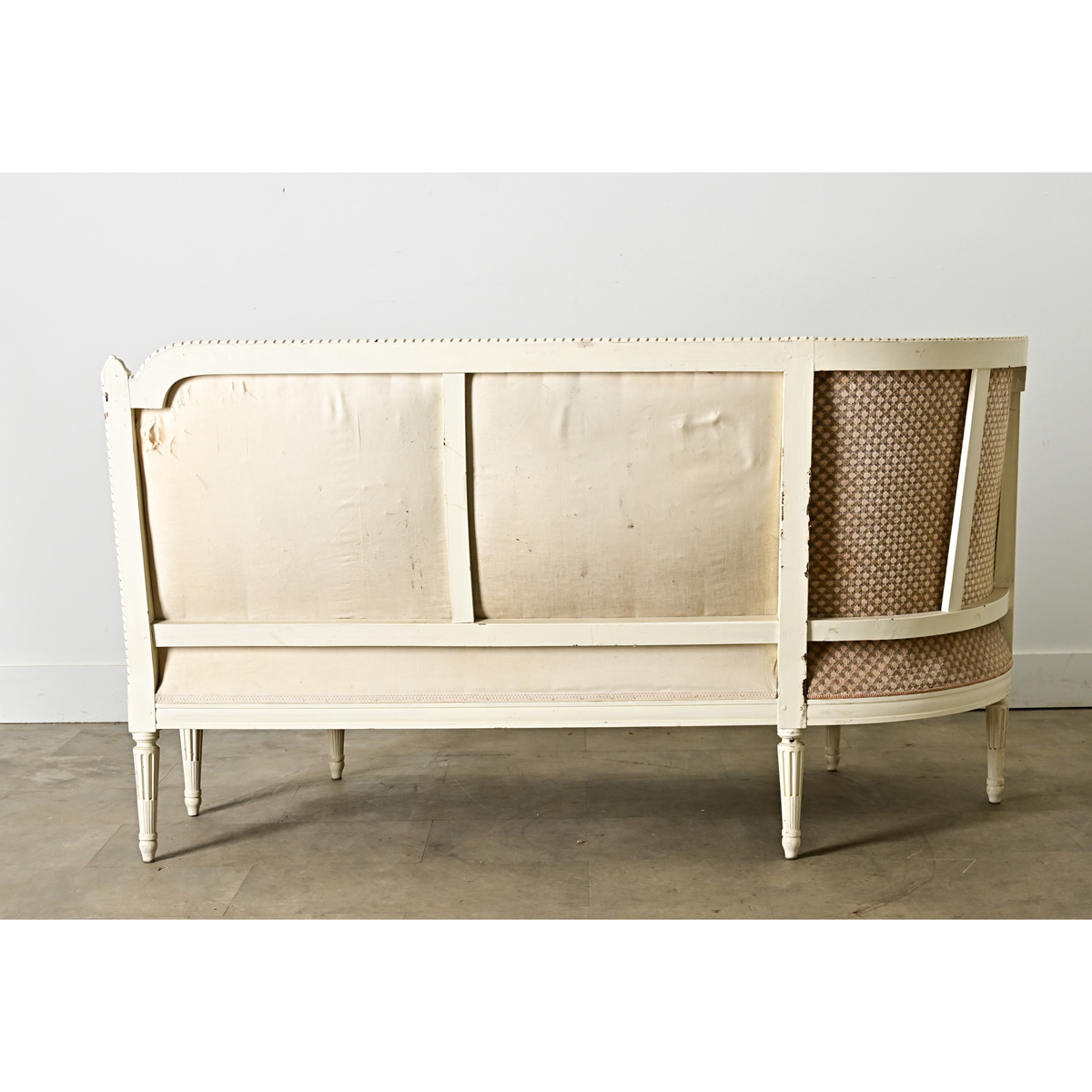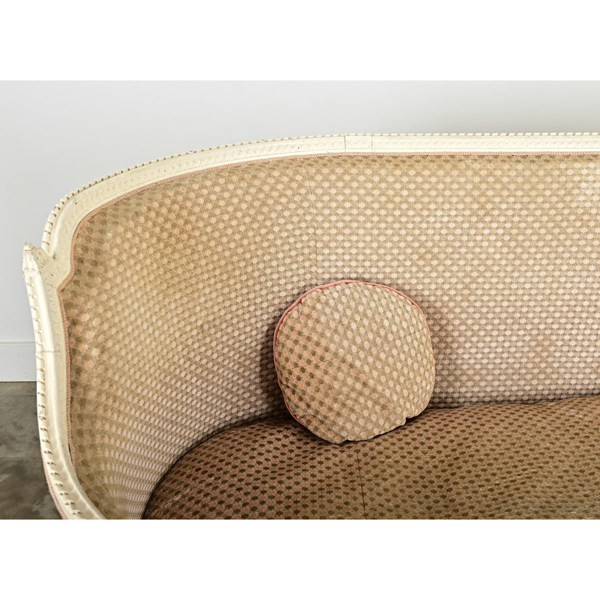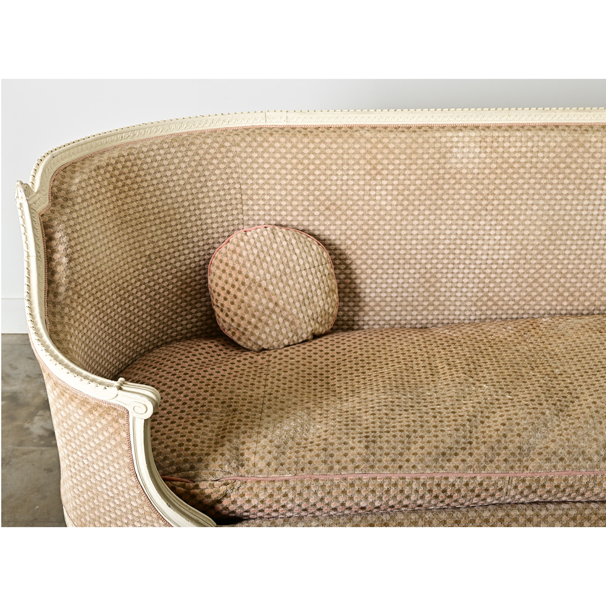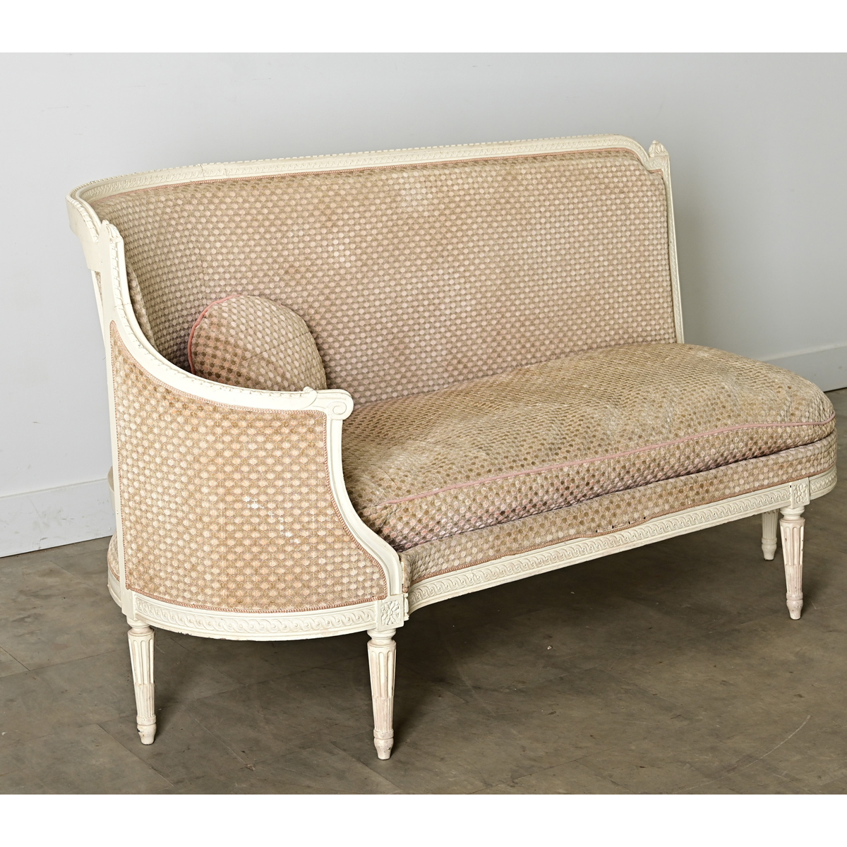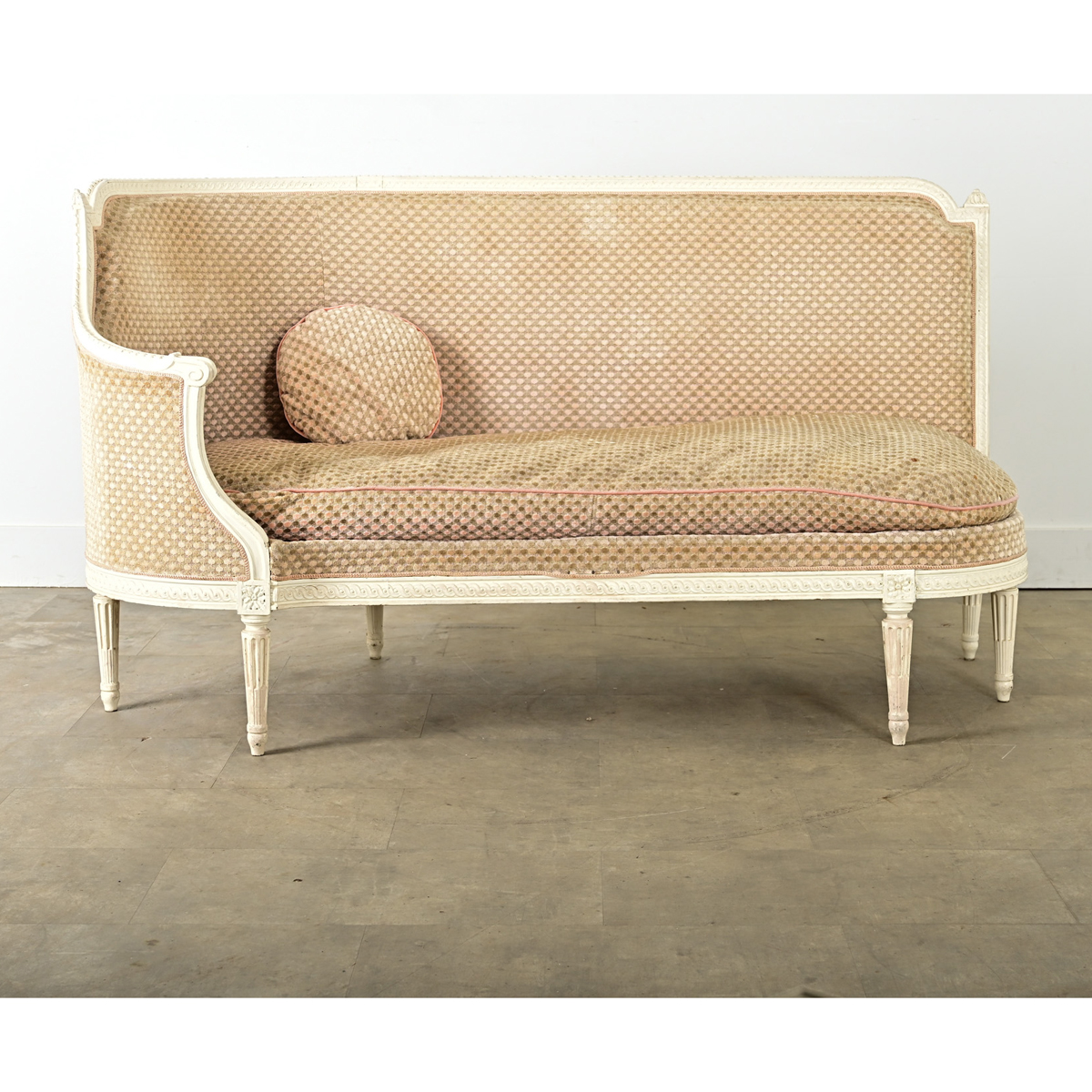A timeless banquette (or small occasional sofa) in the Louis XVI taste dating from the 19th century. Its carved and painted wood frame shelters the upholstered interior of single bench cushion, tight seatback, and a single round toss cushion all dressed in a (worn, with some staining) blush-tone dotted velvet. In classic 18th century fashion the straight top rail across the back makes a clean silhouette that is open and inviting, before sloping down to become the left-facing corner, leaving the right side open to use this like a day bed or “fainting couch”. Louis XVI legs of tapering silhouette and fluted carvings elevate the piece from the floor. The effect is a sculptural statement to delight in a bedroom, living space, or as a banquette for a kitchen dining nook–becoming one’s favorite place to lounge and relax. Please view the detailed images to see more of this comfortable and inviting settee. We recommend reupsholstering with a new cushion and fabric.