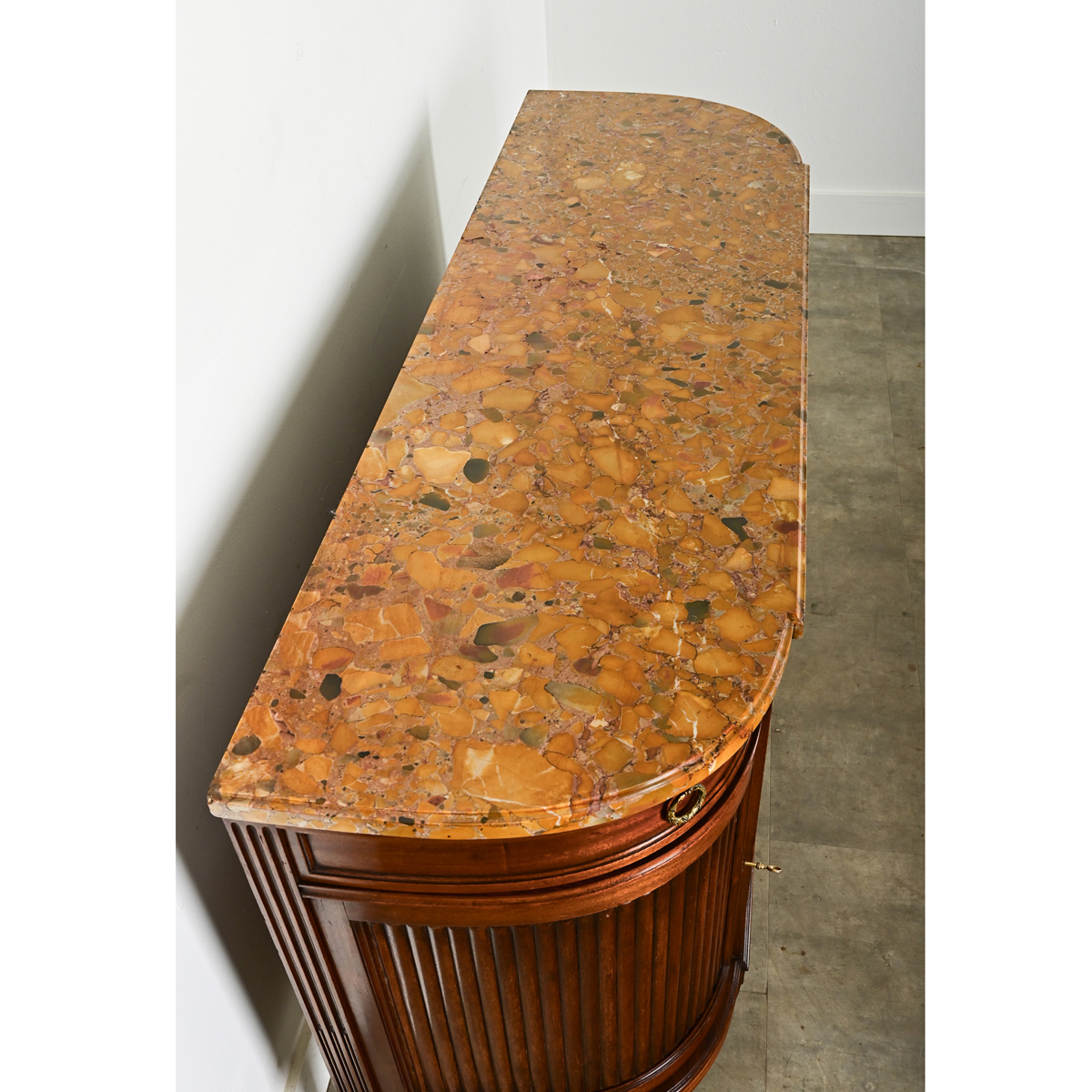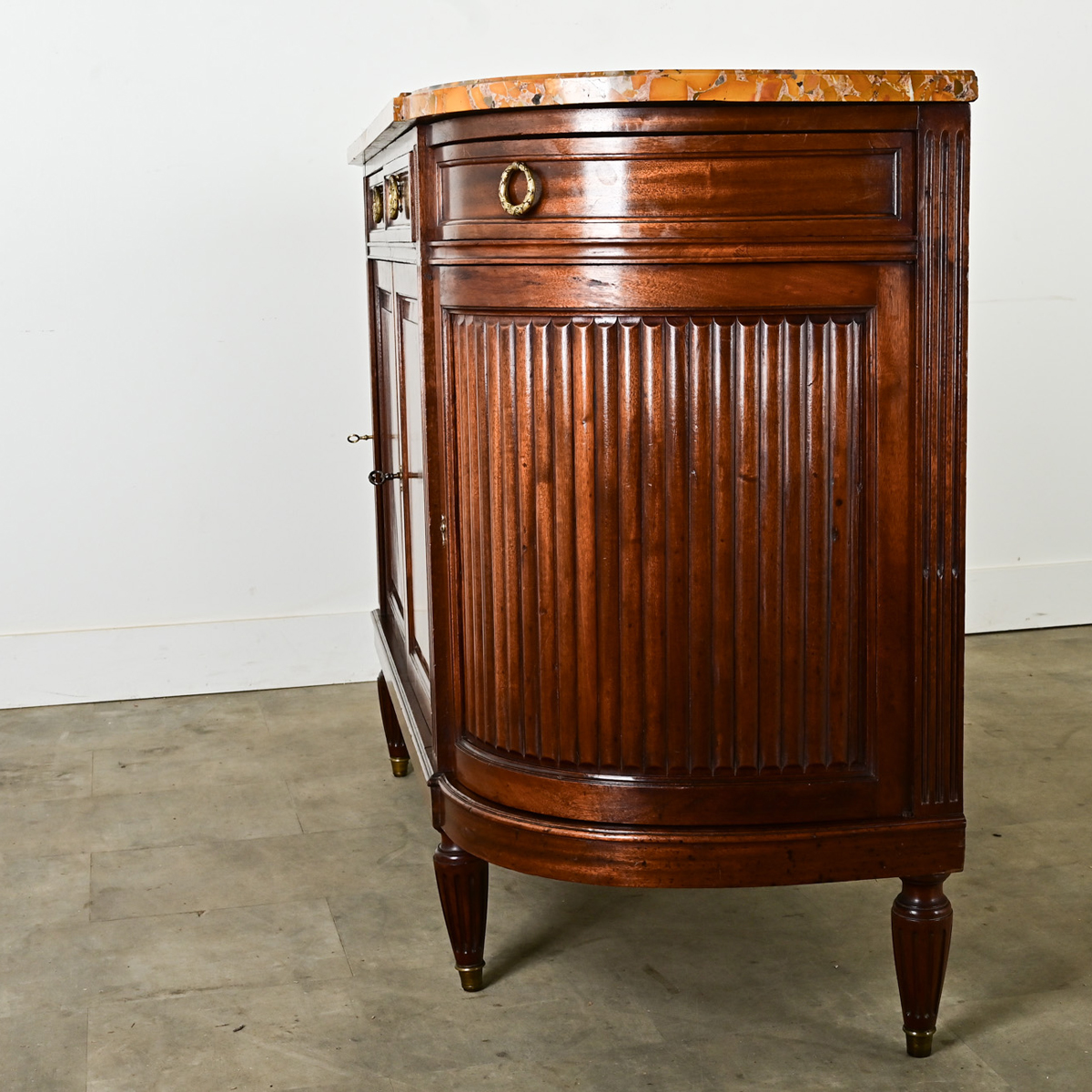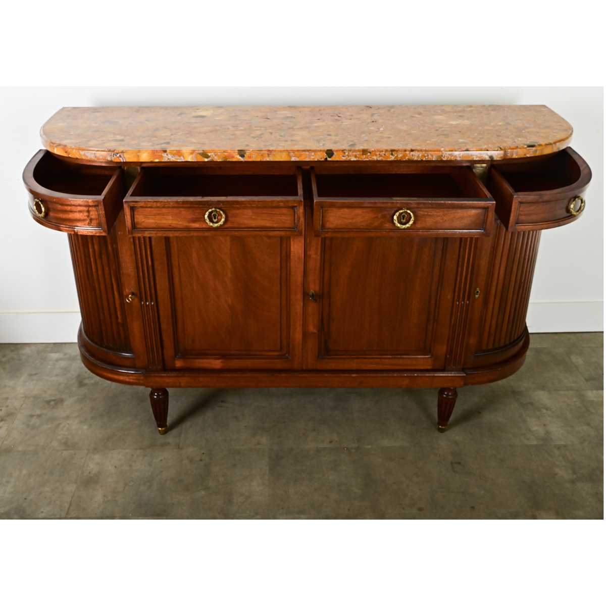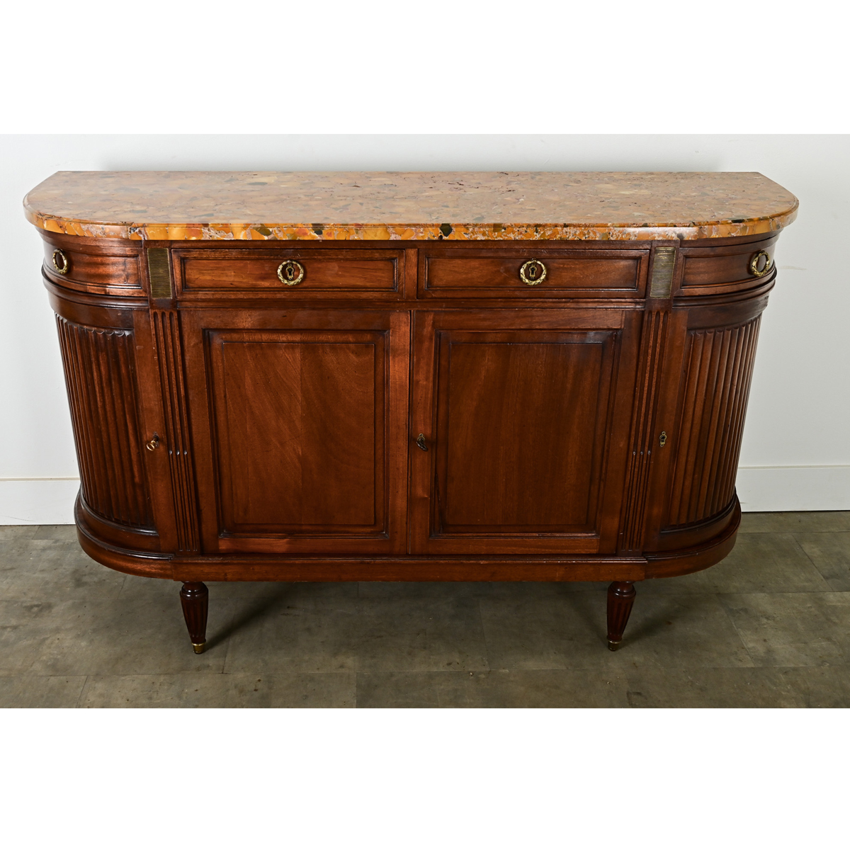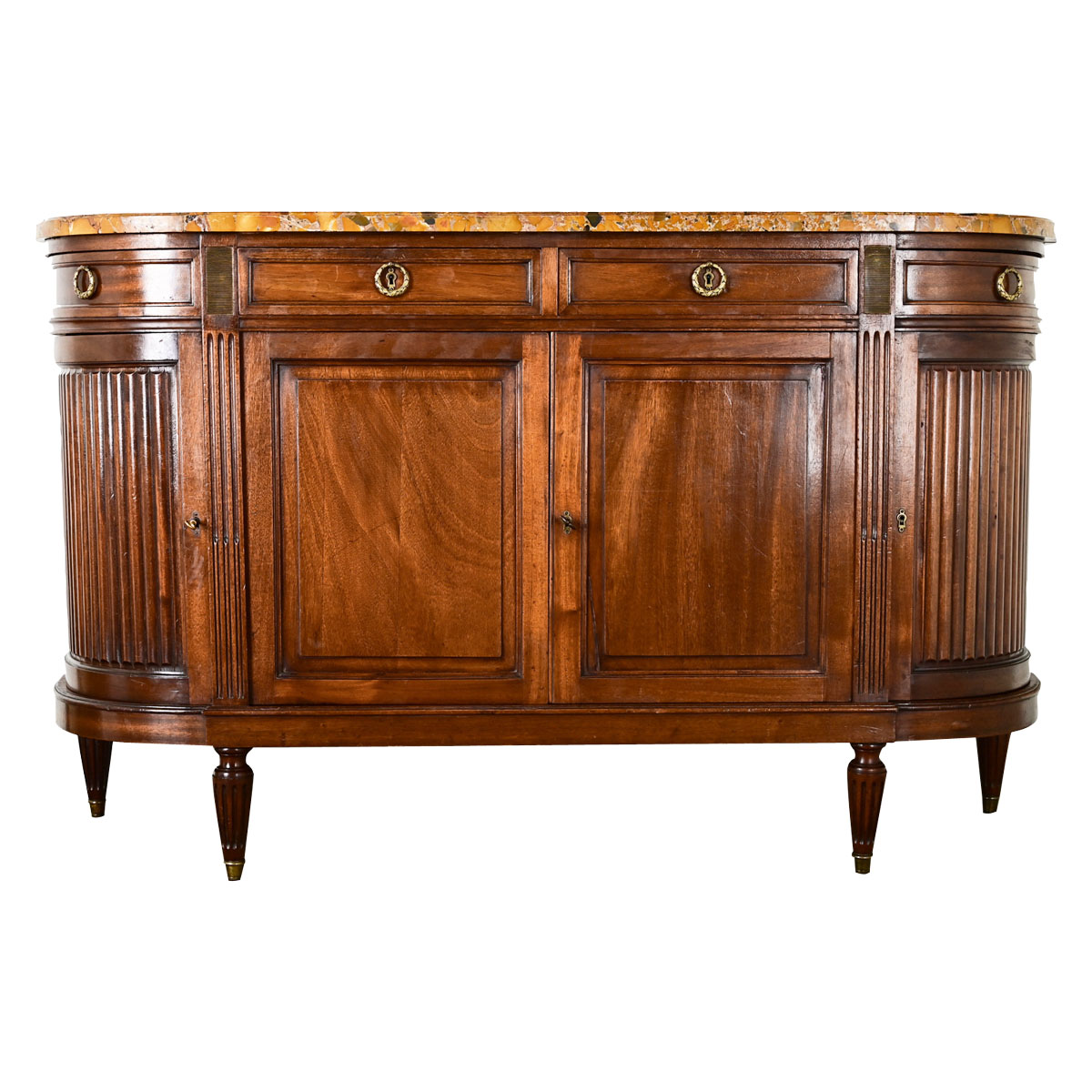 Stunning mahogany enfilade in the style of Louis XVI, with classic demilune shape. The top surface is a captivating slab of Brèche d’Alep marble in a range of ochre tones and flashes of green. Brass ring pull hardware in Neoclassic laurel wreath design opens the four drawers of the frieze. Within the main body, the storage capabilities are quite generous behind the four doors, which retain their working locks and keys. Curved doors to the left and right feature tambour-style, reeded panels. Three working locks on the doors share two keys. Please view all of the detailed images. Fixed interior shelf: 17” D