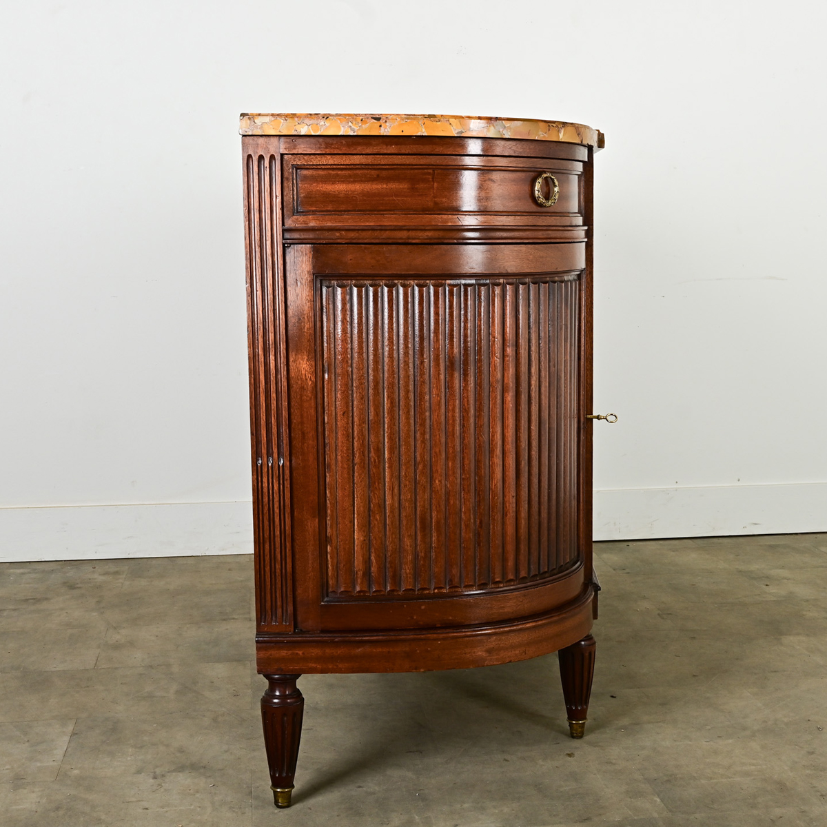 A statement piece for a dining room or foyer, this 19th century Louis XVI style enfilade demonstrates refined taste and luxury in any scenario. The original, white marble slab conforms to the breakfront of the demilune shape, protruding over the middle section before sloping back toward the wall, the stone traced with thin ribbons of gray veining. Two rectangular drawers in the center use elegantly curved drop handles to open; the right drawer is organized into five sections while the left drawer is undivided. Surprisingly, the curved left and right corners aren’t fixed but fully functioning drawers as well, swinging out by their ring pulls at a 45 degree angle to the case. In the main body, four doors with stunning mahogany fronts enclose the various storage compartments: quarter-round cabinets to the sides offering two small shelves each (sharing a key between them) and a wide cabinet with single shelf (20 ½” deep) behind the middle doors right sharing one key between them. Fluted pilasters transition into conical feet elevating the piece from the floor which creates a sense of lightness against the grand scale. Cleaned and tightened, polished with a French paste wax this antique buffet is ready for your interior. Please view the detailed images to see more. Two keys included.