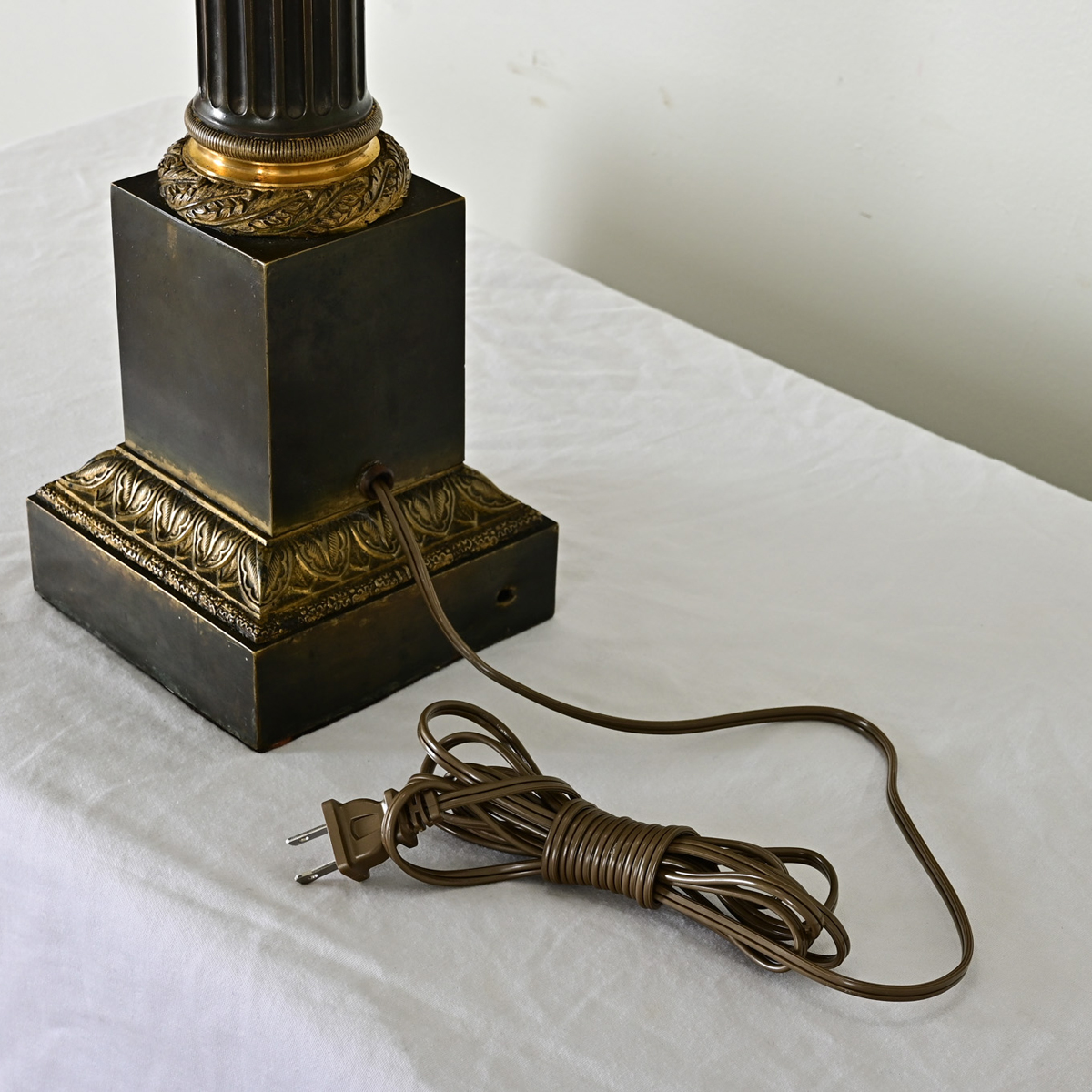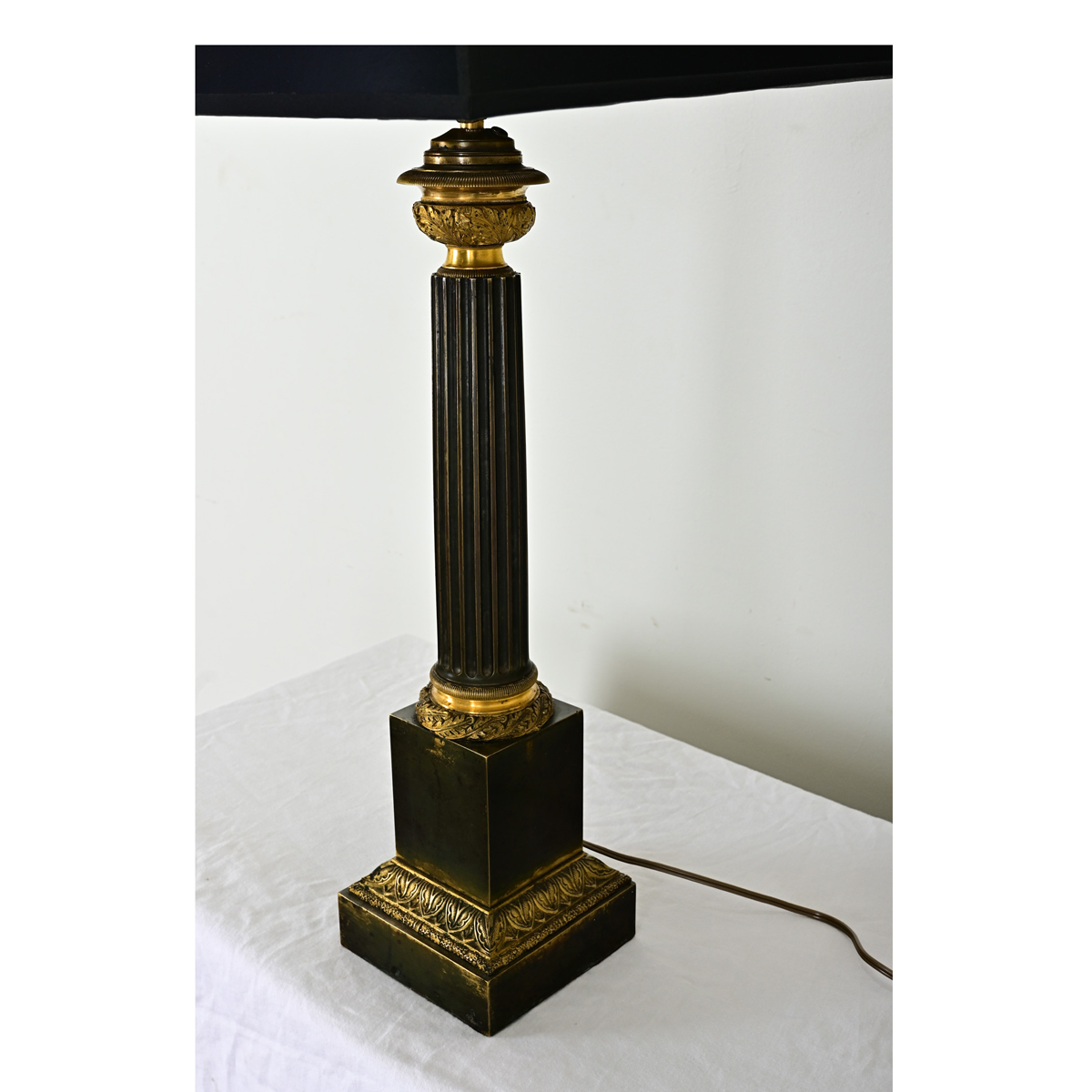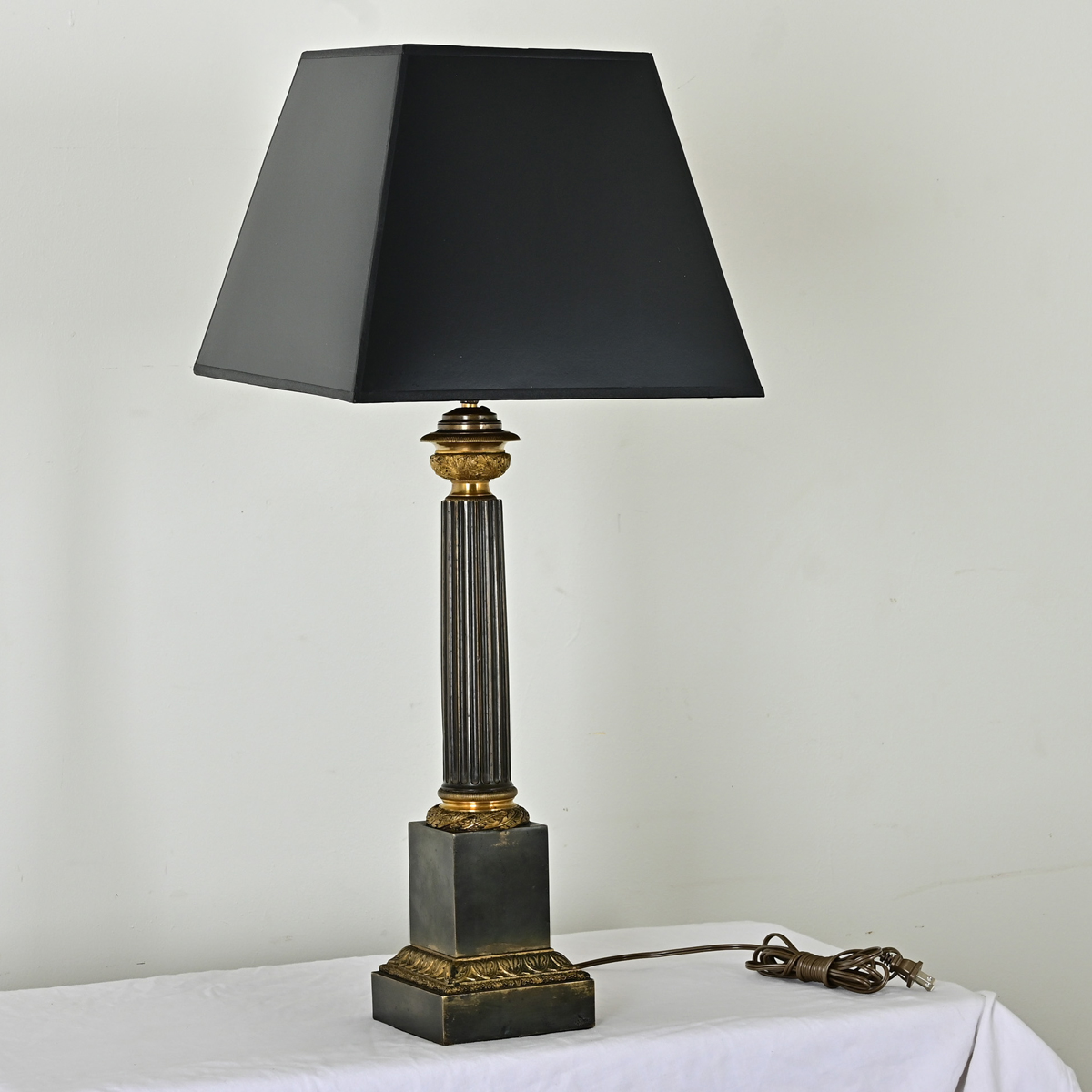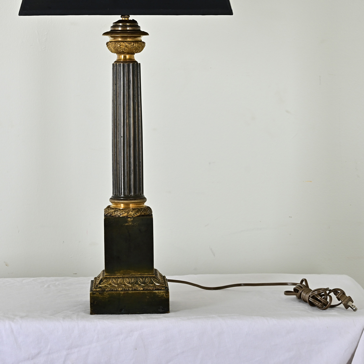 Amazing French 19th century Neoclassical-theme table lamp, recently converted from gas to electric. The new lampshade features a black exterior and silver, tortoiseshell pattern on the interior. The dark metal lamp body is decorated like a miniature Corinthian column: fluted to crisp ridges around the circumference, with brass capital and base densely populated with foliate motifs. A squared lamp base corresponds to the shade above as a very cohesive ensemble. Cleaned and wired for US electrical using UL listed parts this lamp is ready to be placed in your interior. View the detailed images.