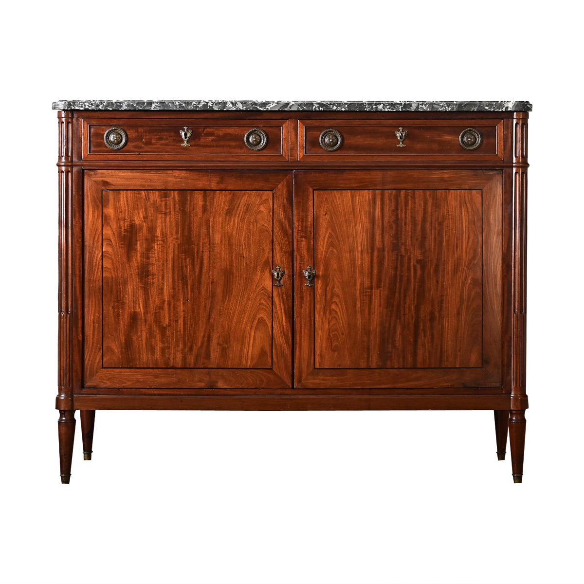 An extraordinary 19th century French mahogany and marble buffet, Louis XVI in style, to take pride of place nearly anywhere in the home. The slab of Saint Anne marble exhibits the signature ribbons of light gray veining over the black stone; shaped with turreted corners at the front and flange at the back overhanging the pilasters. Two paneled drawers in the frieze open by ring pulls with small laurel and acanthus leaf decoration, flanking the urn-shaped escutcheons over working locks, sharing one key between them. In the case below, the two cabinet doors exhibit fine grain patterns and lustre, framed with a tiny pinstripe of ebonized marquetry to suggest paneling. The doors open in tandem from the right-side lock, sporting the same urn-shaped escutcheons as above, using the key as a pull. Inside is an adjustable shelf, 15” deep for generous storage in a dining room or living room. Cleaned, tightened, and polished with a French paste wax–ready for your interior. Please view the detailed images to see the wonderful features and antique condition of this timeless storage piece. (2) keys included.