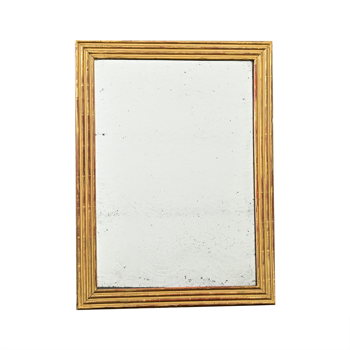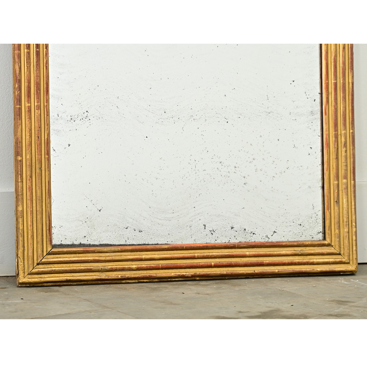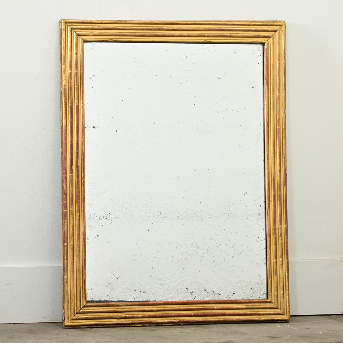 Wide, reeded molding around this 19th century French gilt wall mirror is an ideal surface area to reflect the lustre of gold leaf, now patinated with a fine craquelure texture. Symmetrical for mounting in either direction, the rectangular mirror would look sharp in any room; original mirror glass exhibits a fine haze of foxing, drawing the viewer in for a closer look. Please view the detailed images to see the current condition.