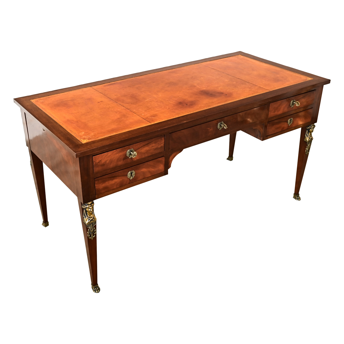 Fabulous extendible bureau plat, or writing desk from the late 19th century in the French Empire style, made of mahogany among other luxurious materials. Rich, caramel-colored leather covering the main desk surface shows natural patina of darkened areas and some scratching, framed by a border of ornate gold tooling in stylized acanthus. Hidden leaves on the sides use the same leather and gold tooling, extending outward to add plenty of extra space for working and writing. The case offers five drawers: a wide middle drawer with working lock and key, flanked by two pairs of smaller drawers that also have working locks and shared key between each pair. Keys are forged in the same acanthus profile as the tooling on the leather for a subtle, unified look that communicates the refined aesthetic of the period. Each front leg is mounted with a sculptural caryatid bust in gilt bronze to underscore the Neoclassical influences seen in this piece. The squared, tapering legs end at the floor in gilt bronze claw feet. In a drawing room or office, this desk will inspire you every day. Cleaned, tightened, and polished with a French paste wax. Please view the detailed images to see the current condition.