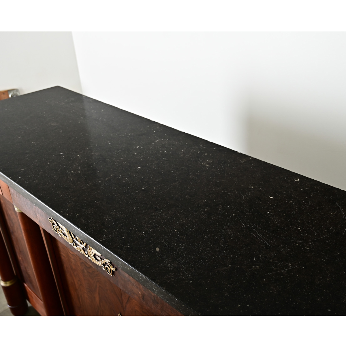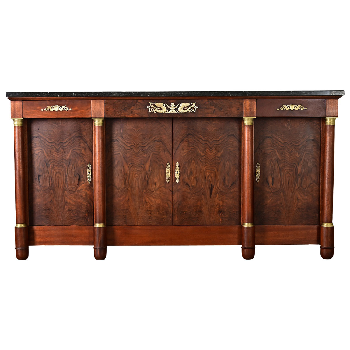 A tremendous 19th century French enfilade of classic Empire styling, made of richly figured bookmatched mahogany adorned with gilt bronze accents. The original marble top of dark stone is speckled with tiny fossils underneath the expected scratches from time and use. In the overhanging frieze below, a row of three drawers (free of hardware) are decorated with gilt bronze appliqués featuring a pair of resplendent swans. Three storage compartments in the case are enclosed by a pair of double doors at center and two smaller doors on the sides wrapped in bookmatched veneer of abstract, swirling grain patterns that invite comparison to a Rorschach test. Four, thick columns across the front–detached from the case–are mounted with gilt bronze capitals and bases that further underscore the Empire period appreciation for Greco-Roman architecture and decorative arts. When open, the doors expose fixed shelves (14 ¾” deep) with abundant space for storage in a dining room or foyer. Keyholes for the working locks are covered in elongated anthemion escutcheons with one key included. Cleaned, tightened, refinished, and polished with a French paste wax this showstopping storage piece is ready for your interior. Please view the detailed images to see more.