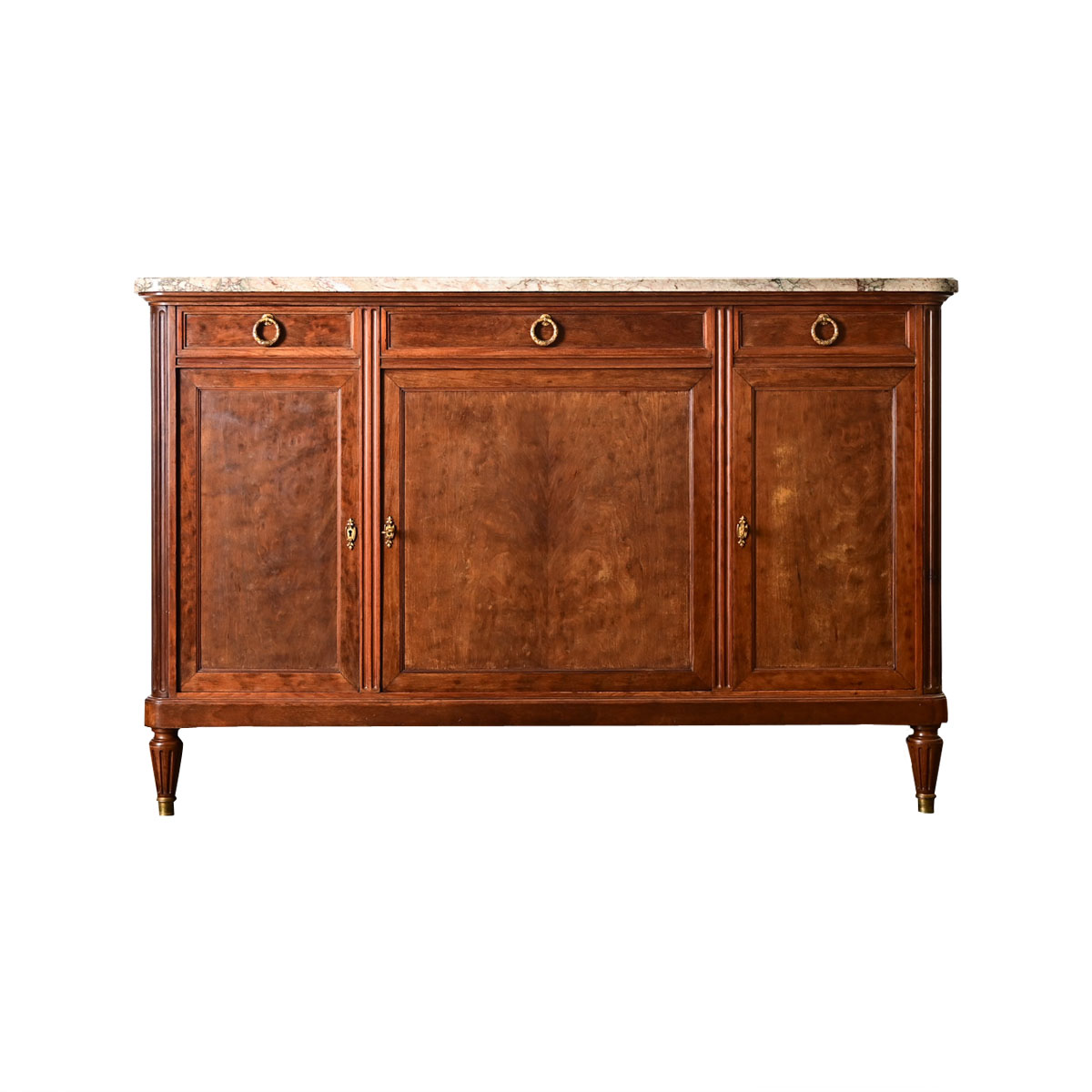 A unique, 19th century Louis XVI style mahogany enfilade attributed to Haentges Freres, Paris, in a variety of gorgeous materials to enchant in a dining room or other living space with color and patina. The top surface of brecciated marble features patches of white and burgundy surrounded by ribbons of green veining and is finished with rounded front corners above fluted pilasters. A row of three drawers across the frieze use gilt bronze ring pulls in the shape of laurel wreaths. Paneled doors of an extraordinary grain pattern retain working locks to enclose the storage compartment: one wide door at the center shares a key with the right side, while the left door uses its own special key. Inside, the undivided cabinet offers a long, fixed shelf, 19 ½” deep. Fluted pilasters on the corners terminate as conical feet elevating the piece from the floor. Cleaned, tightened, and polished with French paste wax this stunning antique enfilade is ready for your interior. Please view the detailed images to see the current condition. The original stamp from the maker is visible on the backside.