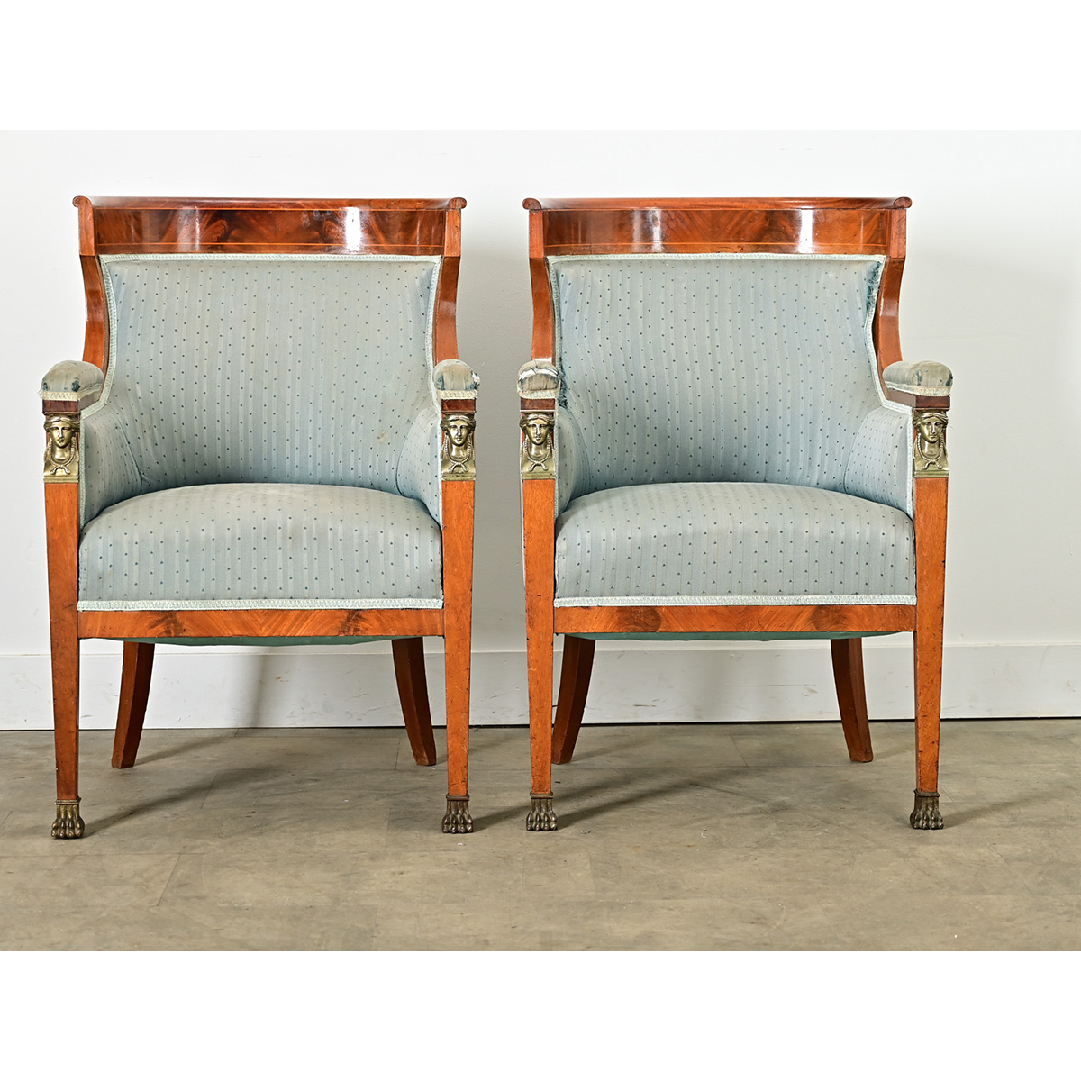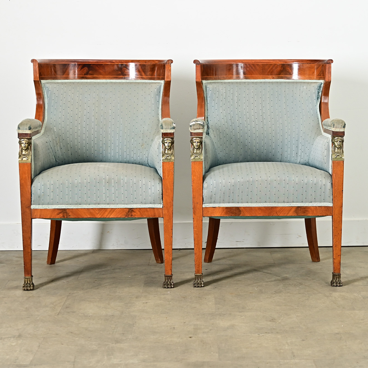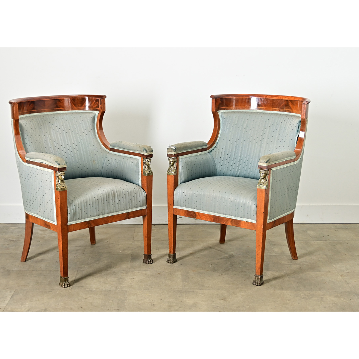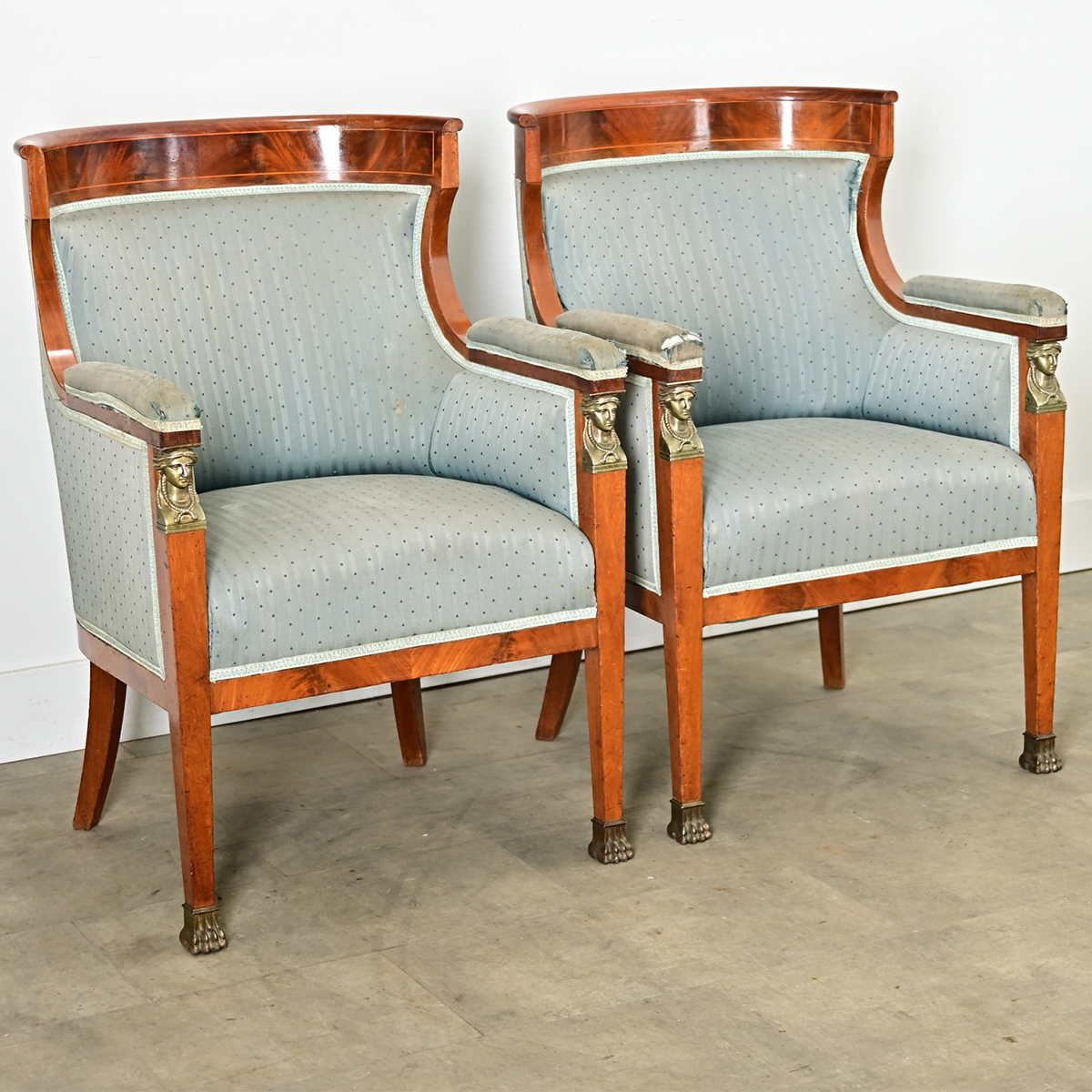 This stunning pair of French Empire style mahogany barrel (or tub) armchairs are 19th century, reflecting the period’s extravagance and passion for noble materials in every aspect of the domestic interior. Made from richly figured mahogany wood framing the upholstery both inside and out, the armchairs feature deep curves at the handrail with subtle pinstripe inlay, sloping down to padded arms resting on bronze caryatid busts at the arm terminals. The front legs are given an extra touch of grandeur with lion paws at the floor and short saber legs at the rear. The original stuffing of natural fibers (likely horsehair) is intact however the current upholstery fabric has areas of discoloration and the manchette arms are worn through. Nevertheless, these French Empire lounge chairs exemplify luxury and timeless design sense that continues to inspire in today’s interiors. Please view the detailed images to see the current condition. Sold as a pair.