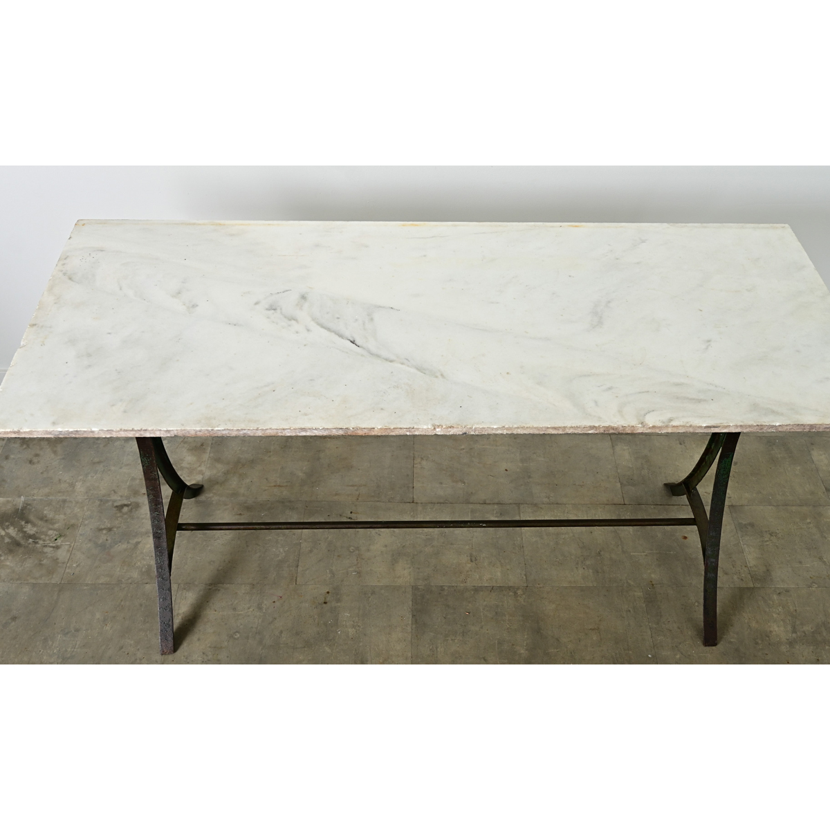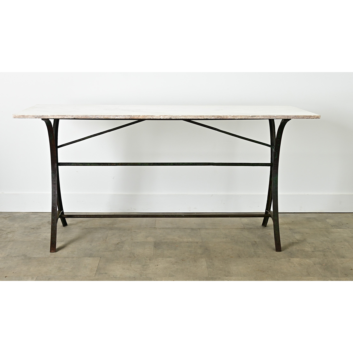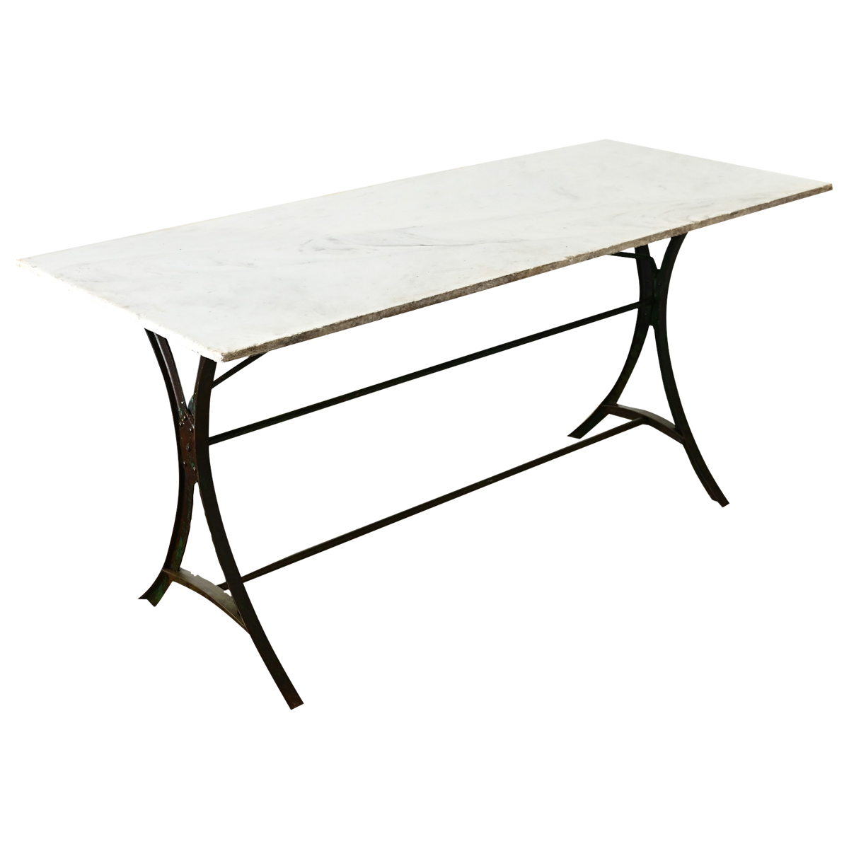An exceptional French marble-topped bakery or garden table with industrial details in the wrought and cast iron base reflecting the late 19th century time period. The white marble slab has a patinated and etched surface, consistent with age and type of use, over light gray veining. Two iron supports in an hourglass silhouette are enhanced with turquoise verdigris and hammered texture, joined by multiple cast iron stretcher rods ensuring stability for a multitude of uses. The unusual height of this table would make for a lovely console, in a kitchen as an unexpected island, or on the patio to recreate that Parisian boulangerie style at home. Please view the detailed images to see more.